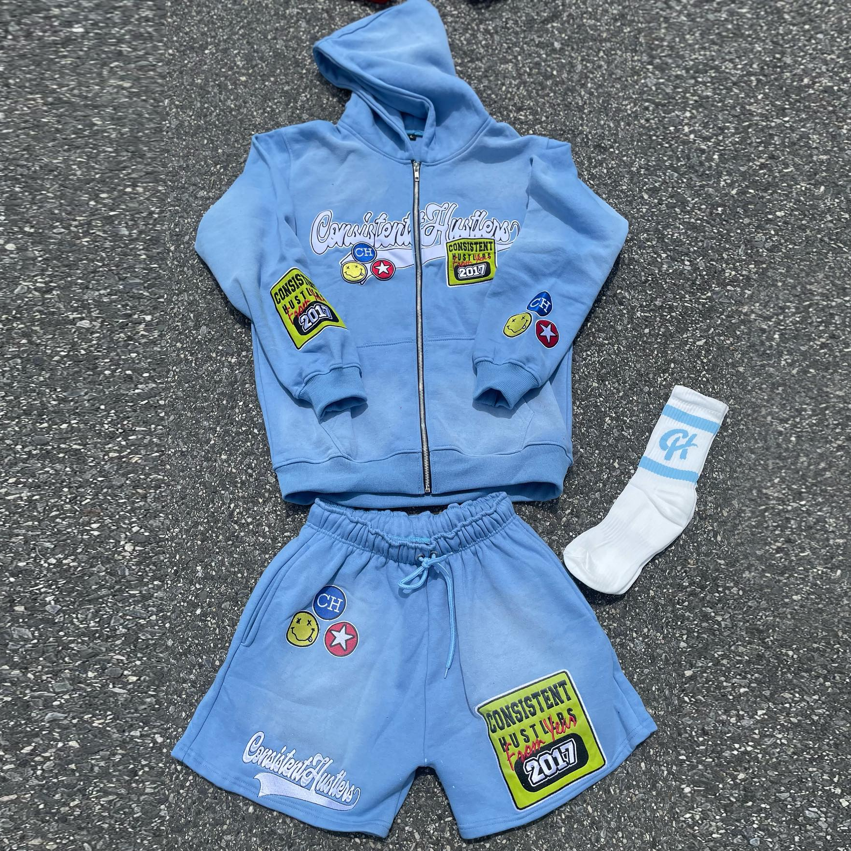Street Style Smiley Shoulder Zipper Sweatshirt Set