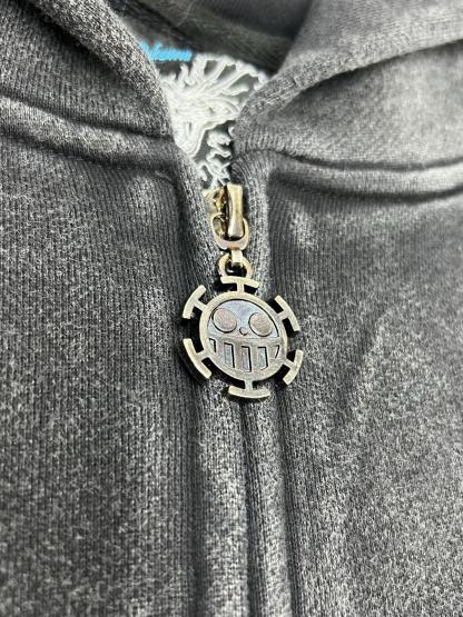 This hoodie draws inspiration from Trafalgar Law’s emblem in One Piece, reimagined through bold patchwork embroidery.