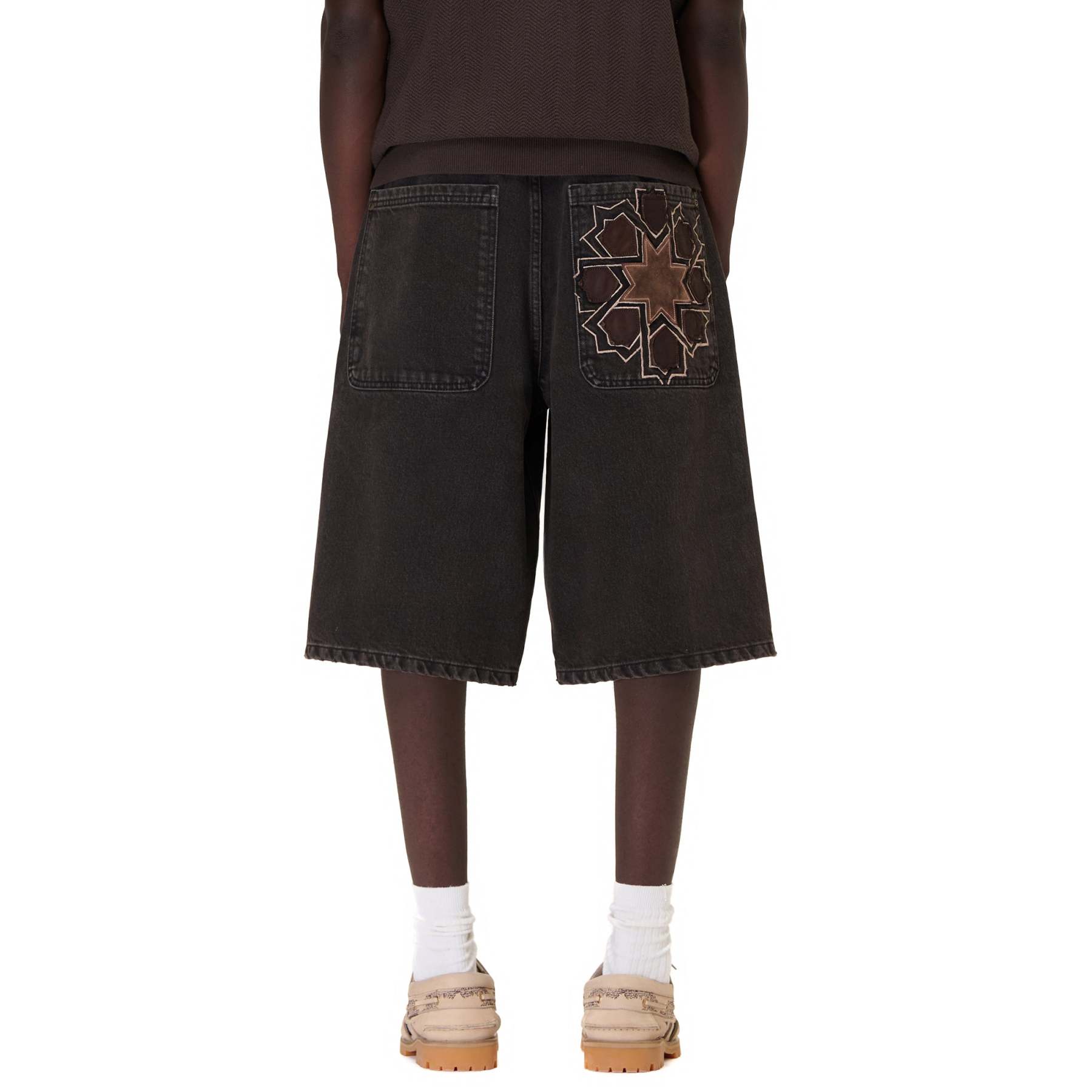 14,5oz denim / 100% cotton / genuine leather applique embroidery on back pocket / embroidered leather patch / custom button / brown washed effect / wash inside out / fits true to size