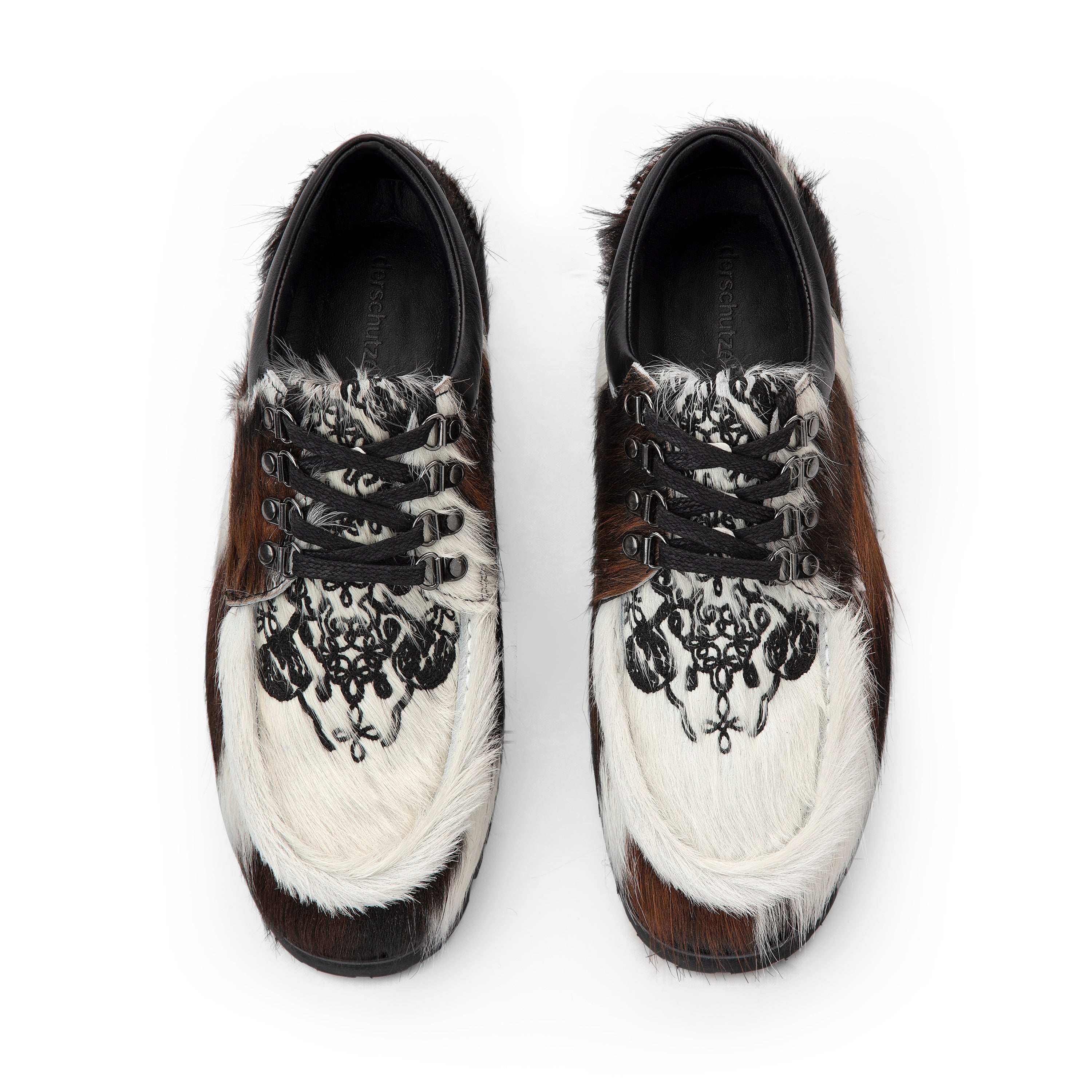 REAL COWHIDE MAY PATTERN WILL VARY WITH EACH SHOE / cow hide genuine leather / leather inner-lining / embossed insole / embroidery on tongue / rubber sole / fits true to size / manufactured in Türkiye
