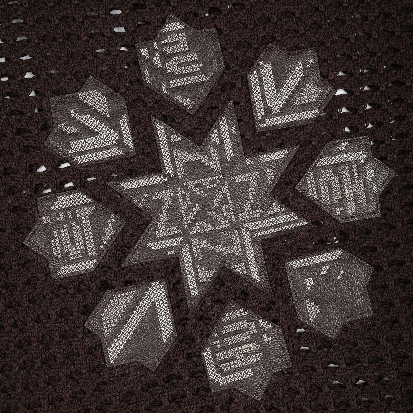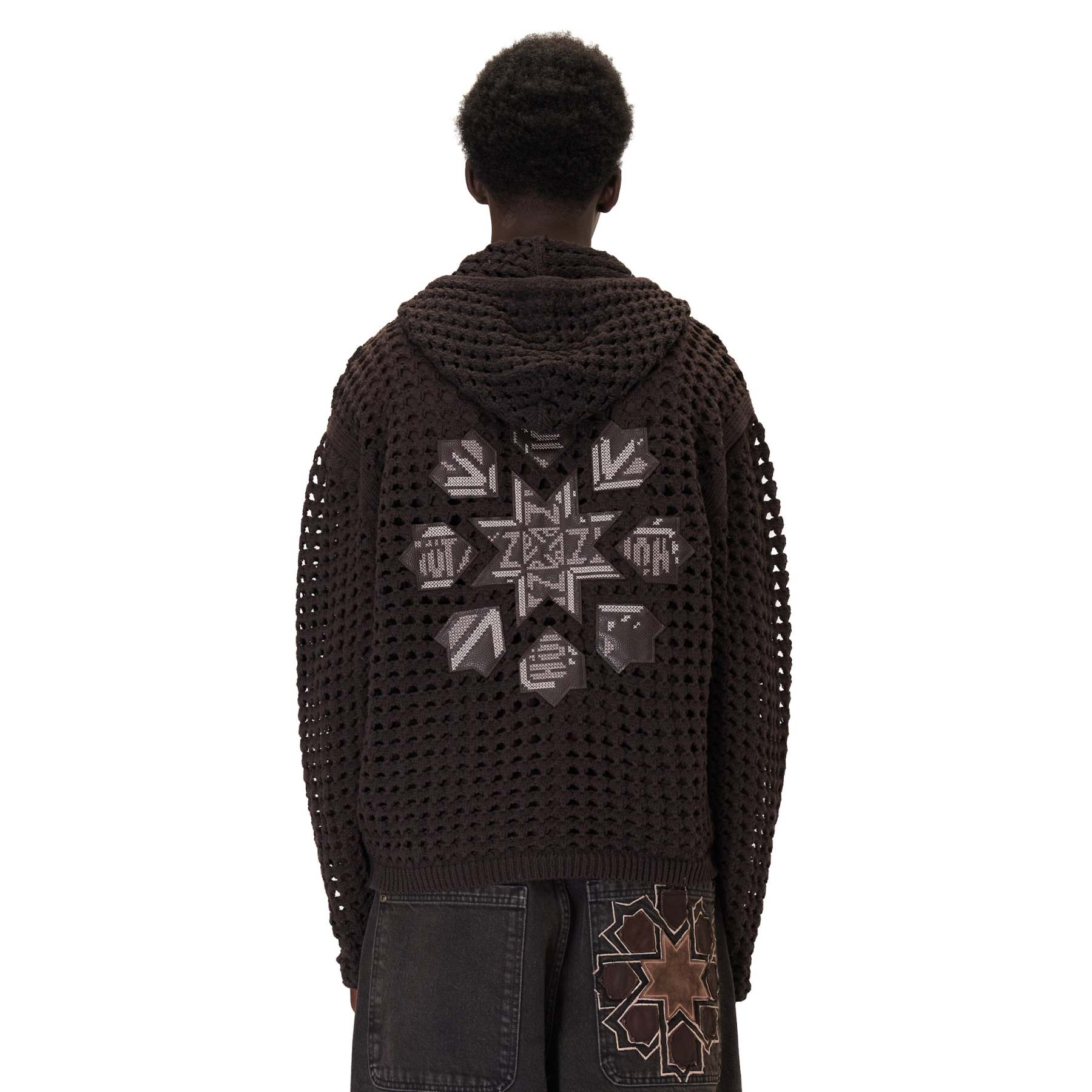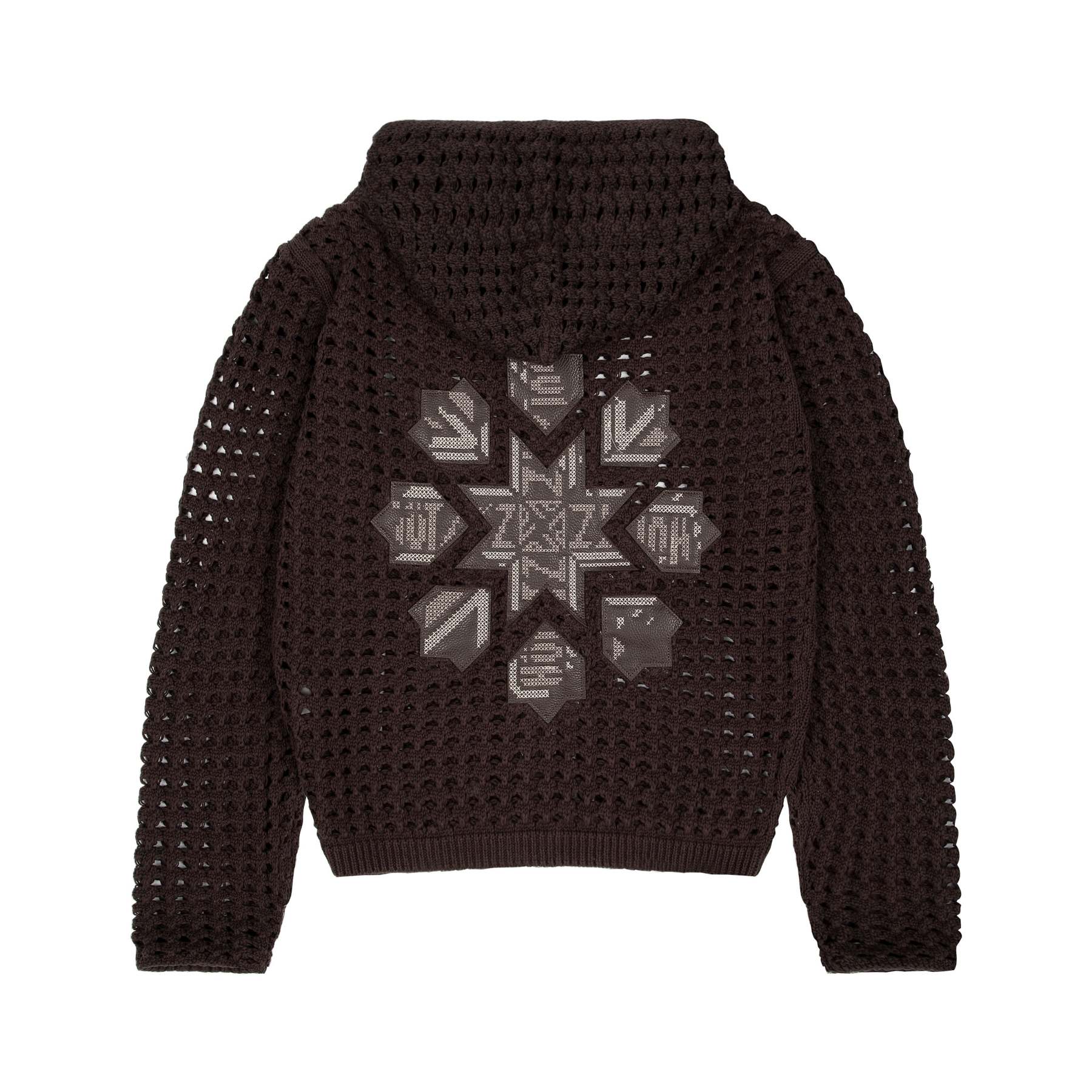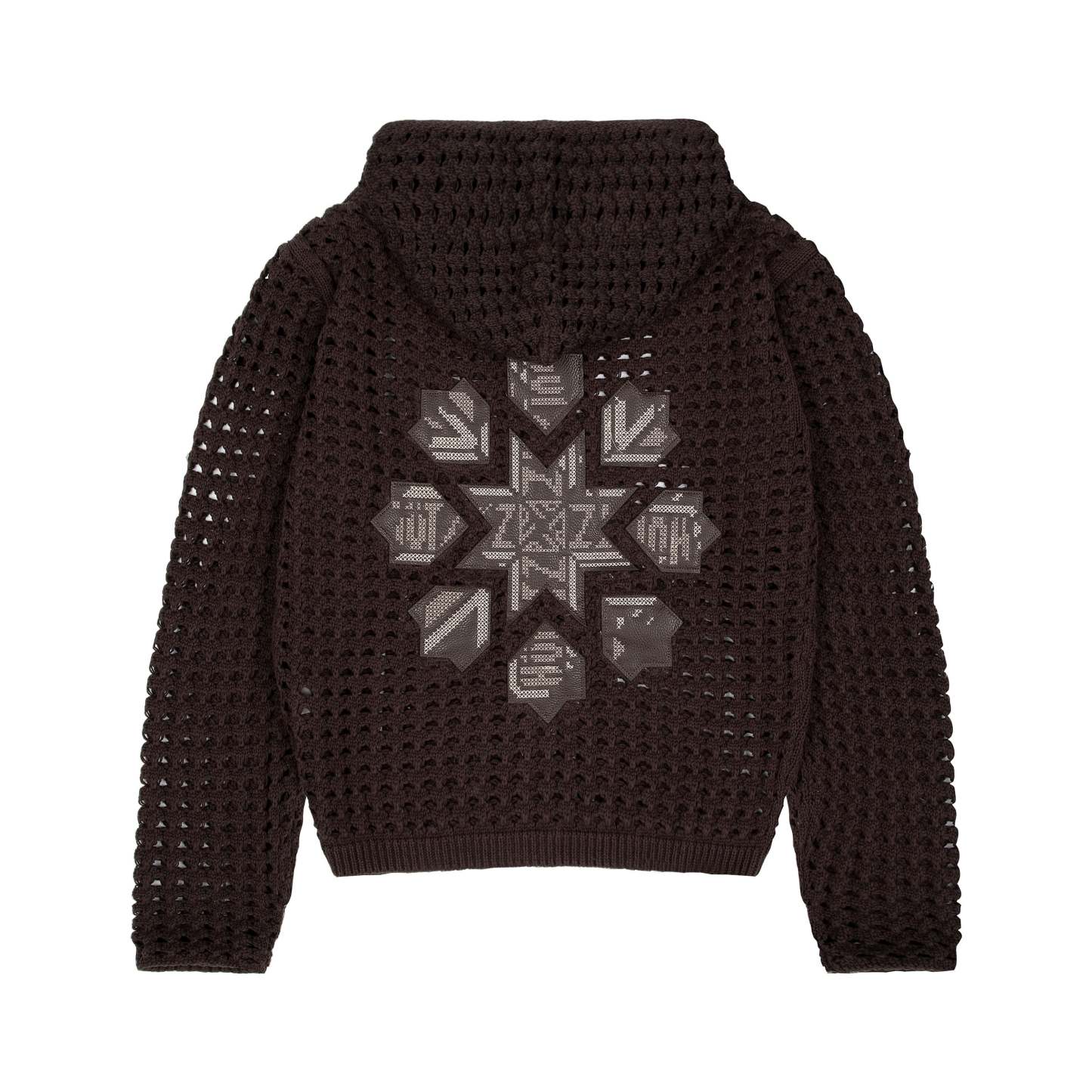 100% cotton / openwork knitting / vegan leather applique embroidery on back / with double-slided YKK zipper / wash inside out / fits true to size