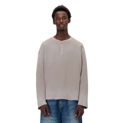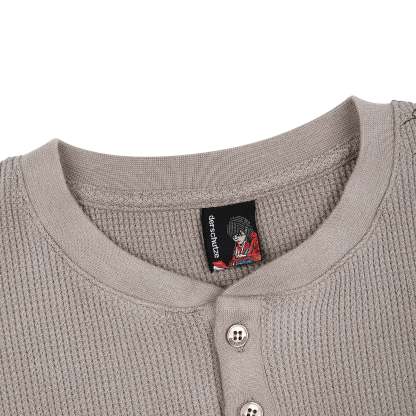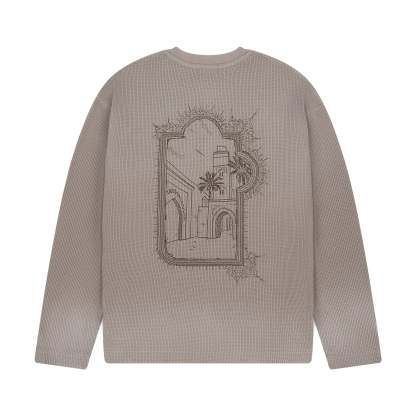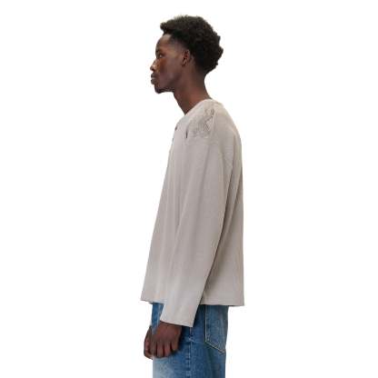 320gsm preshrunk waffle fabric / 97% cotton 3% elastane / embroidery on front and back / bleaching washing effect on shoulder, hem and sleeves / fits true to size