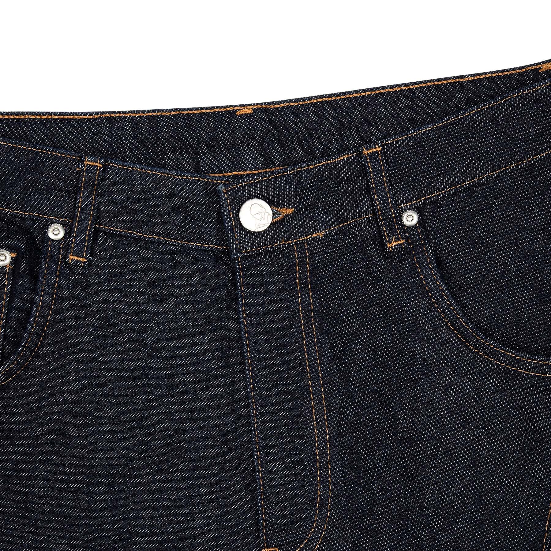 14,5oz raw denim / 100% cotton / made of different pieces / embroideries on front / embroidered leather patch / fabric may bleed or fade, wash inside out in cold water to preserve color and character / fits true to size