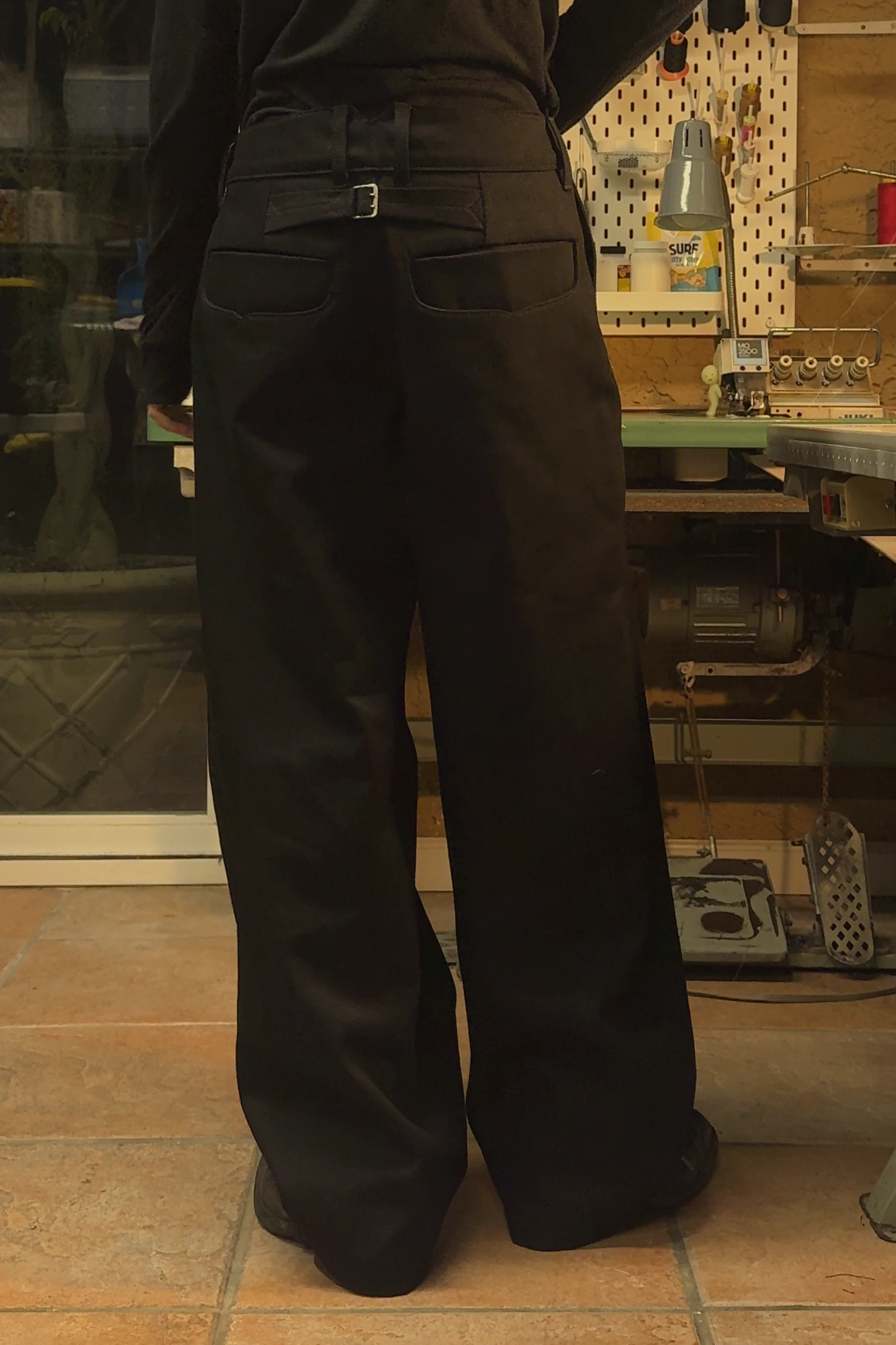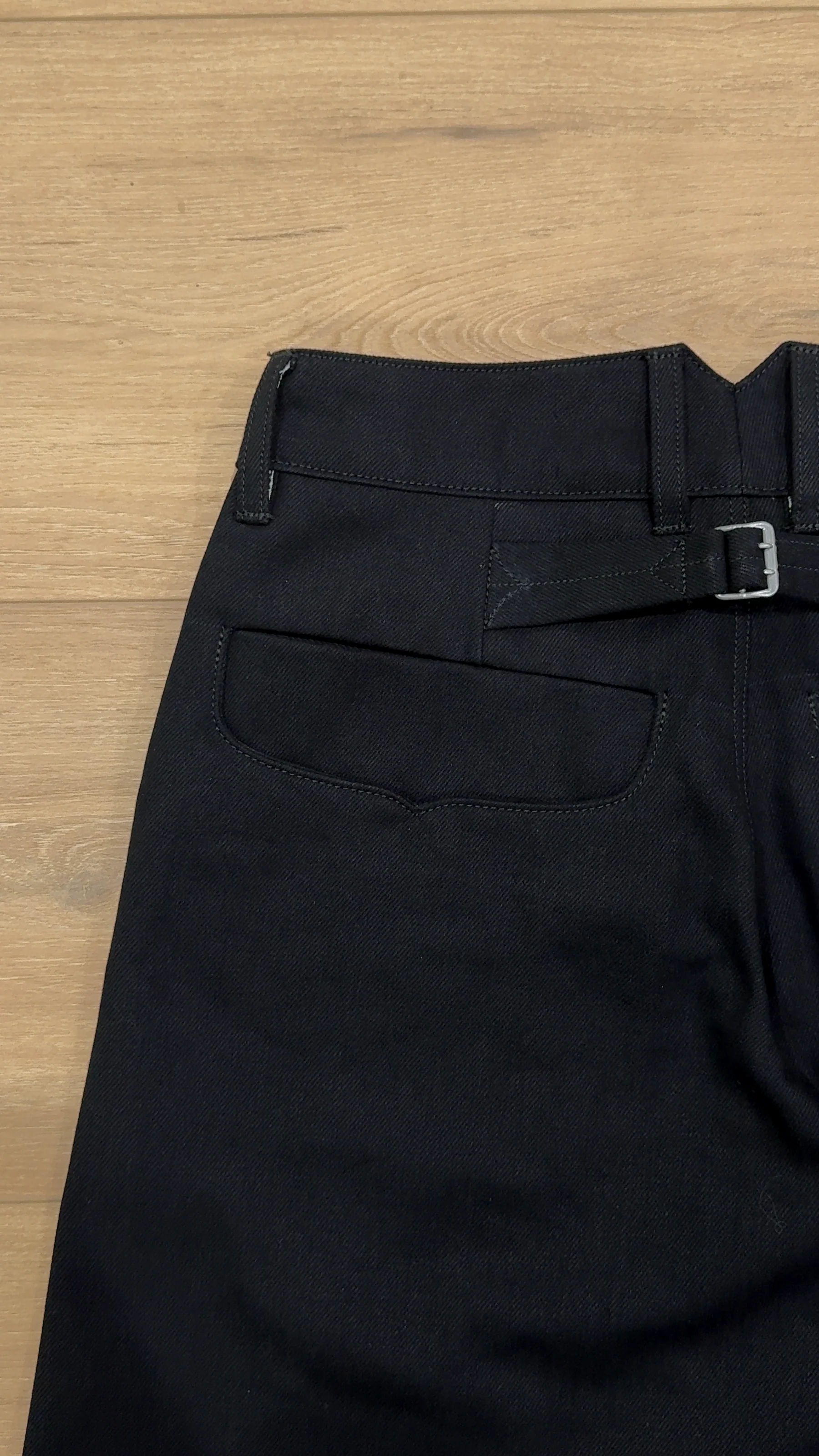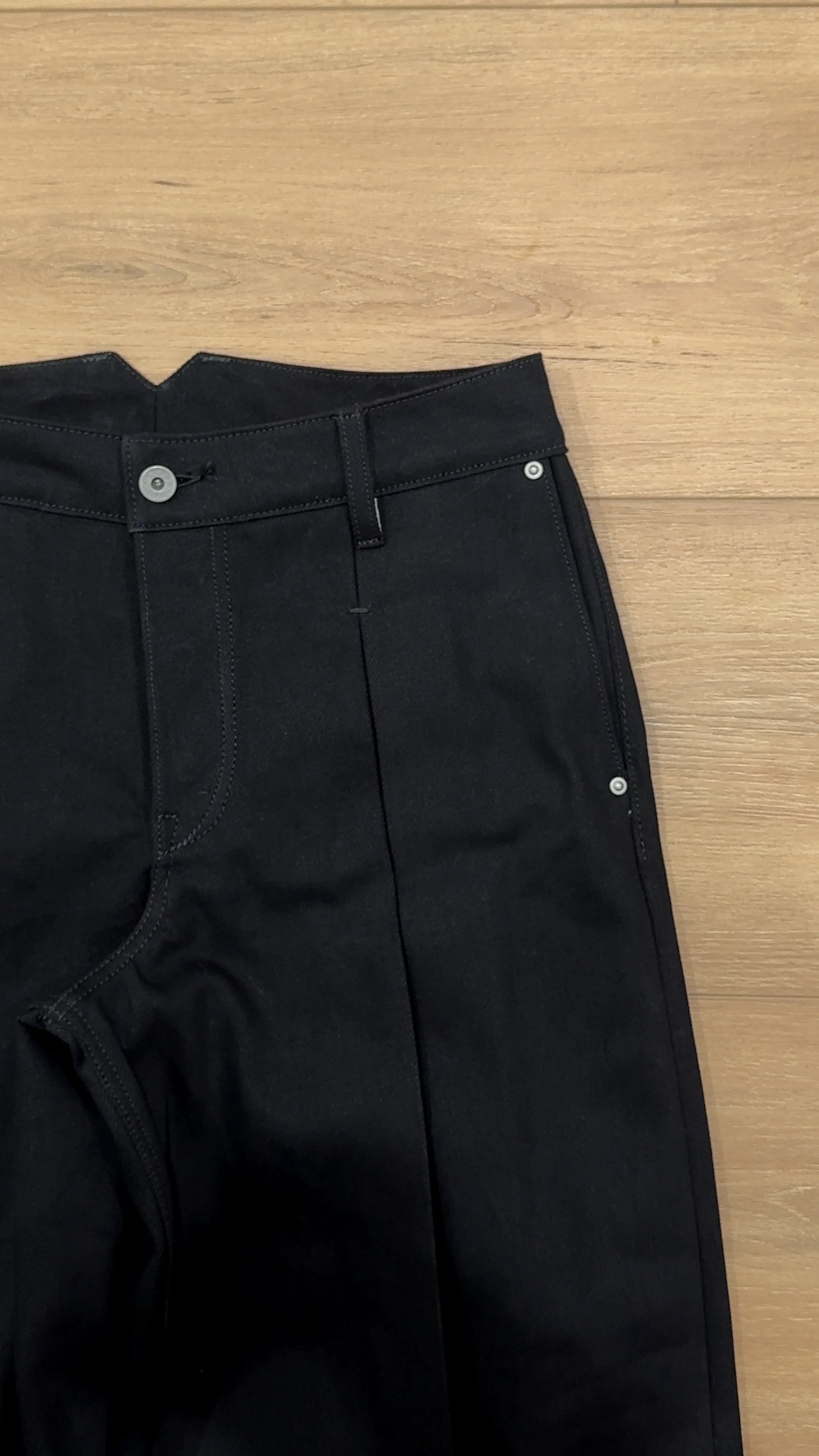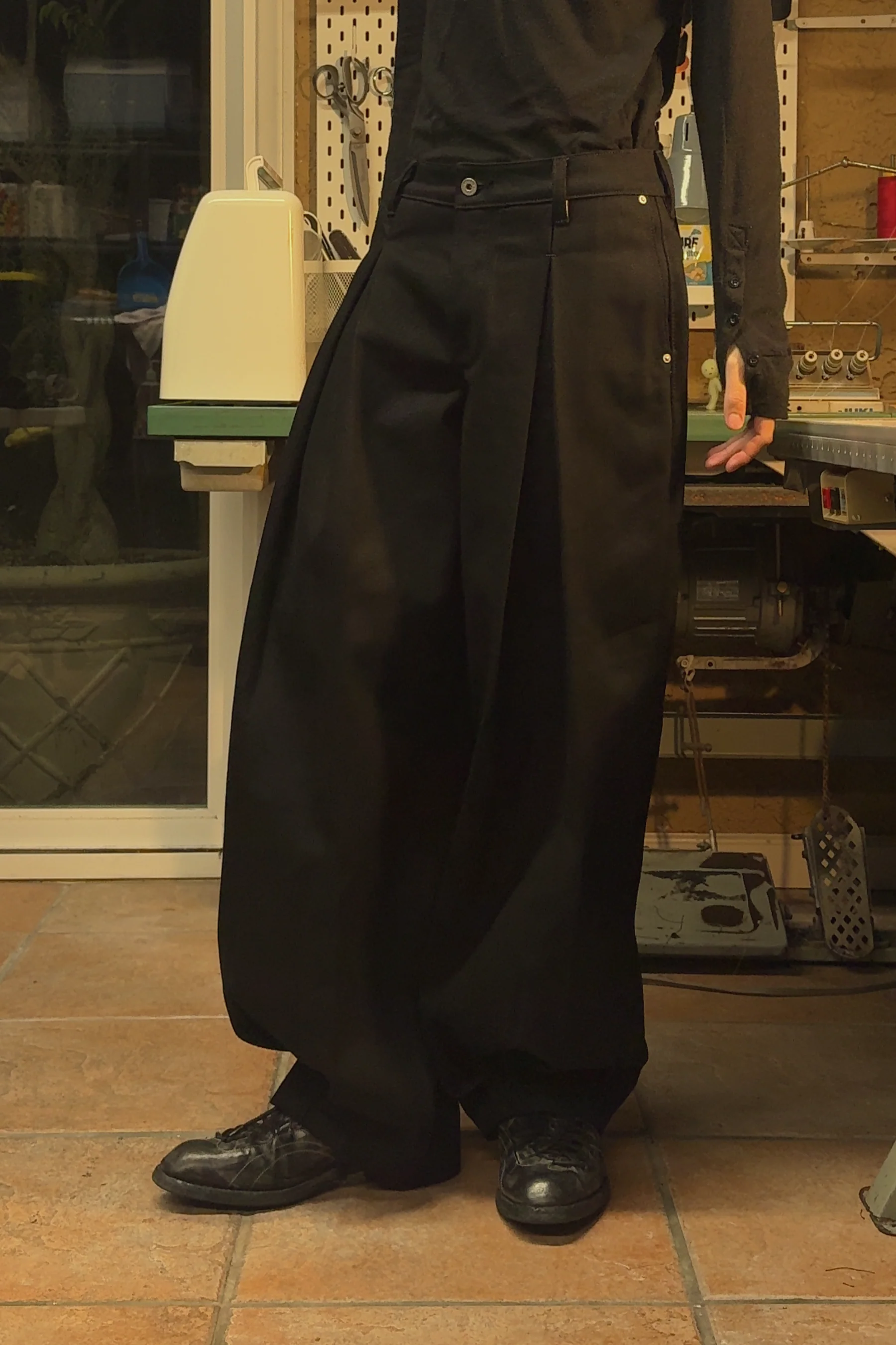Made from 12.5oz raw denim with Japanese hardware. Sporting two large box pleats as it's main feature, with two large back welt pockets and a back cinch.