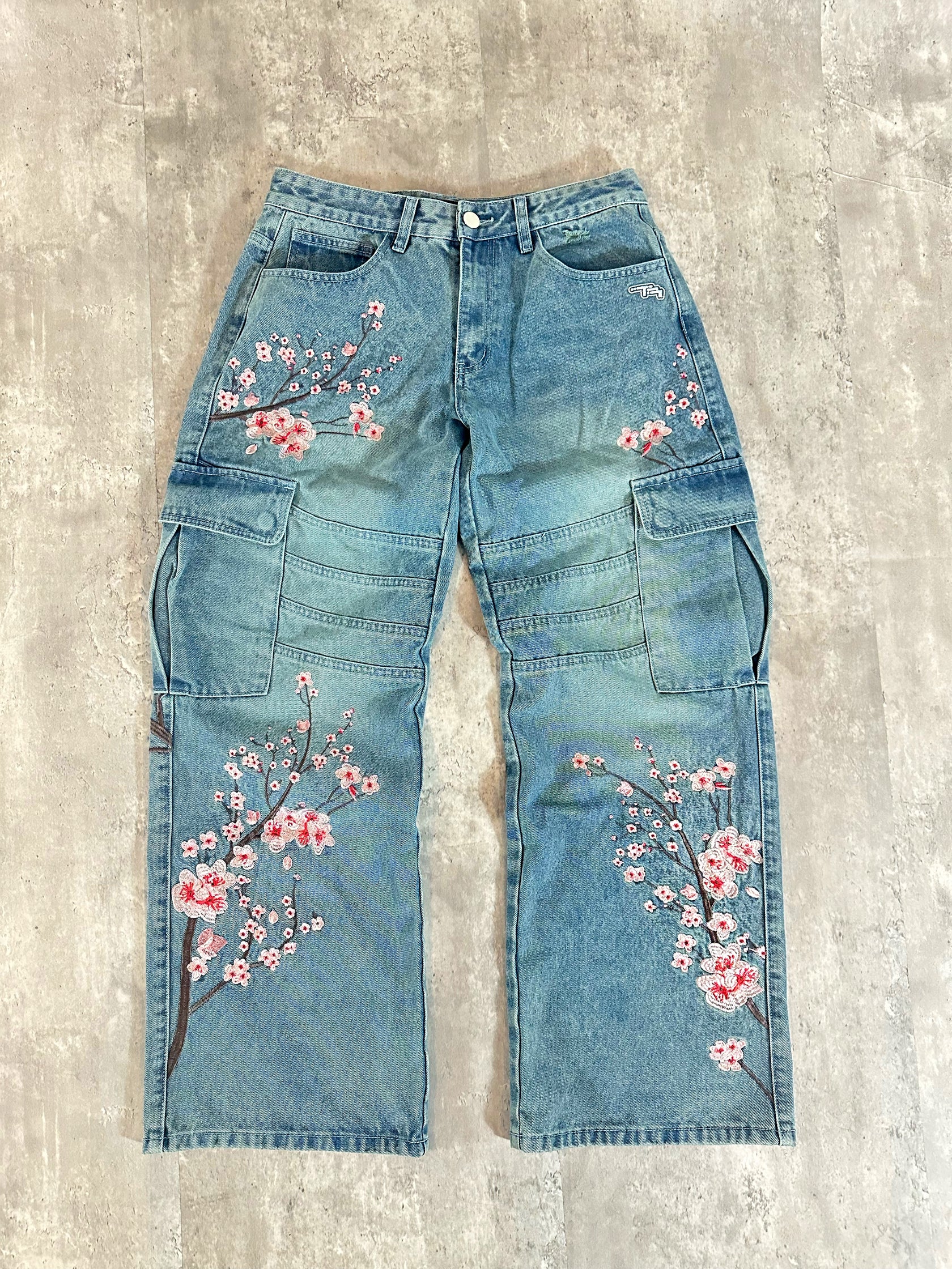These premium denim shorts showcase an intricate cherry