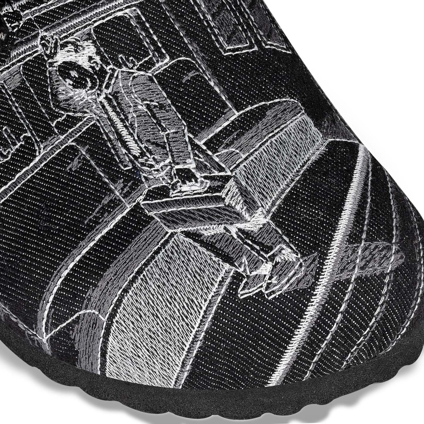 black denim/ embroidered panels/ printed inside design/ manufactured in Türkiye