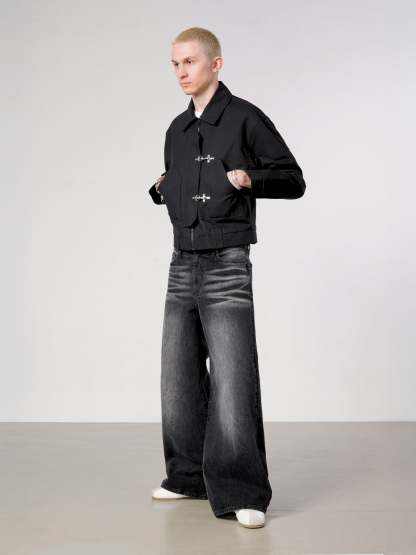 Made with raw 12,5oz 100% cotton duck canvas in black color. Fitted with heavy-duty fireman style clasps. Boxy cut with a roomy fit ideal for spring layering. Beautifully constructed wide collar.