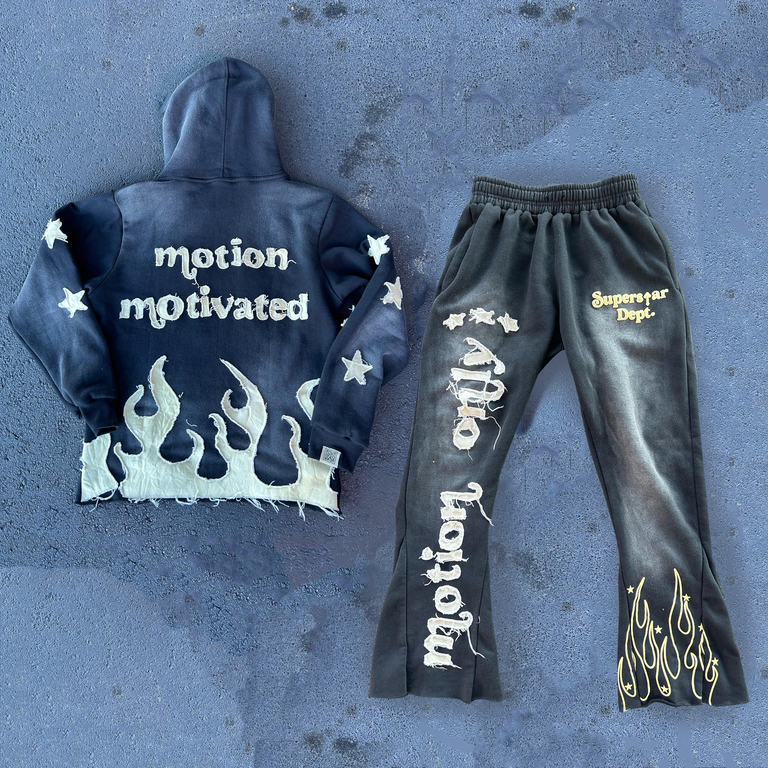 Flame patchwork retro washed street hoodie and trousers two-piece set