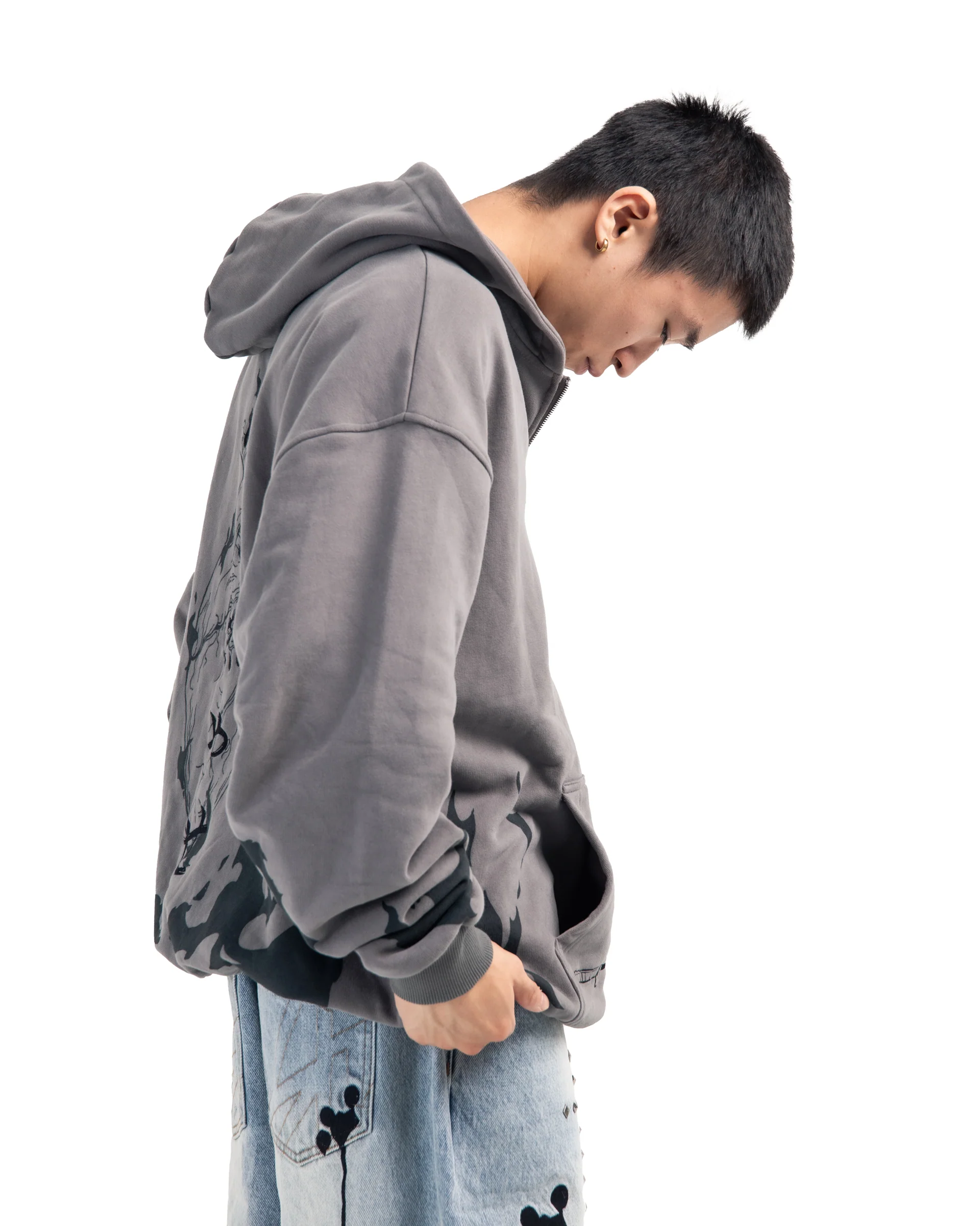The Flame Pillar Hoodie in vintage grey is crafted from luxury heavyweight cotton, with an oversized fit and drop shoulders. It features a large print design on the back, front and sleeves, as well as an embroidery on the front and back. The hoodie has ribbed hems and cuffs.