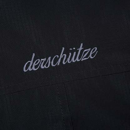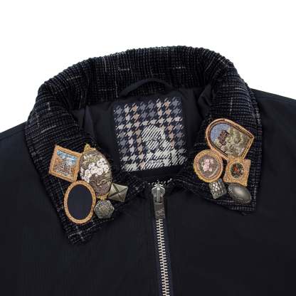 parachute fabric / fiber filling / collar from velvet fabric / ribbed hem and cuffs / embroidered collar with custom pins / embroidery on back / fits true to size