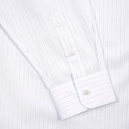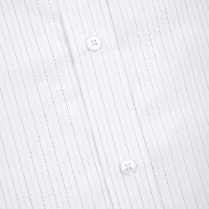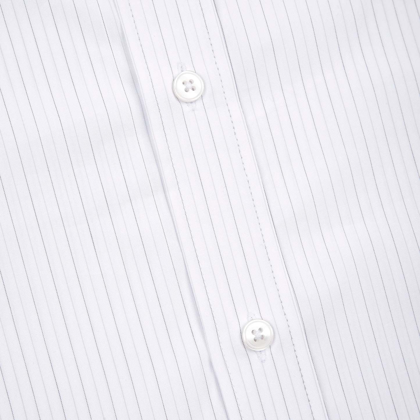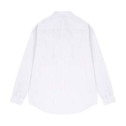 100% cotton / white-grey striped / embroidery on front / custom buttons / curved hem / relaxed fit / fits true to size