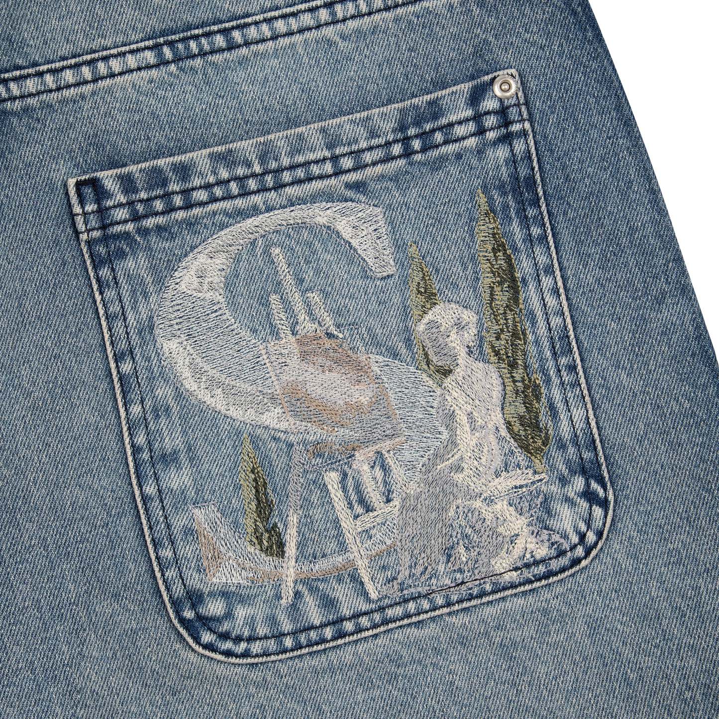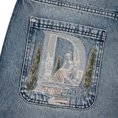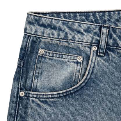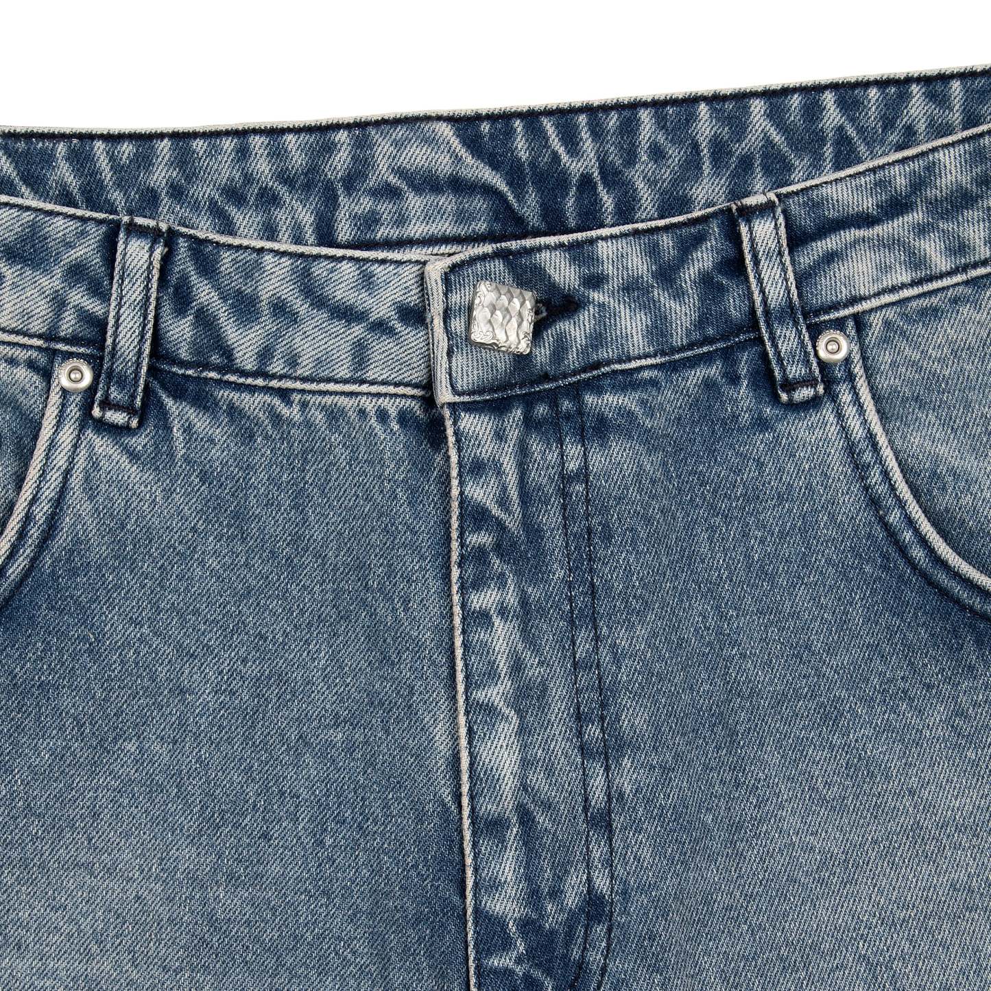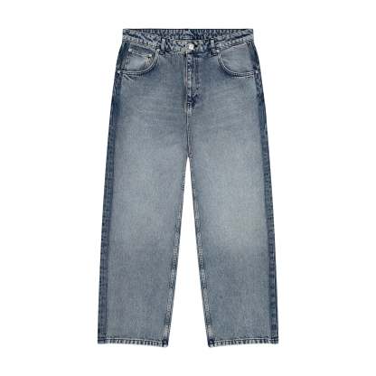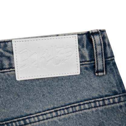14,5oz washed indigo denim / 100% cotton / embroidered back pockets / deboss printed leather patch / custom button / unwashed side details / baggy fit / fits true to size