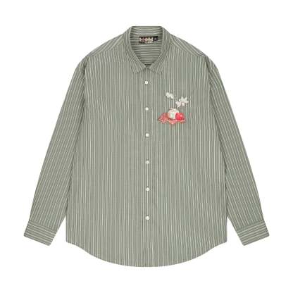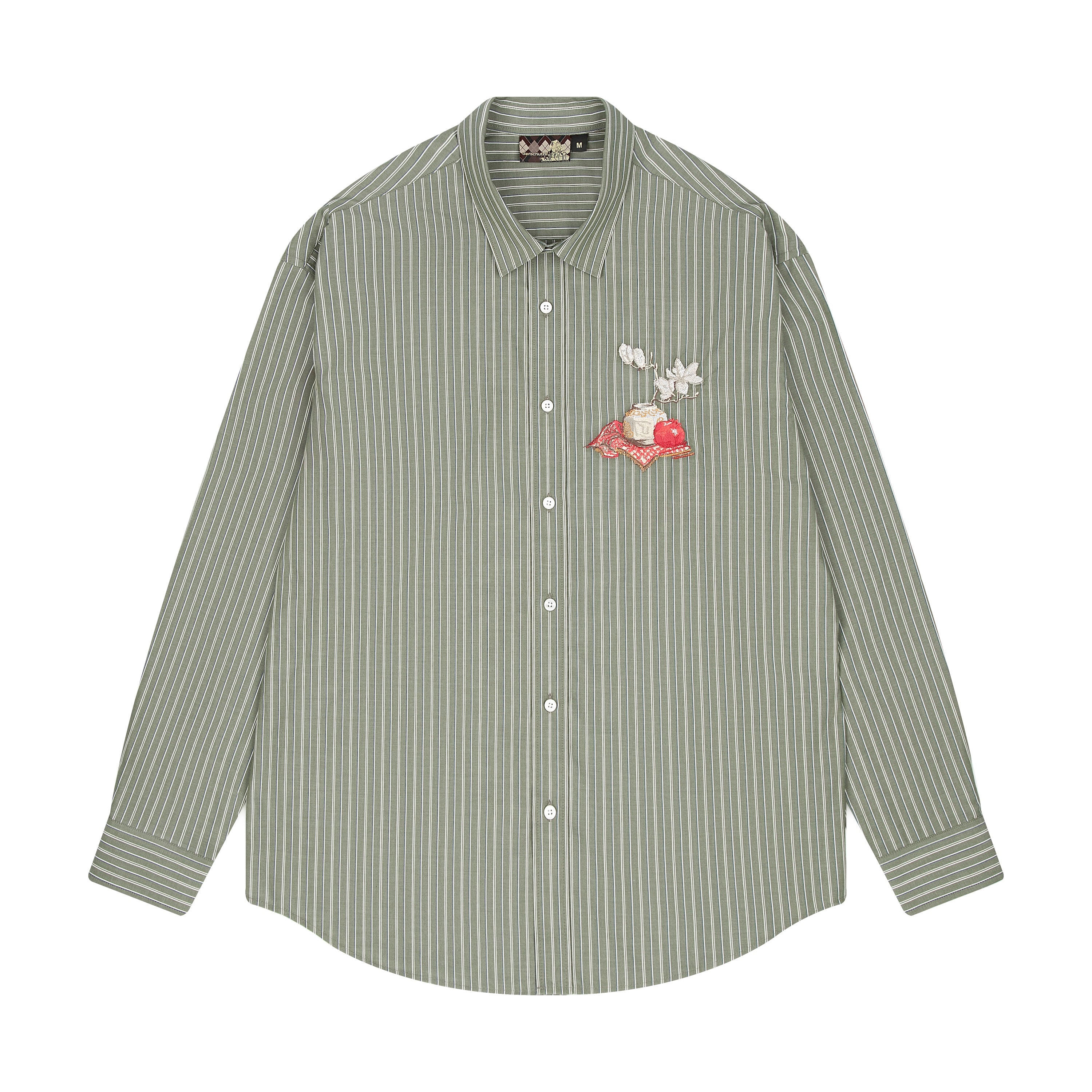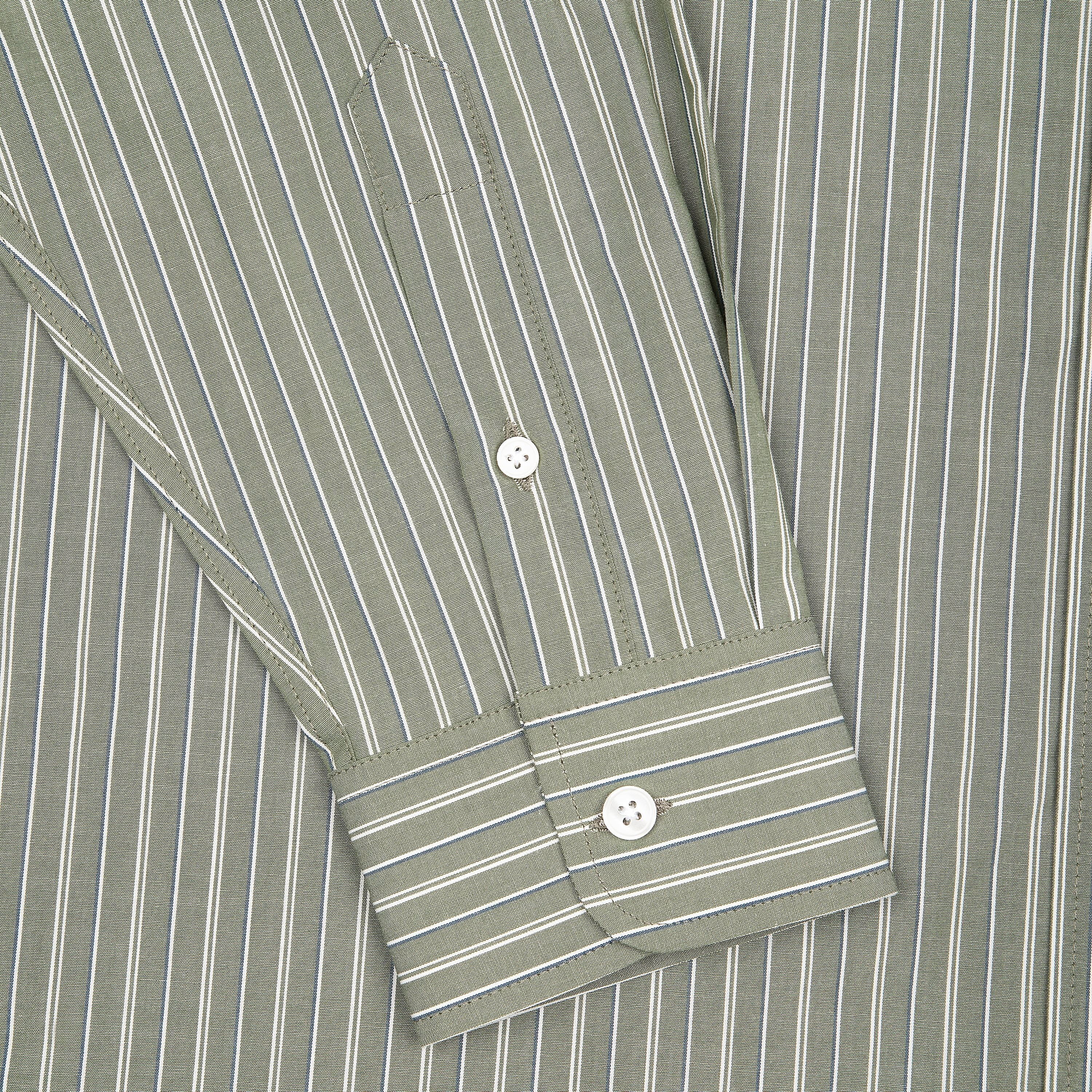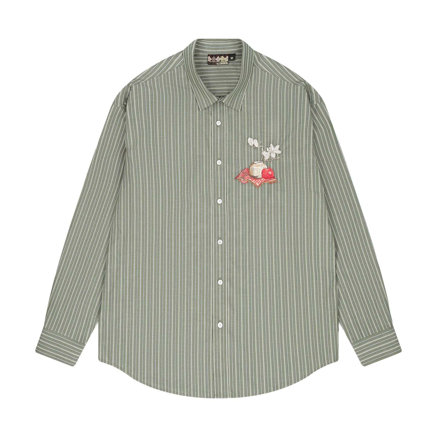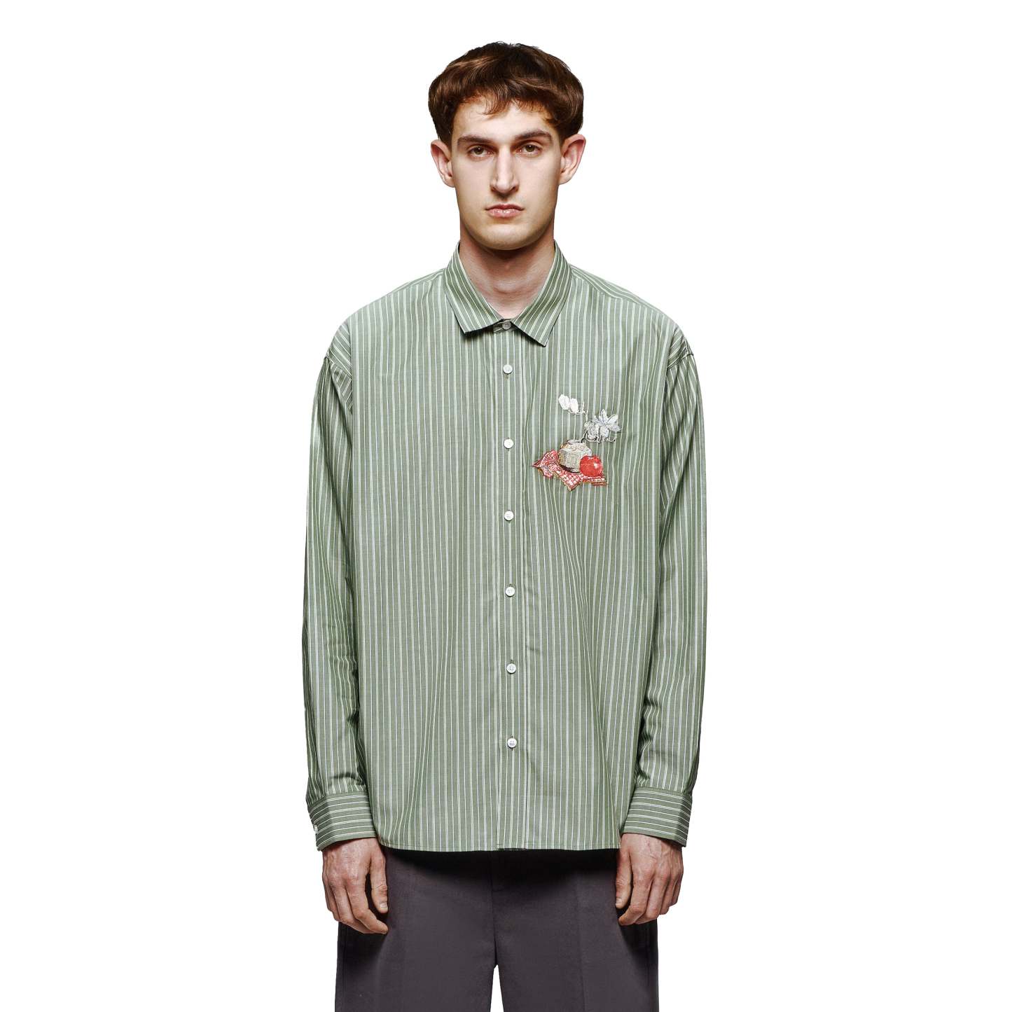 poplin fabric / 100% cotton / white-green striped / embroidery on front / custom buttons / curved hem / relaxed fit / fits true to size
