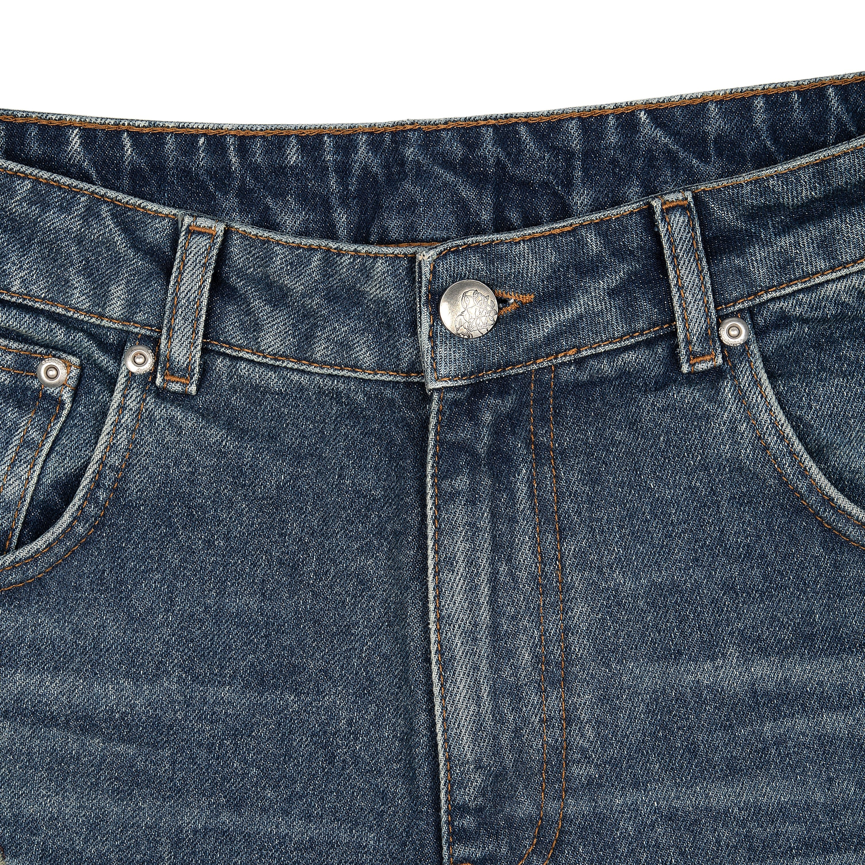 14,5oz denim / 100% cotton / embroidery on front and back / effect washing / distressing on front and back / custom button / baggy fit / fits true to size