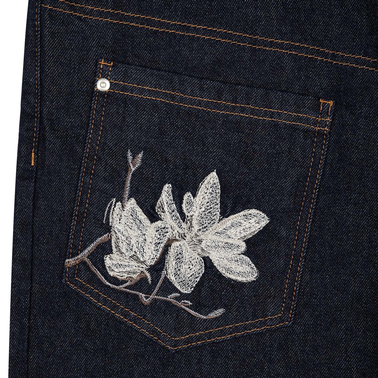 14,5oz raw denim / 100% cotton / yoke and back pocket look on front / embroideries on front pockets / plaid patterned deboss printed leather patch / custom button / baggy fit / fabric may bleed or fade, wash inside out in cold water to preserve color and character / fits true to size