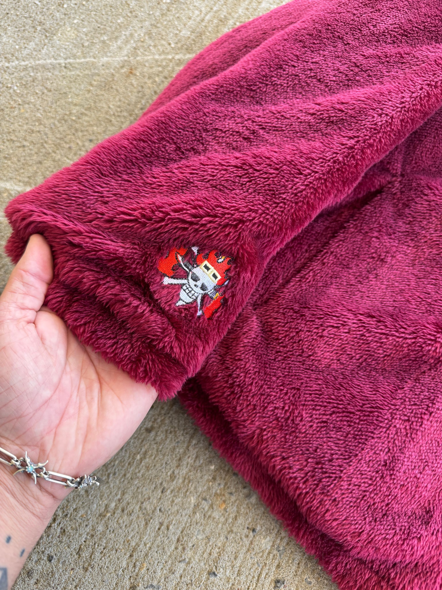 Embroidered designs on the back, sleeve, and inside.