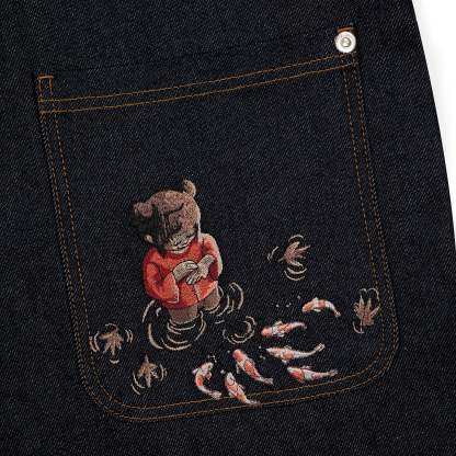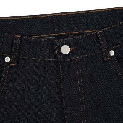 14,5oz denim / selvedge denim feel / 100% cotton / embroidery on front and back pocket / embroidered leather patch / baggy fit