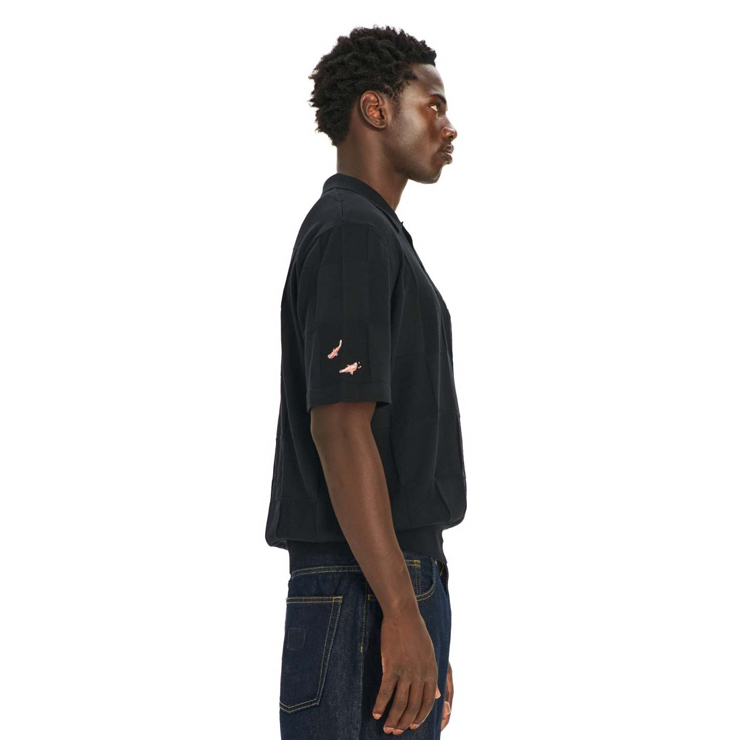 100% cotton / checkered knit pattern / embroidery on front and sleeve / custom buttons / fits true to size