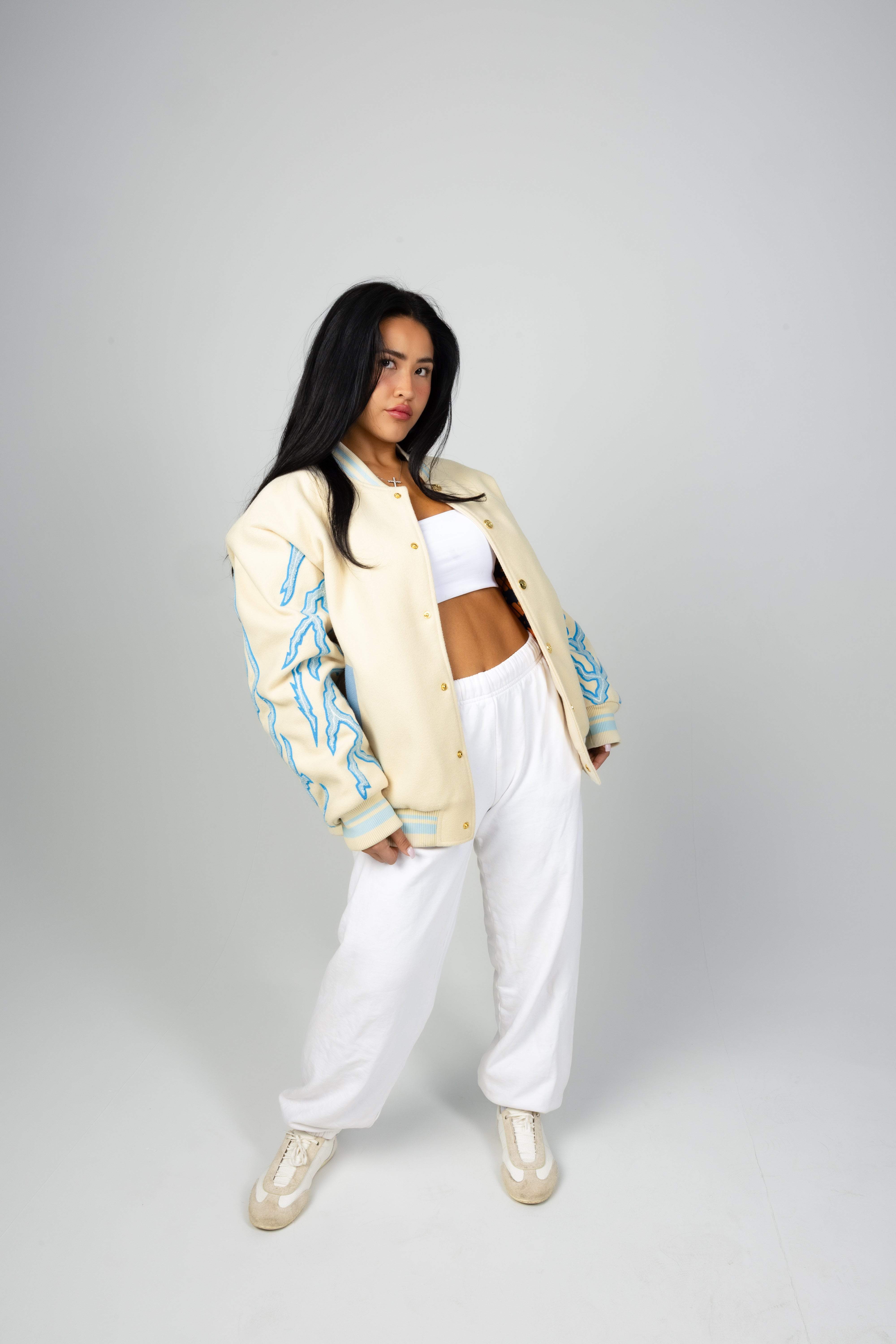 Chenille Embroidery with Radiant Detailing – Lighting-inspired chenille embroidery runs along the arms, giving the jacket an electric edge that feels both powerful and dynamic.