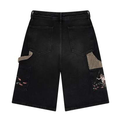 14.5oz denim / 100% cotton / embroidery on both side pockets / fish net detailing / baggy fit