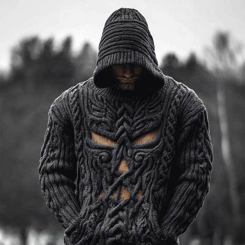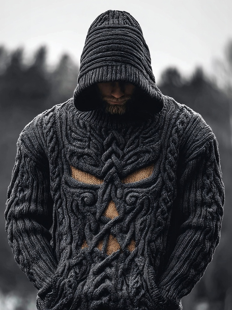 Men's Spooky Face Jacquard Washed Chunky Hooded Sweater