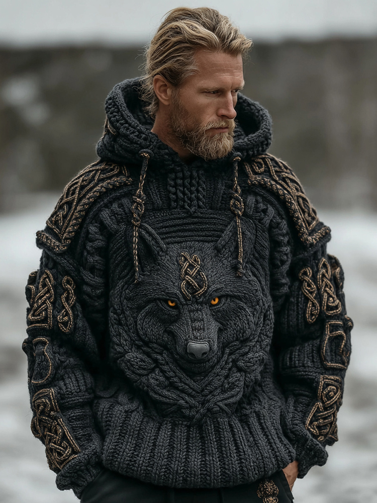 Men's Vintage Viking Wolf Knit Hooded Sweater