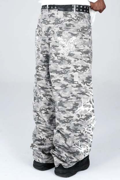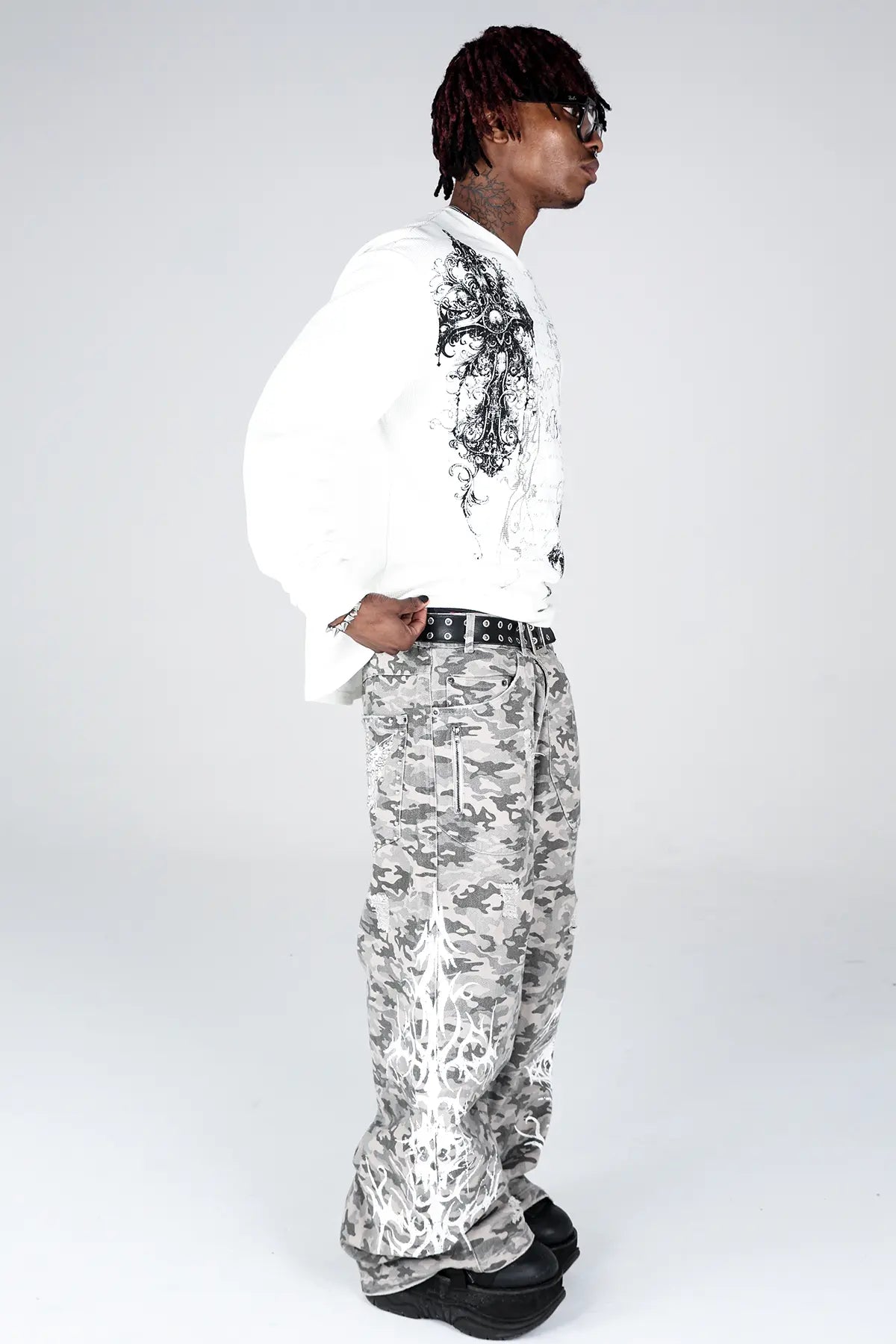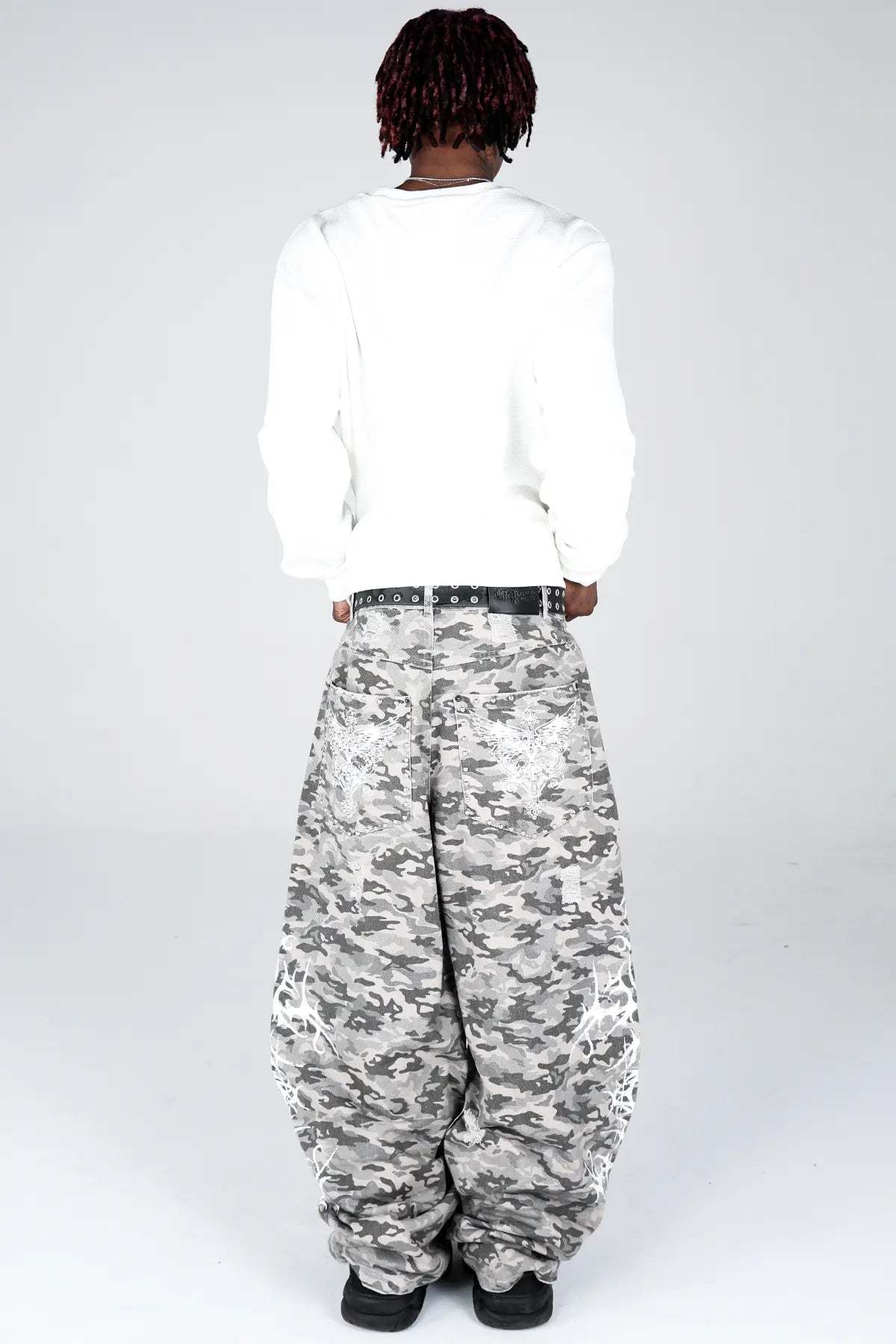 These mid-weight camouflage jeans are crafted for durability and everyday comfort, with premium cotton that feels great and lasts. Designed with a relaxed, baggy fit & a wide leg opening, they’re made to move with you. Finished with pocket gems, and a screenprint that'll last life's roughest moments.