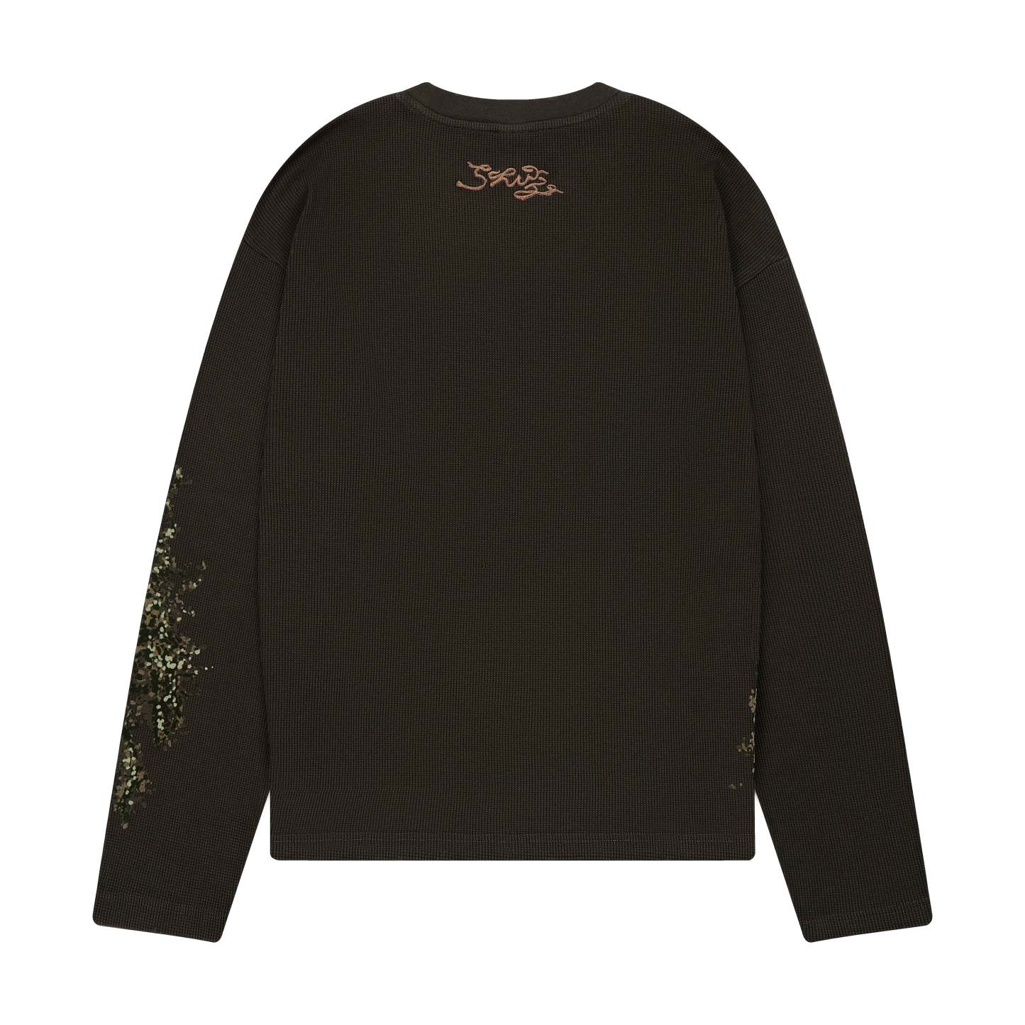 320gsm waffle fabric / 97% preshrunk cotton 3% elastane / embroidered on the neck / flock print on front, shoulder and sleeve / slightly distressed on collar rib, cuffs and hem / fits true to size
