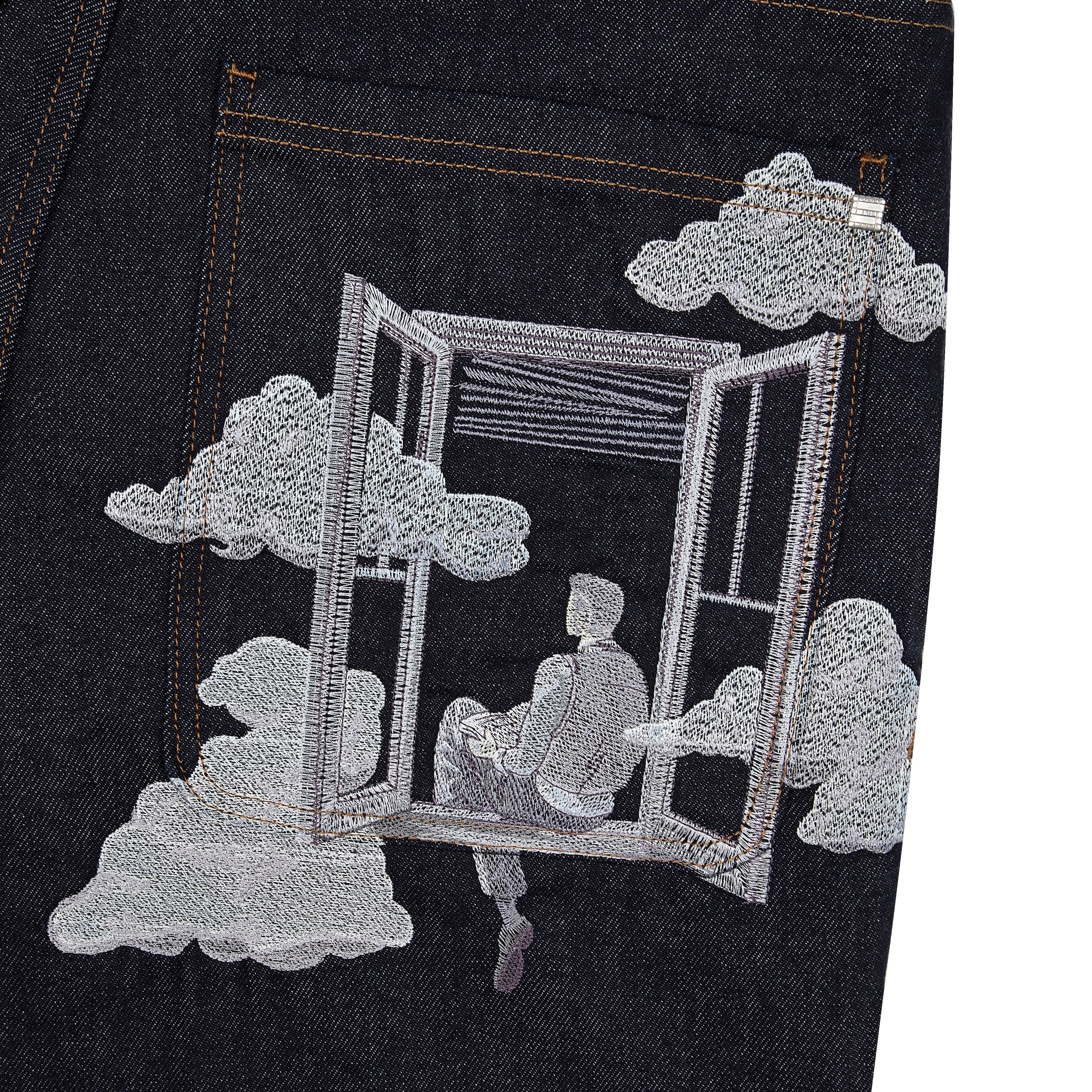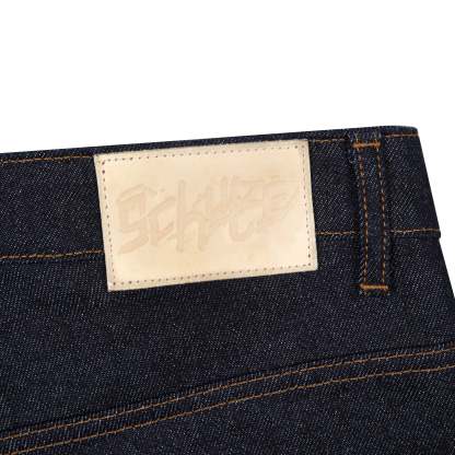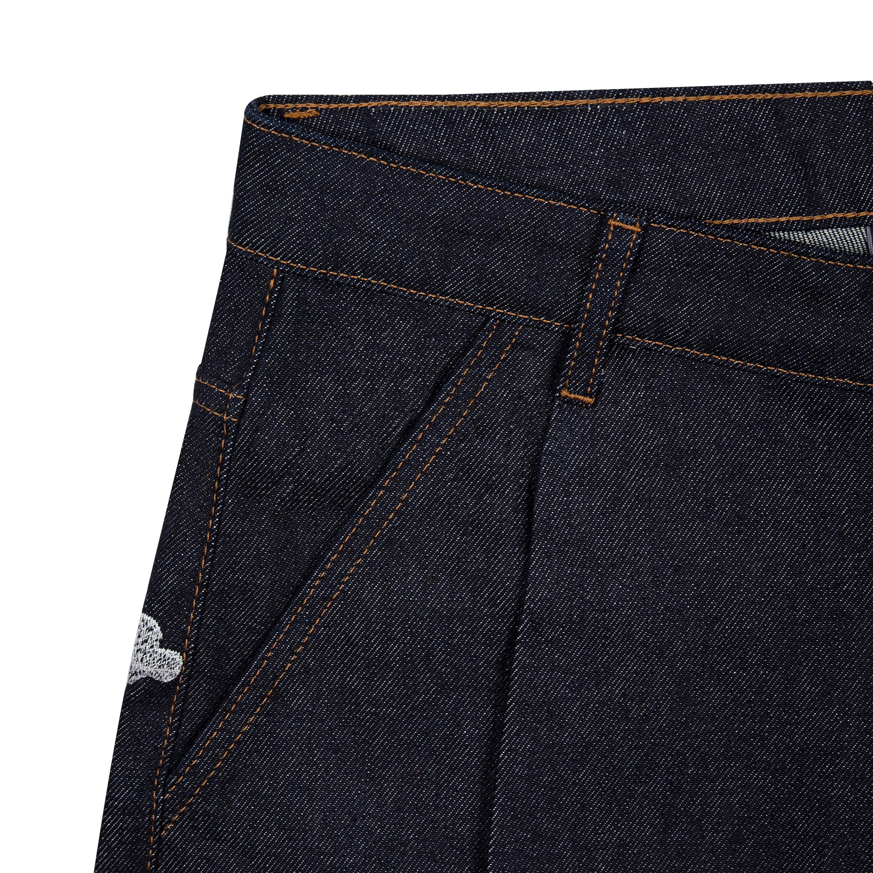 14,5oz raw denim / 100% cotton / embroidery on back / deboss printed leather patch / darts on front / custom button / fabric may bleed or fade, wash inside out in cold water to preserve color and character / fits true to size