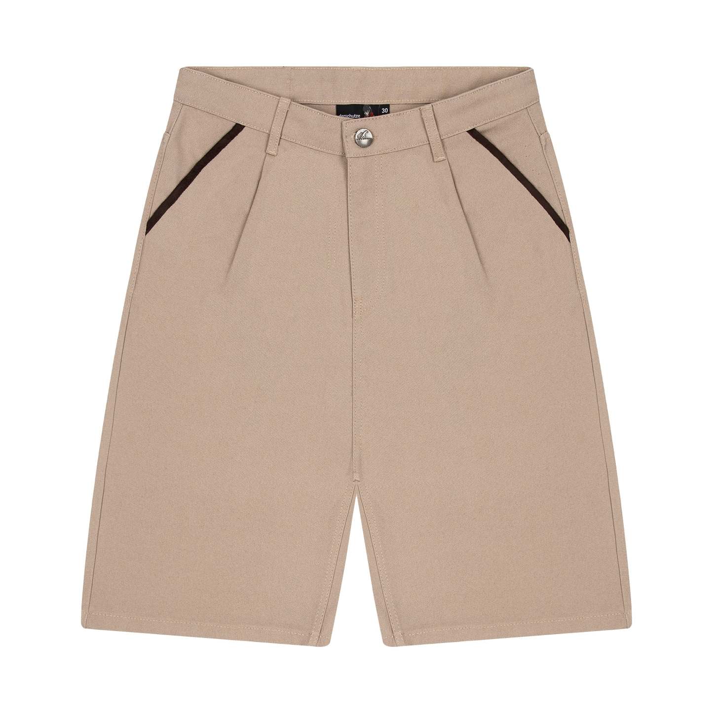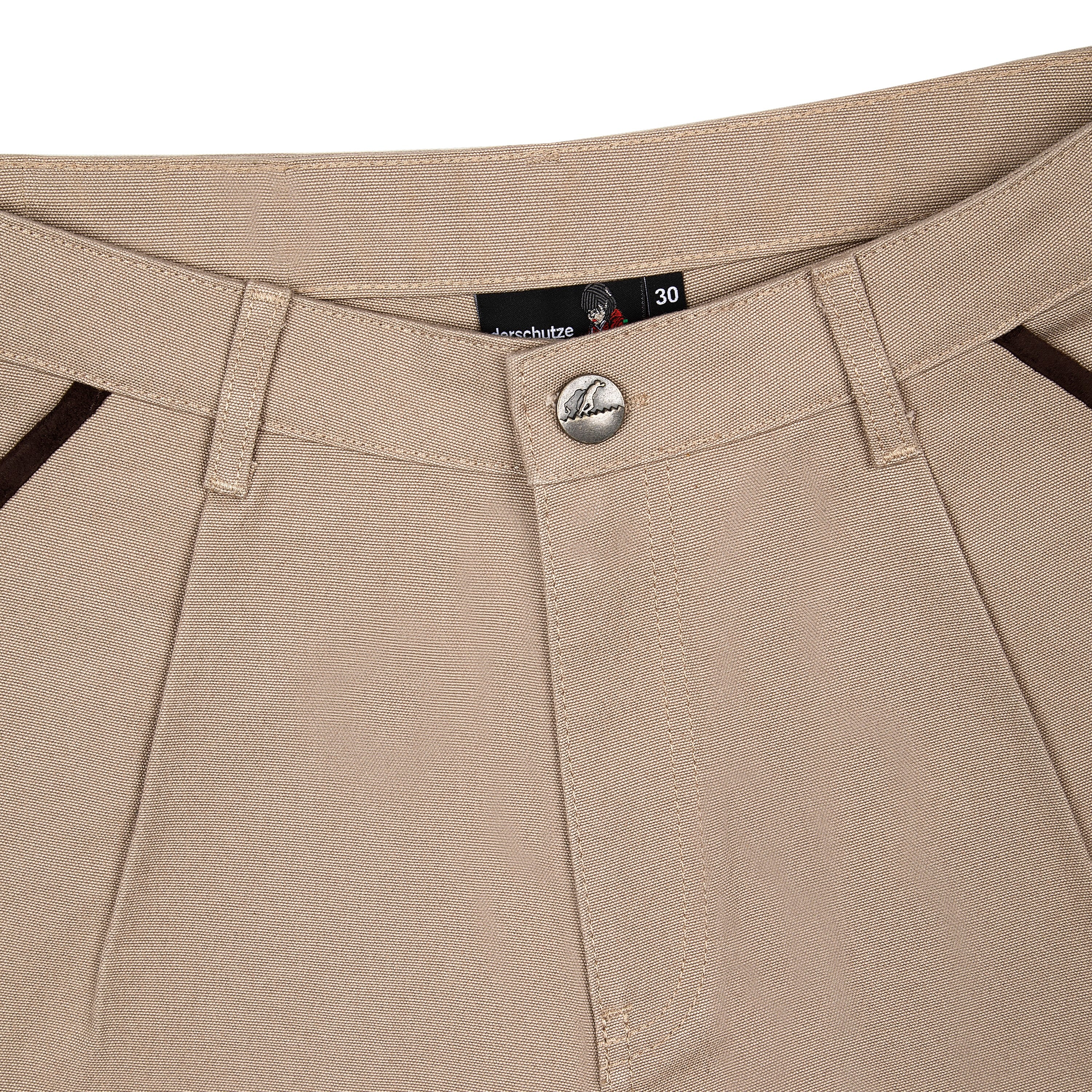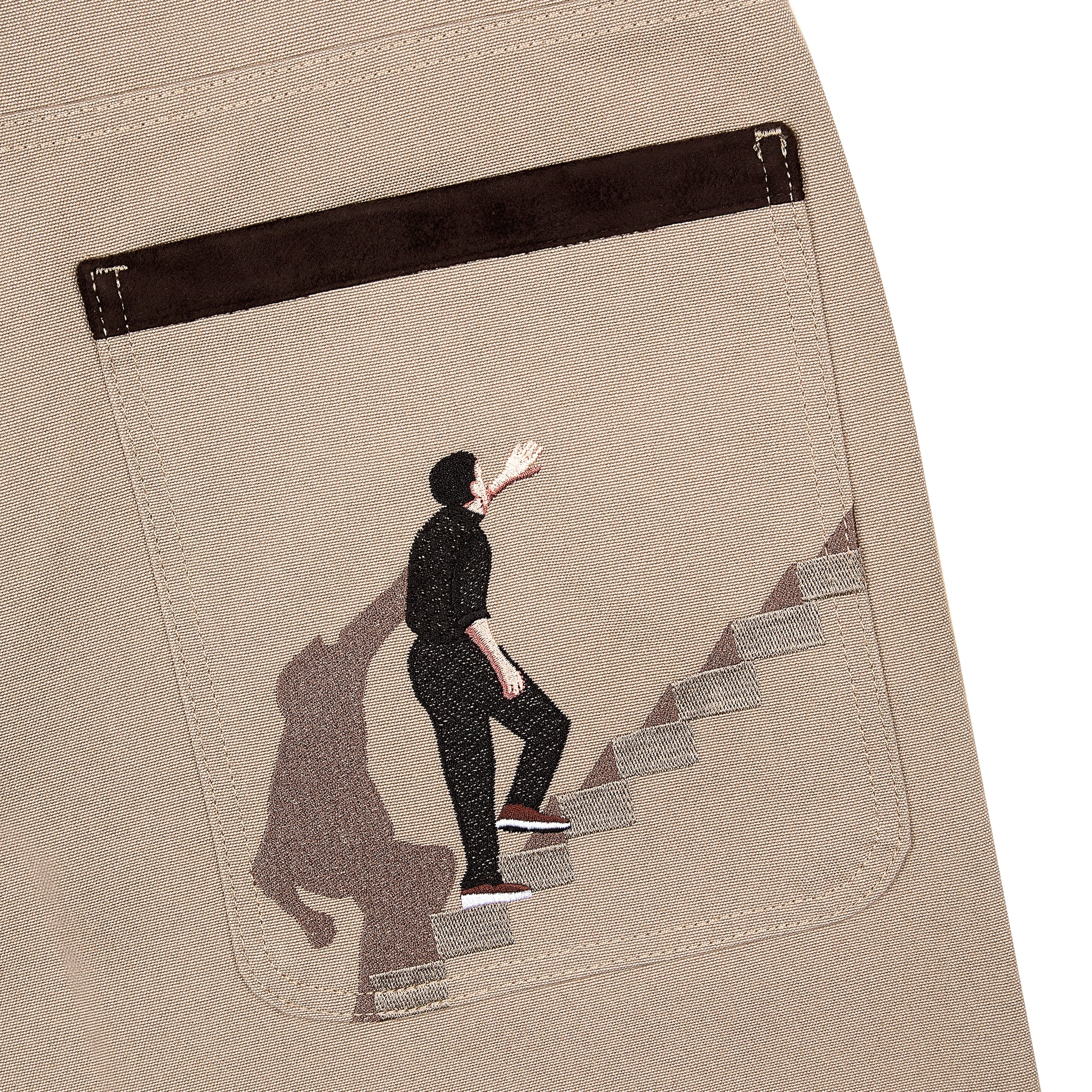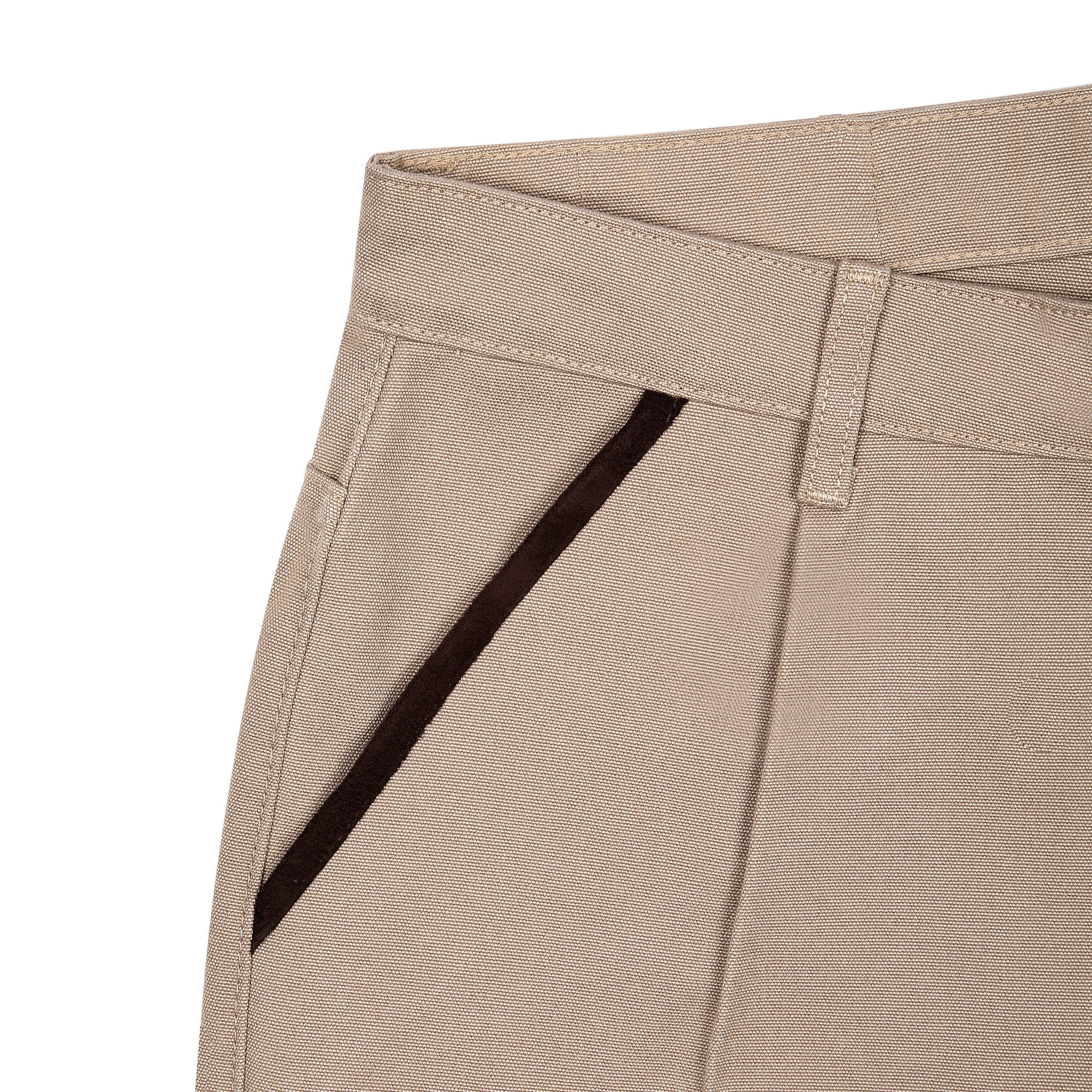 canvas fabric / 100% cotton / vegan suede leather details on front and back pocket openings / embroidery on back pocket / deboss printed leather patch / darts on front / custom button / fits true to size