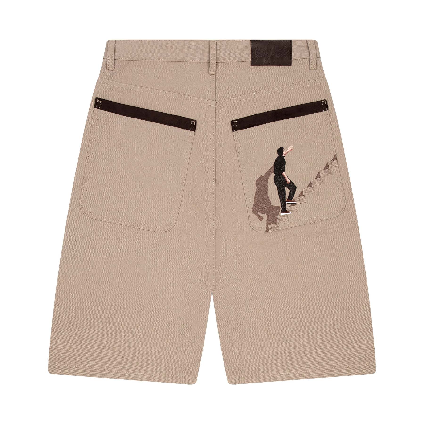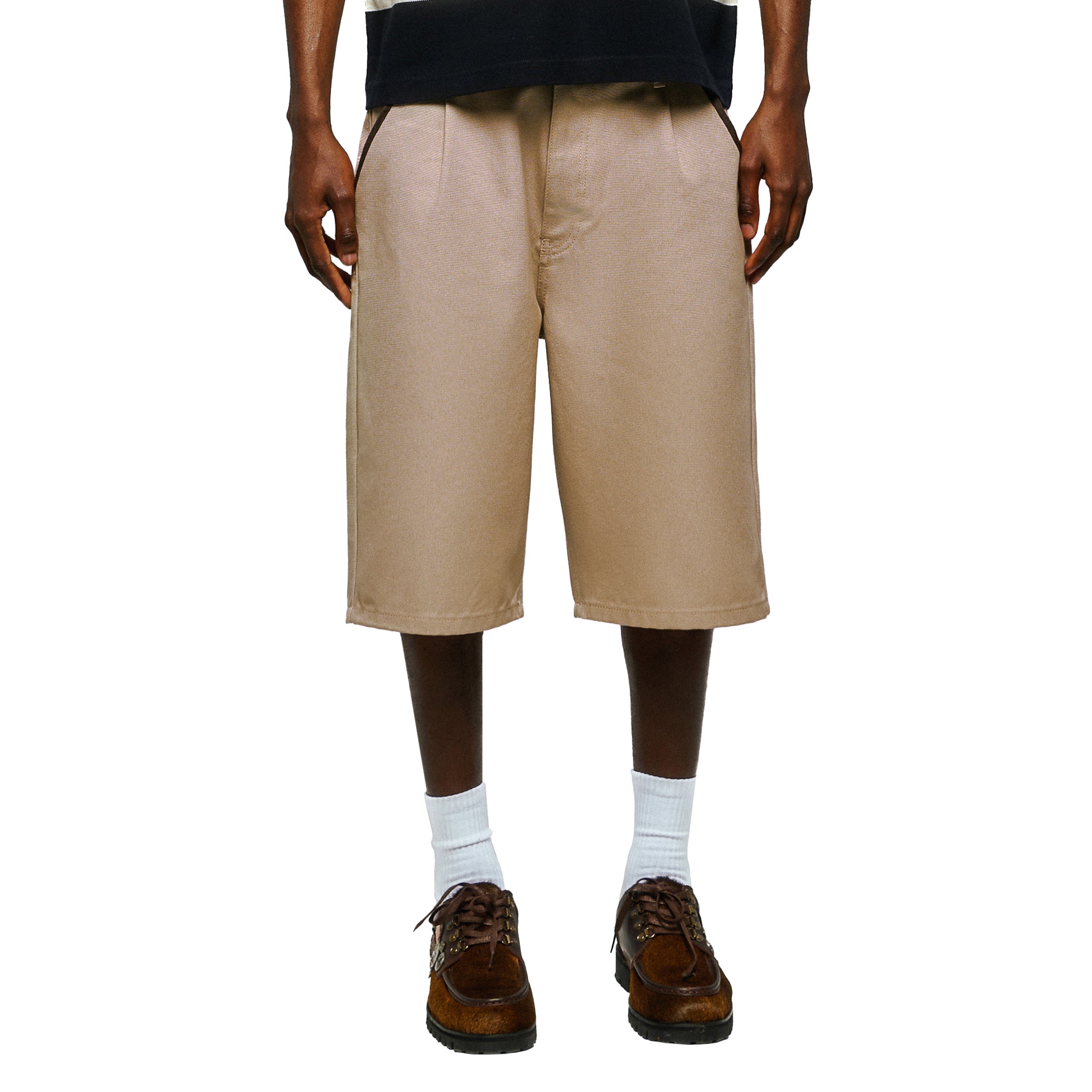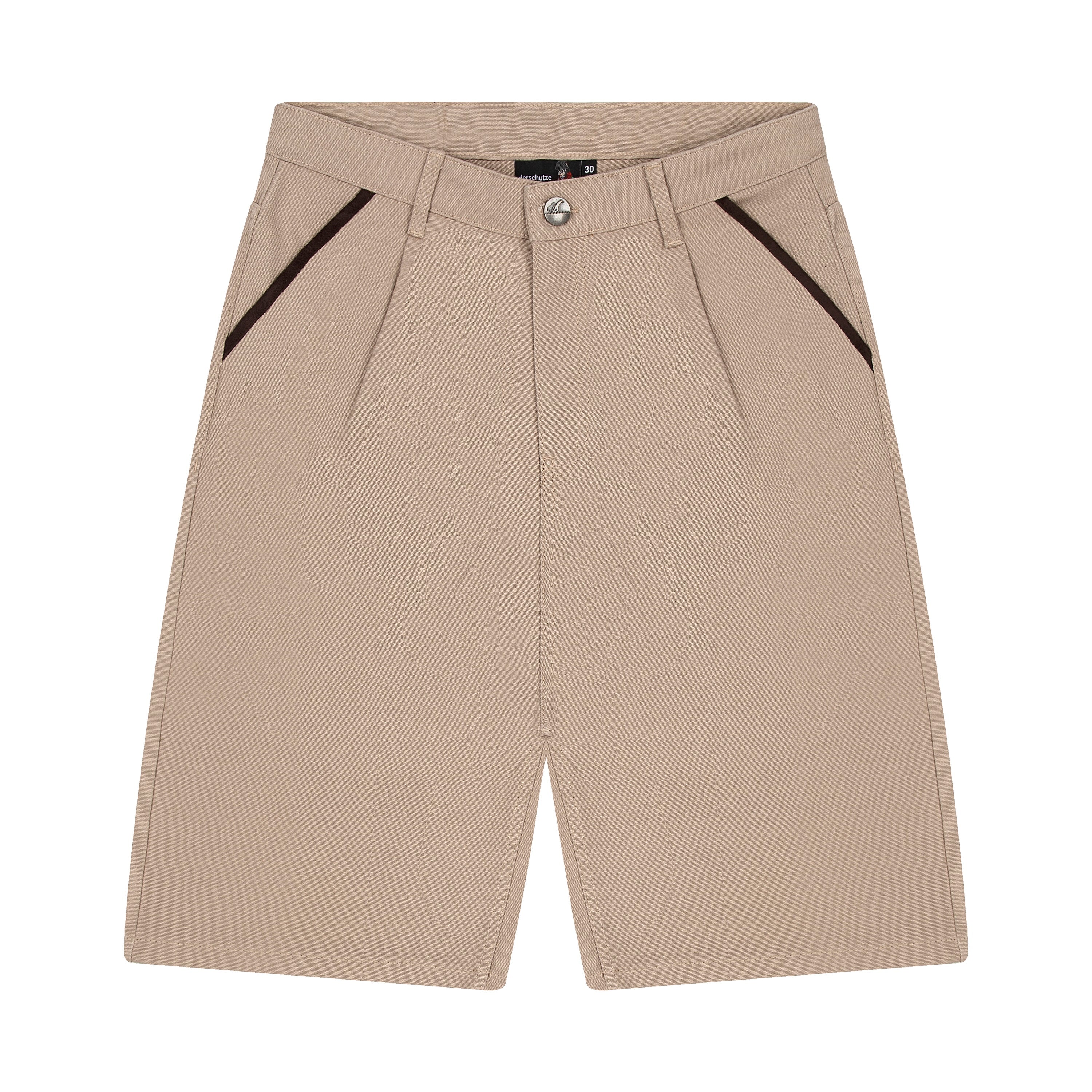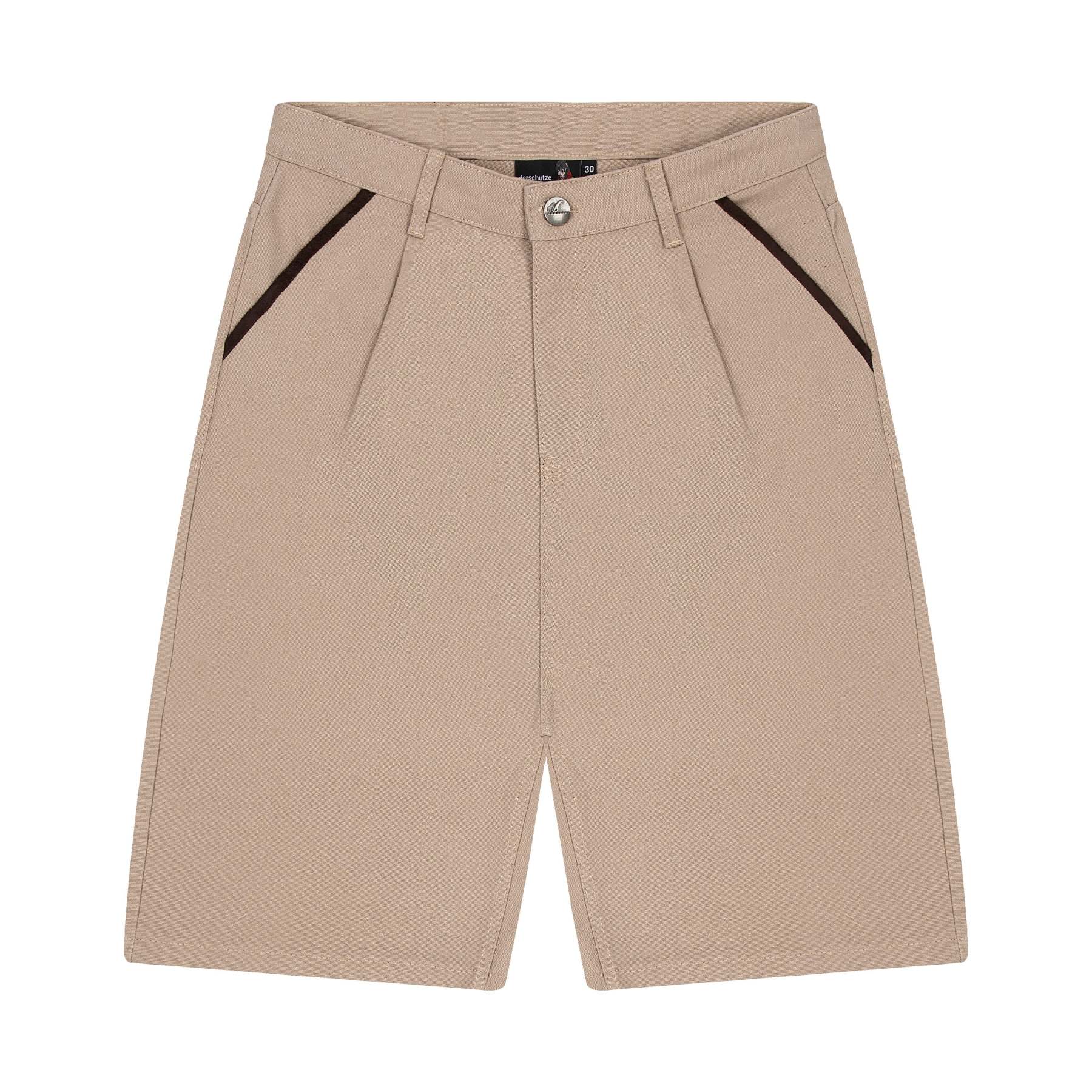 canvas fabric / 100% cotton / vegan suede leather details on front and back pocket openings / embroidery on back pocket / deboss printed leather patch / darts on front / custom button / fits true to size