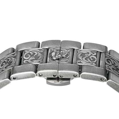 solid stainless steel with a brushed gunmetal finish and engraved pattern on bracelet and dial / JAPANESE MIYOTA 8215 automatic movement / rotating unique revolver cylinder motif with 6 chambers and a golden bullet-style detail / luminous effect / up to 10 ATM (waterproof) / approx. 43mm