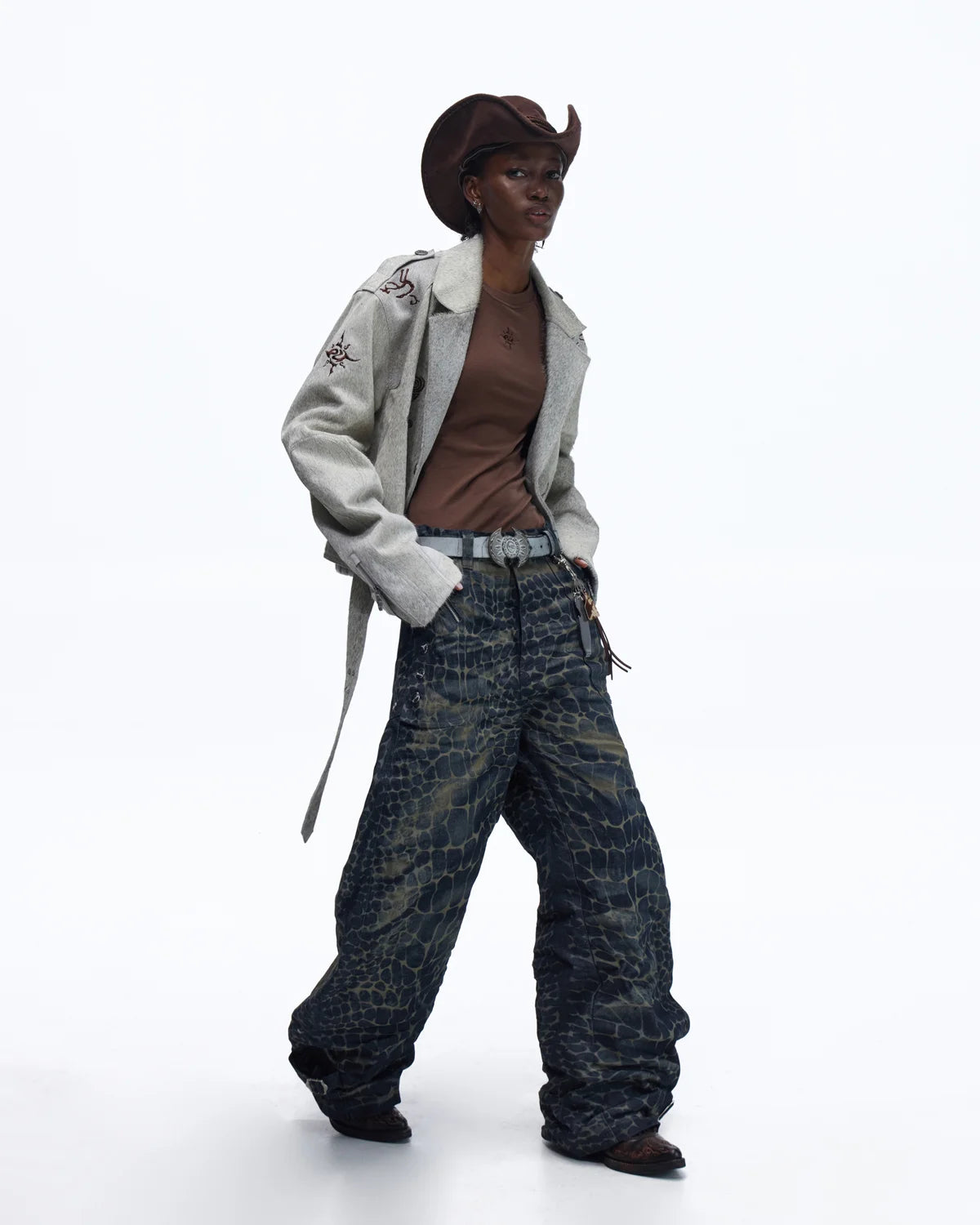 Personsoul Laser-Etched Crocodile-Patterned Raw Denim Curved Jeans