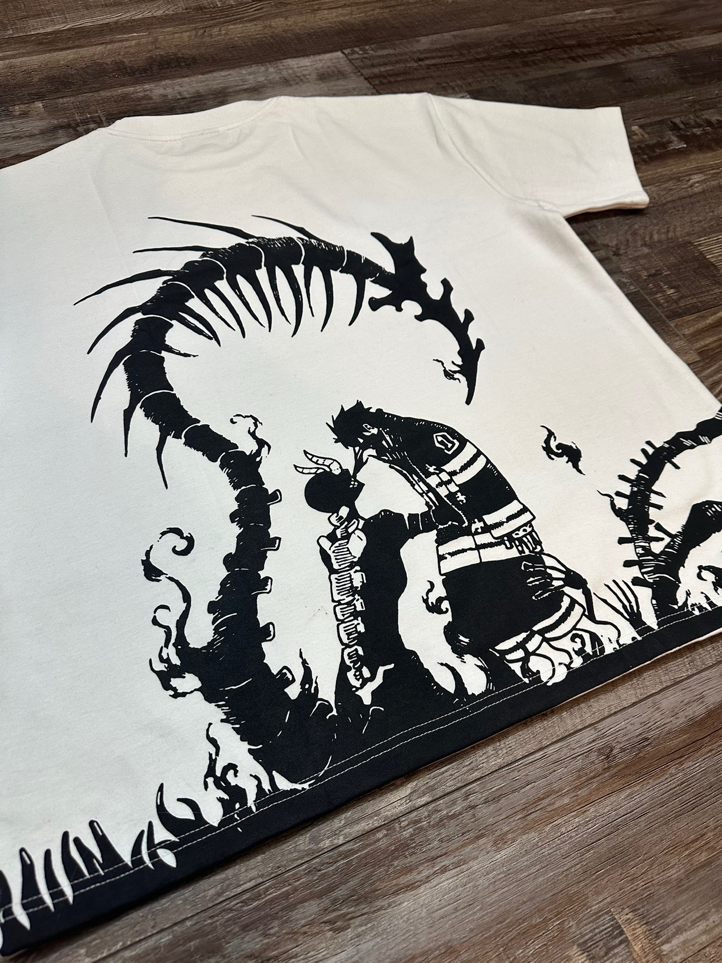 Minimal totem logo on the front; large dark silhouette print on the back.