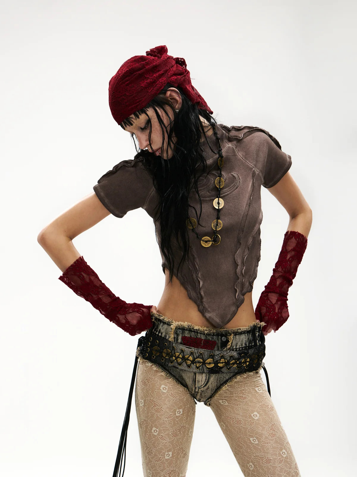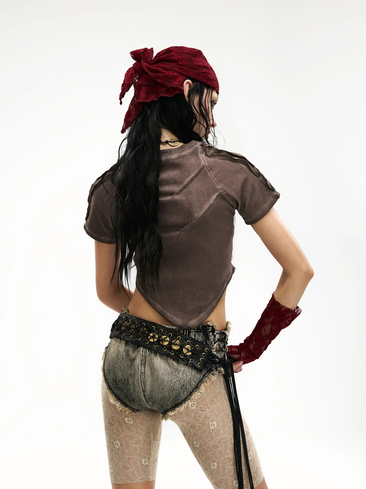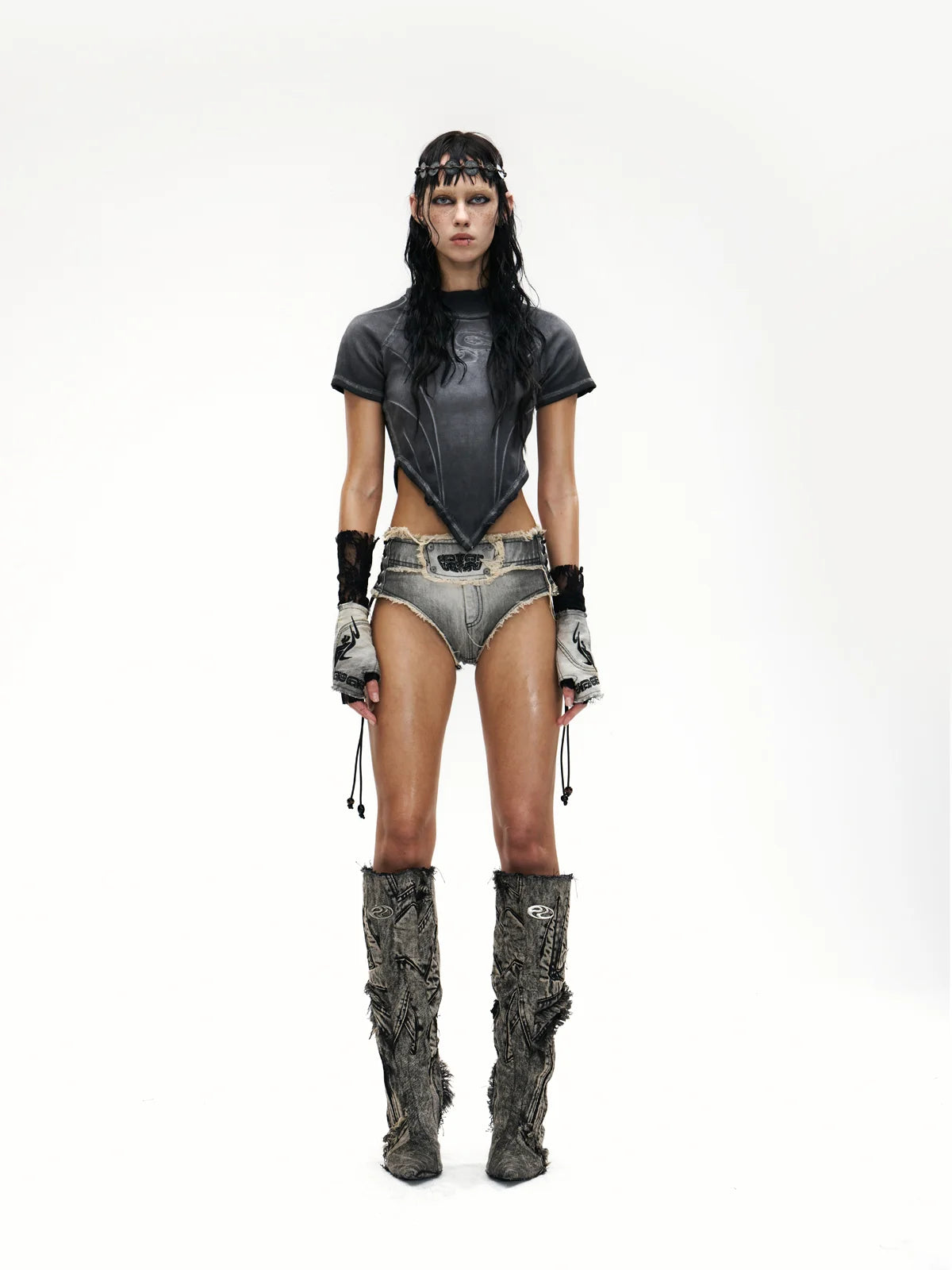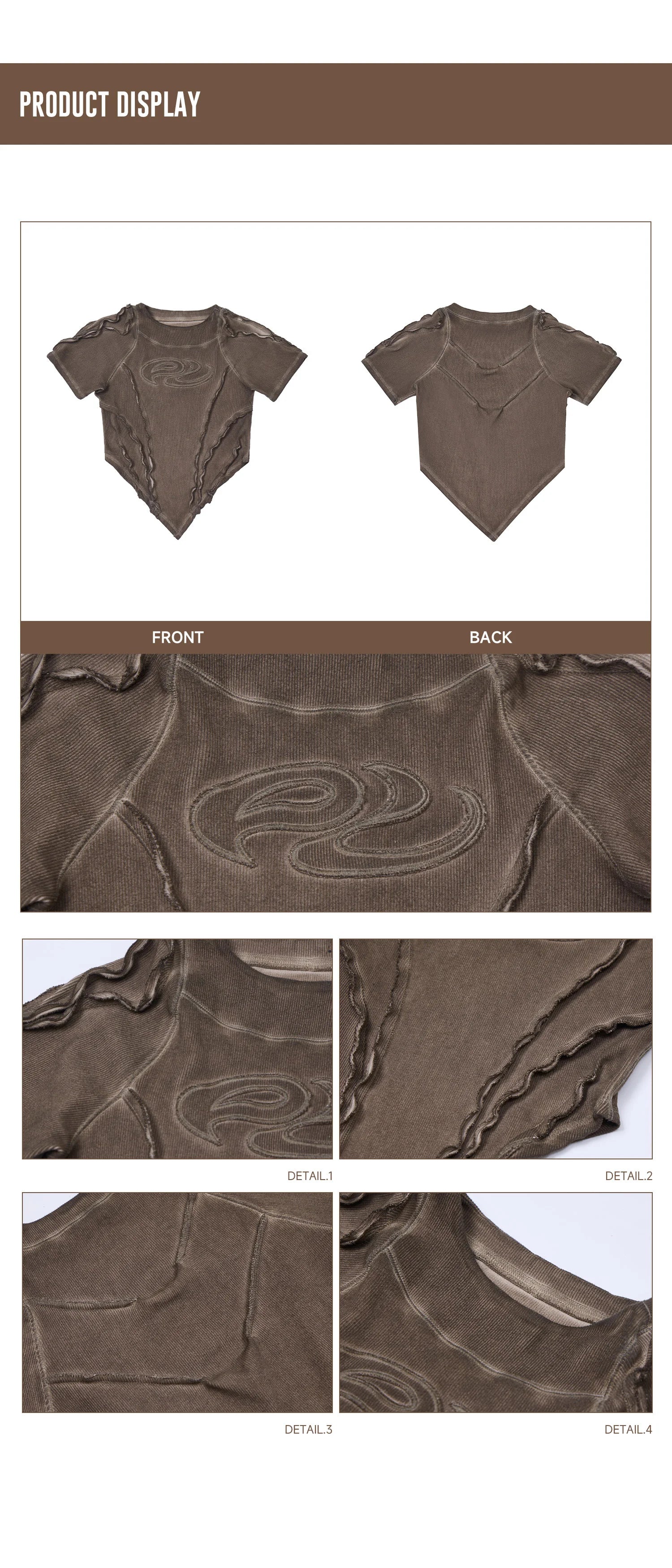 • Slim Fit.• 100% Cotton.• Applique Embroidery.• V-Shaped Hem.• Washed And Distressed.• Raw edge stitching.