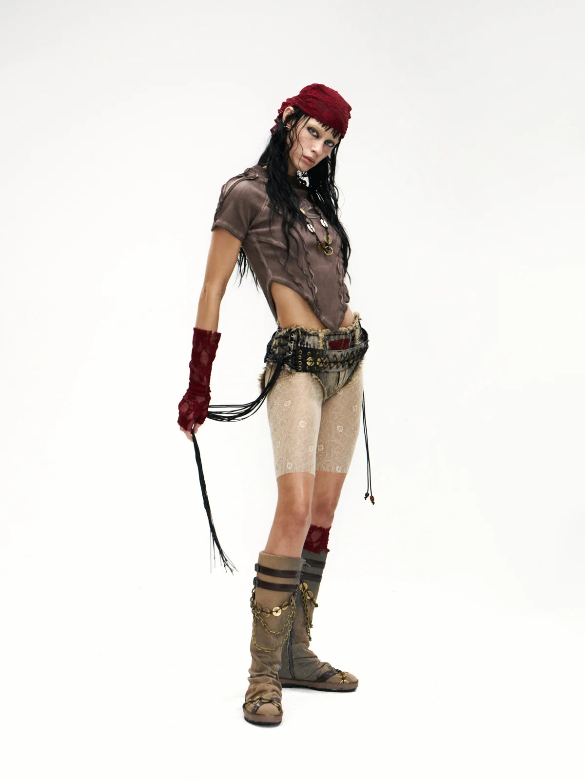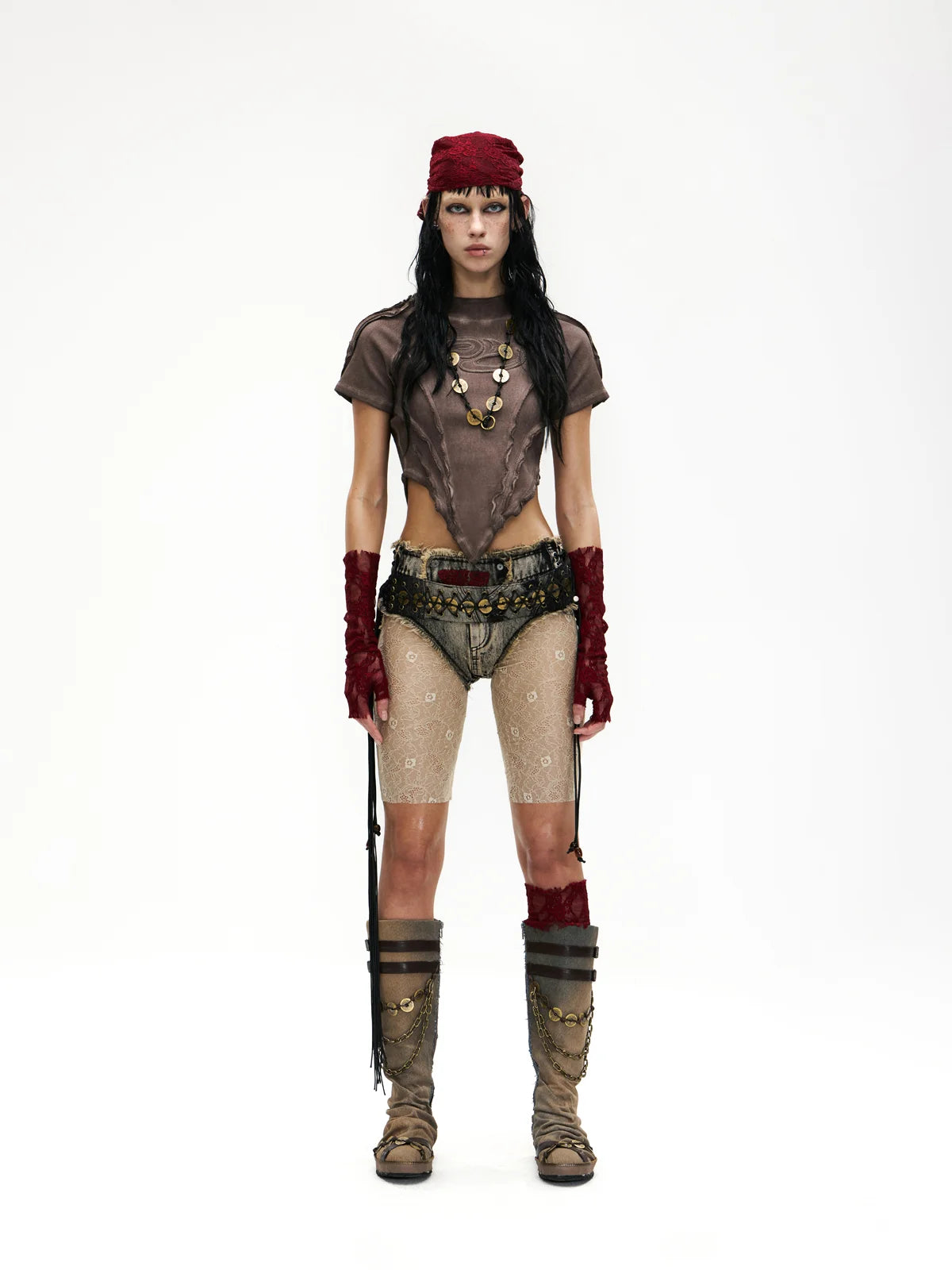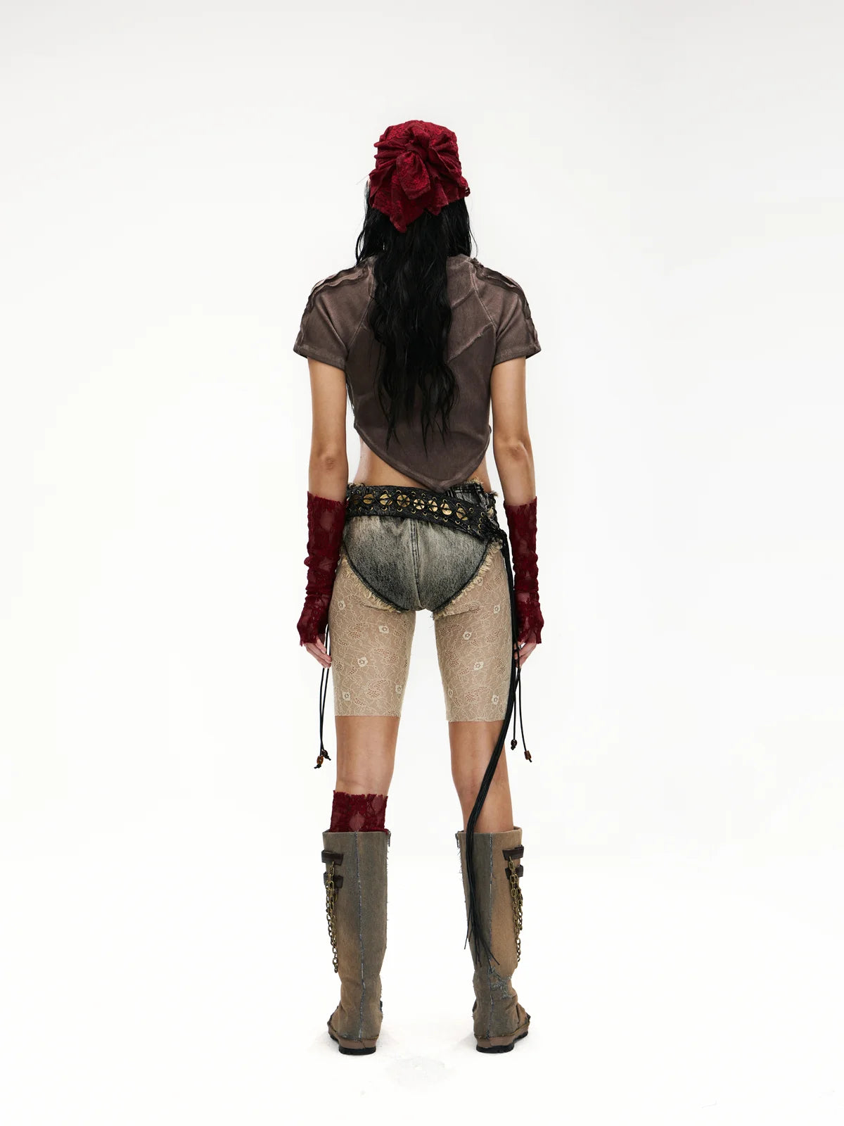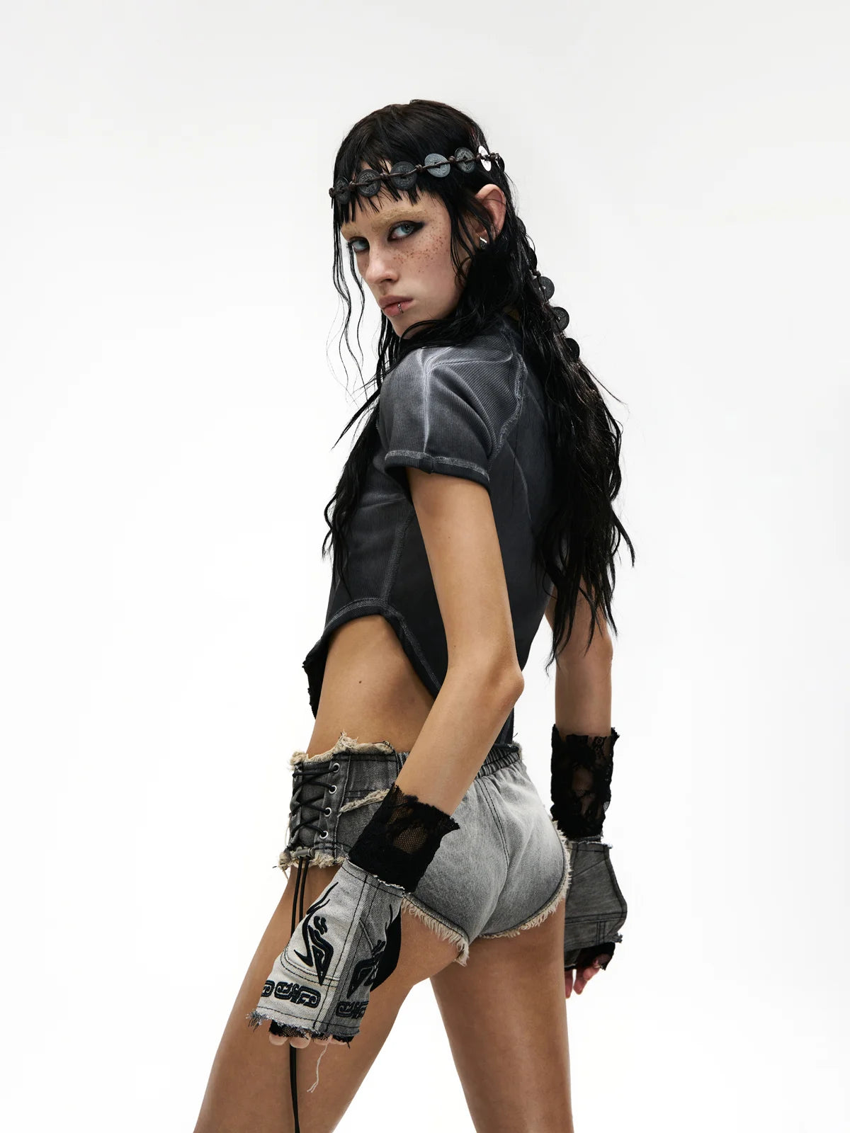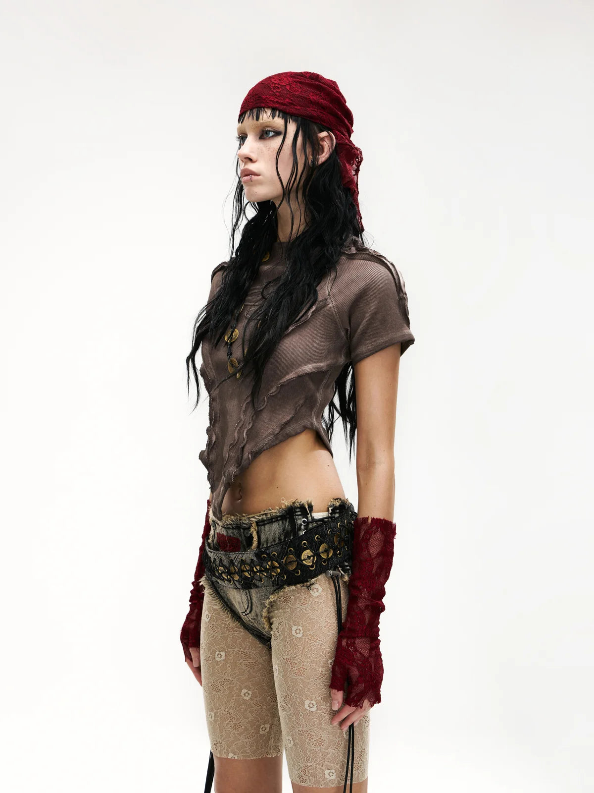 • Slim Fit.• 100% Cotton.• Applique Embroidery.• V-Shaped Hem.• Washed And Distressed.• Raw edge stitching.
