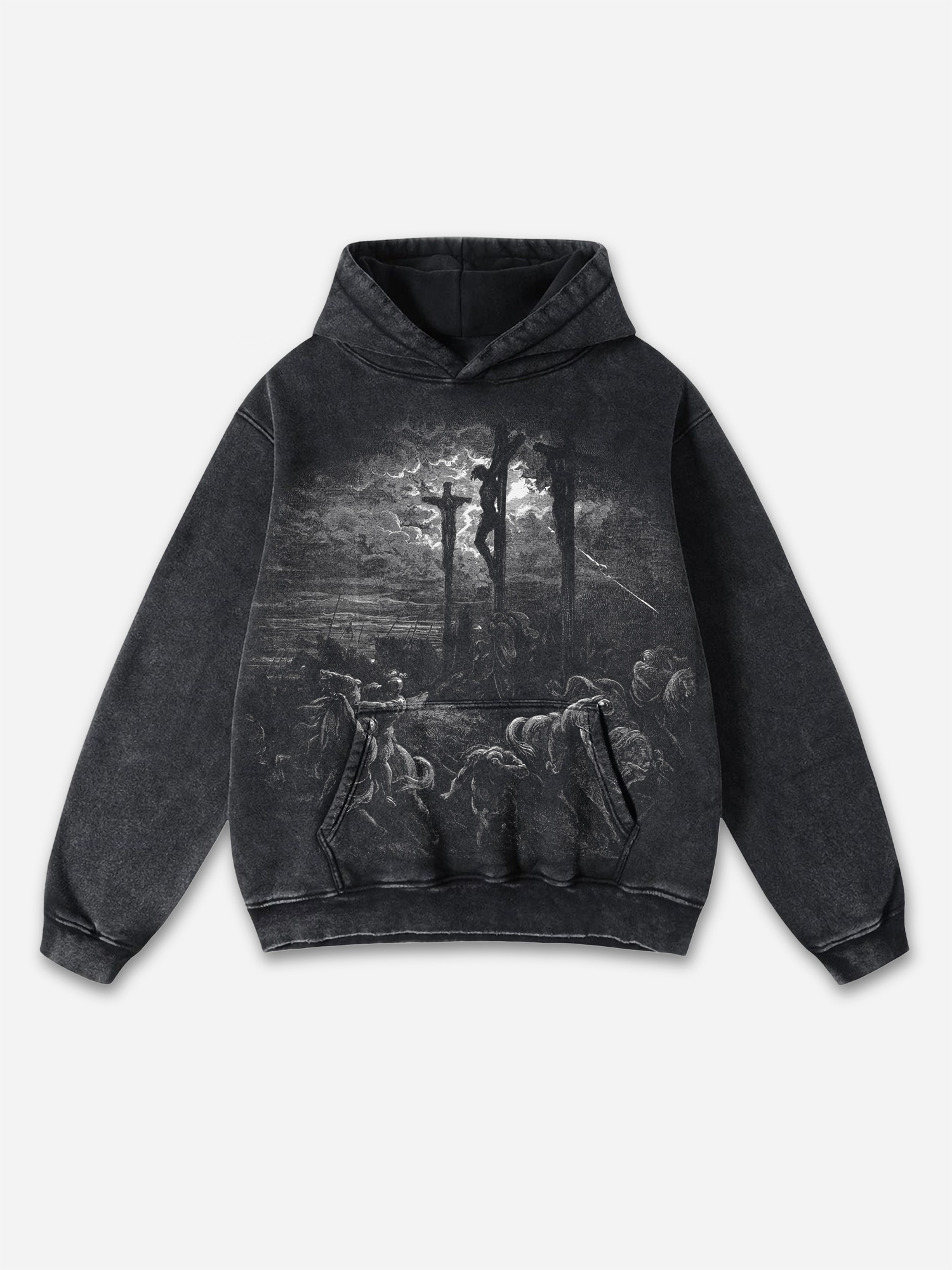 Relaxed Vintage Jesus Cross Print Graphic Casual Street Washed Hoodie