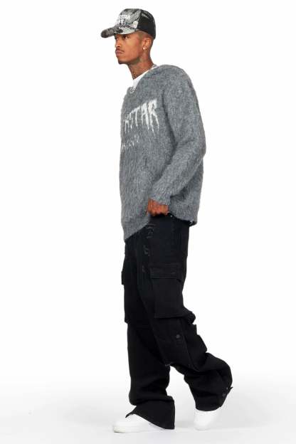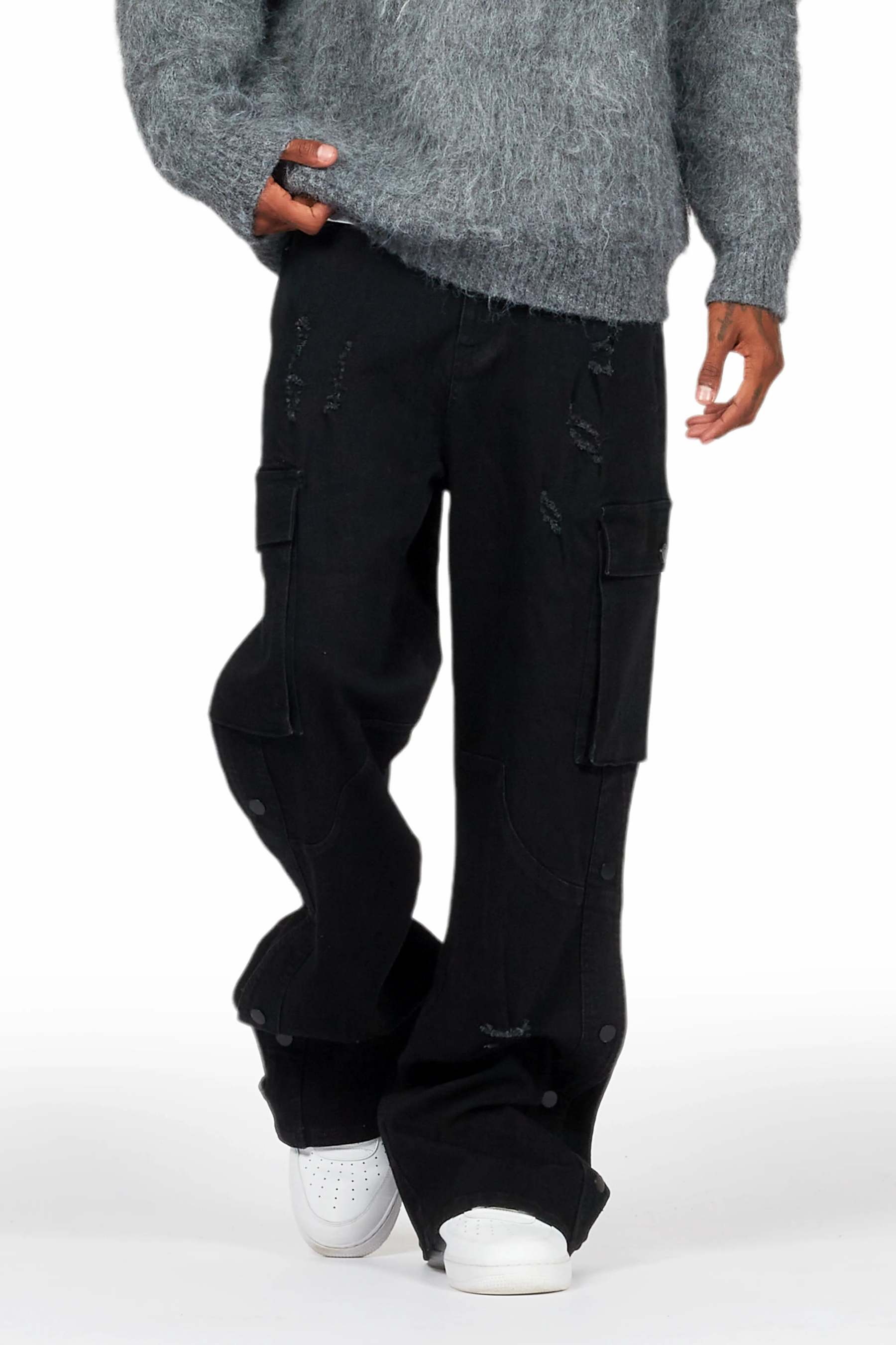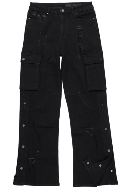An urban cargo baggy jean for men in black. Designed with organic cotton and utility pockets for a dope denim streetwear style.