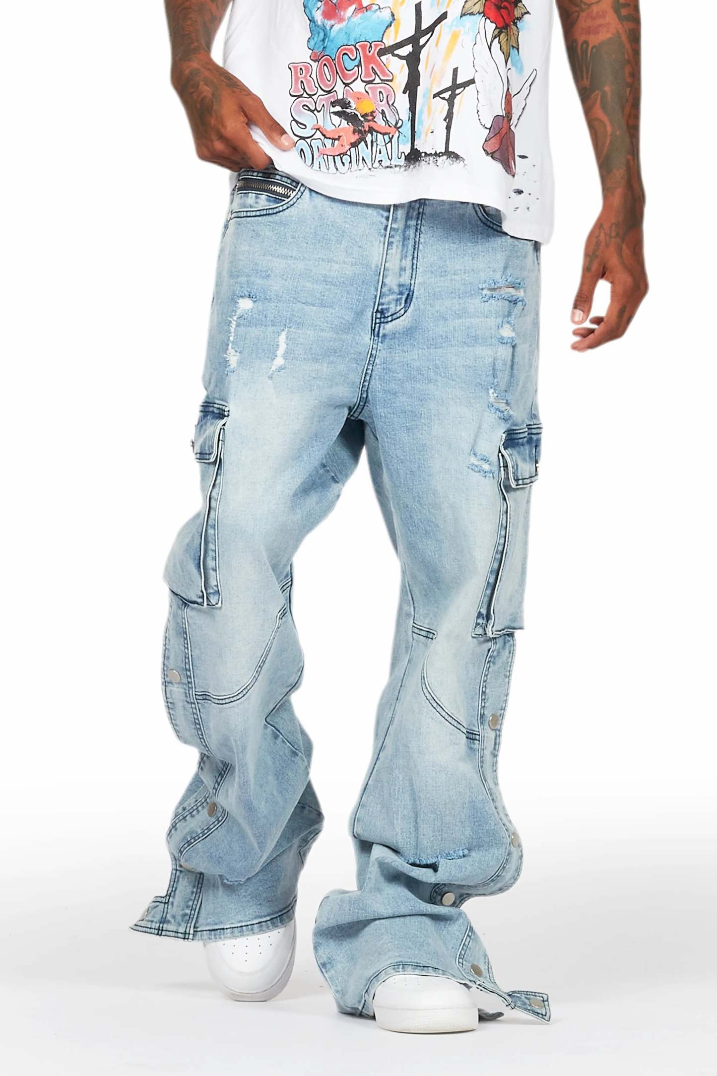 An urban cargo baggy jean for men in light blue. Designed with organic cotton and utility pockets for a dope denim streetwear style.