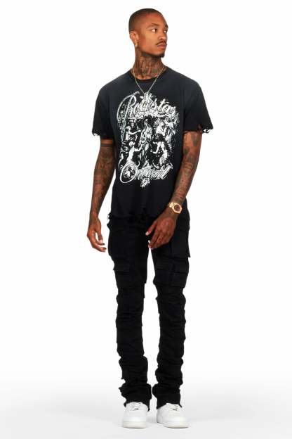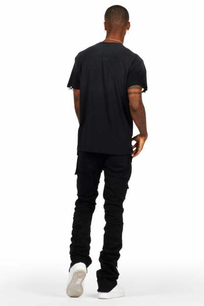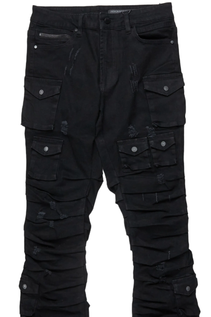 An urban stack denim cargo jean for men in black. Designed with organic cotton and extra long legs for an essential streetwear style.