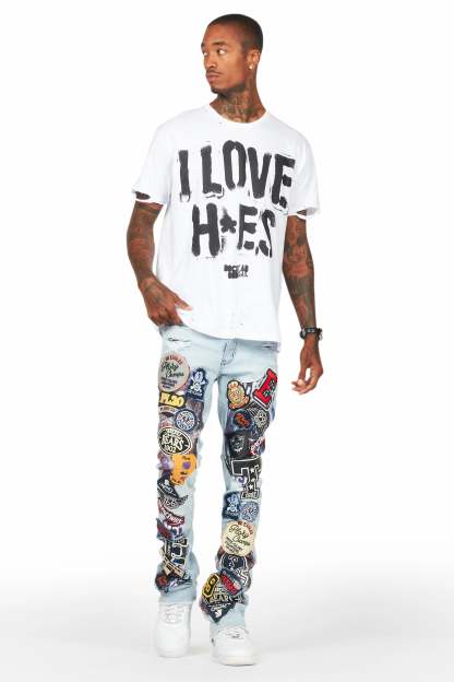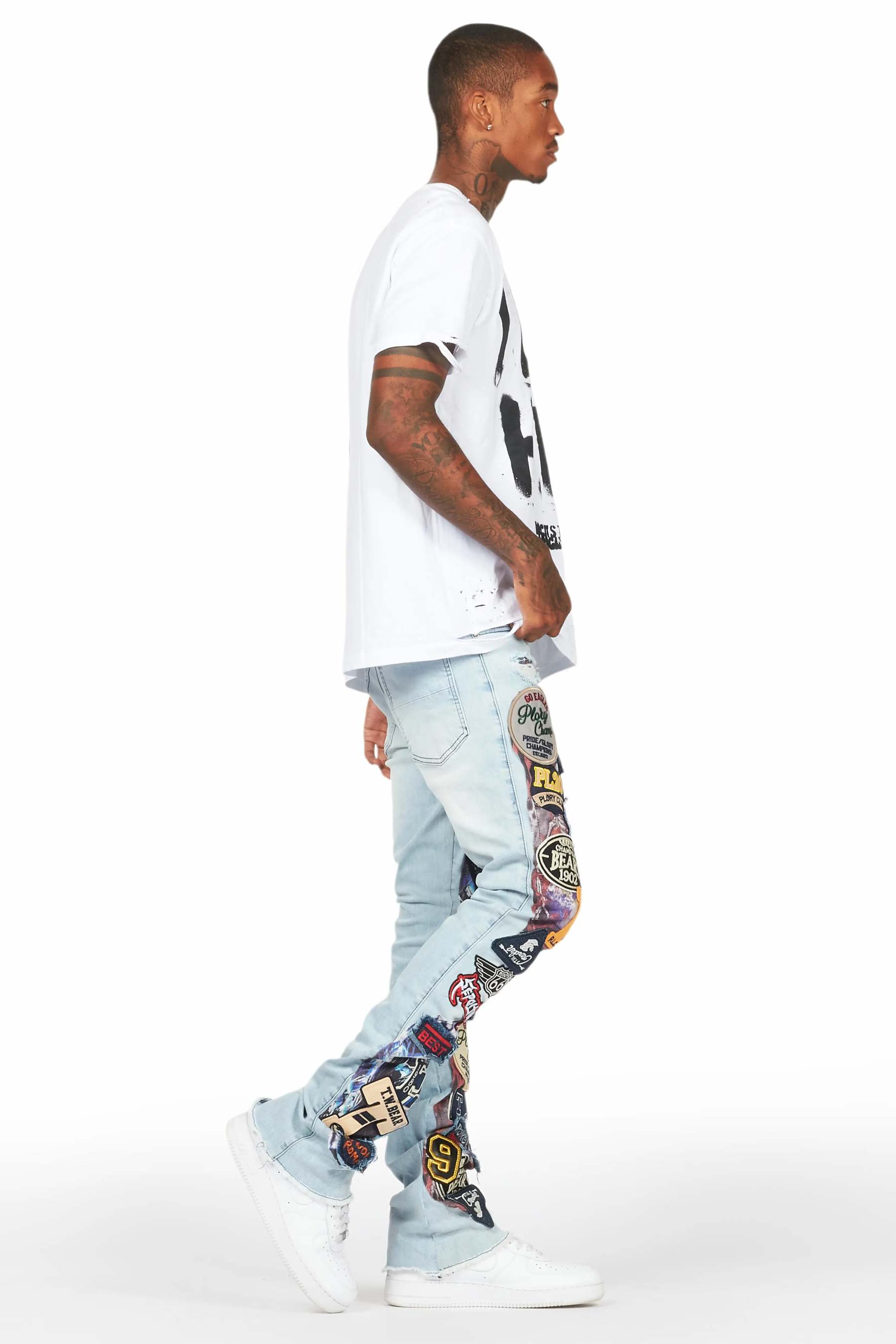 An urban stacked flare denim jean for men in blue. Designed with organic cotton and extra long legs for an essential streetwear style.