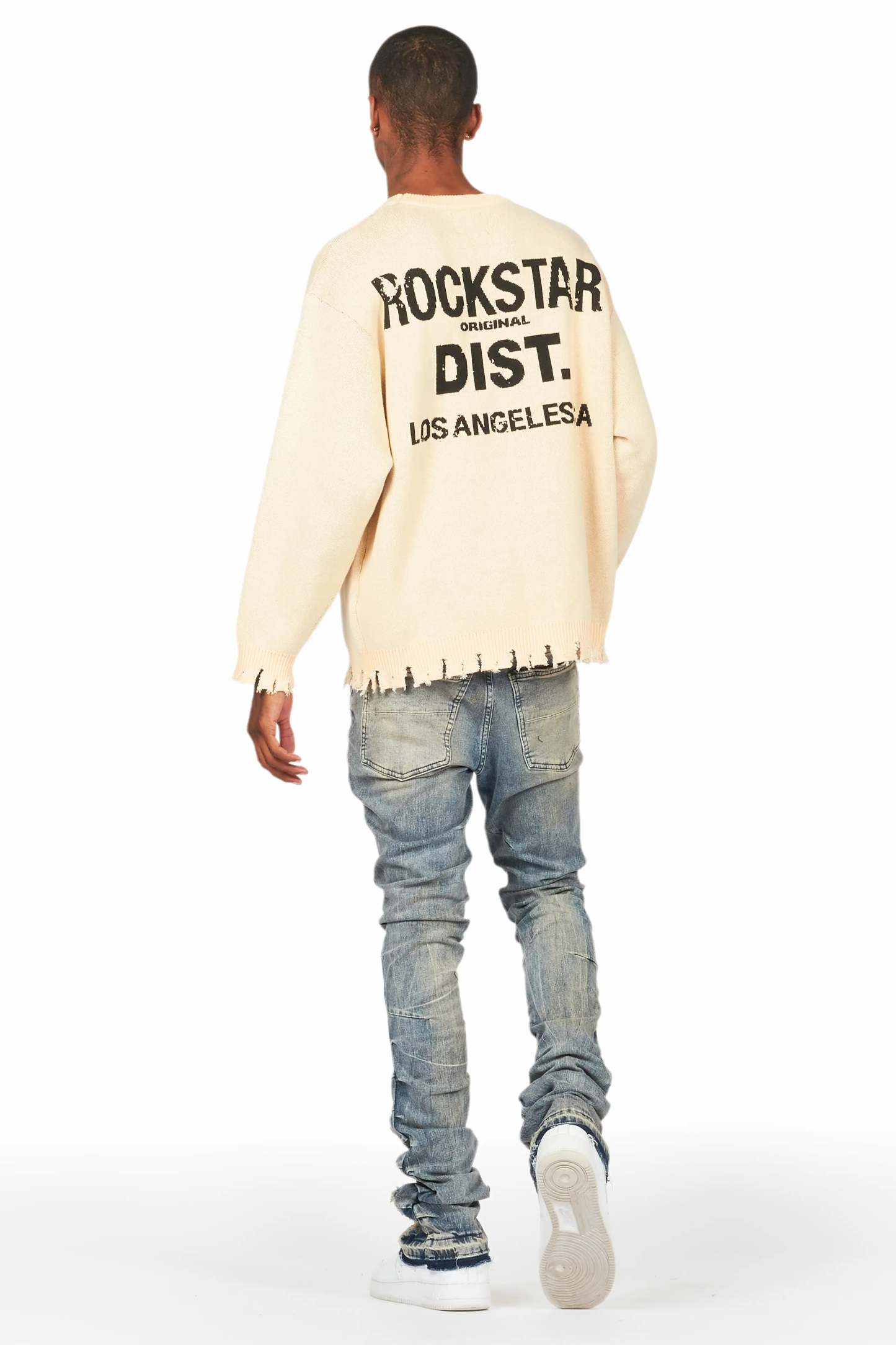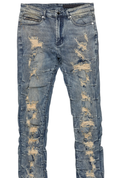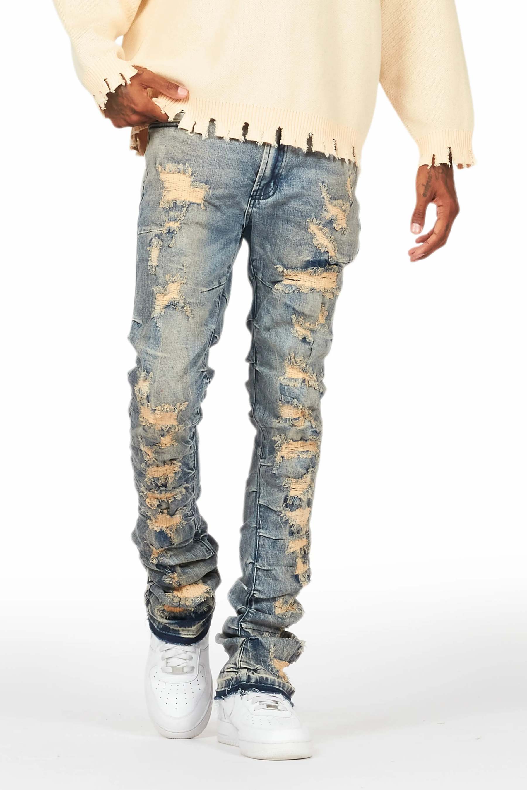 An urban stack denim jean for men in blue. Designed with organic cotton and extra long legs for an essential streetwear style.