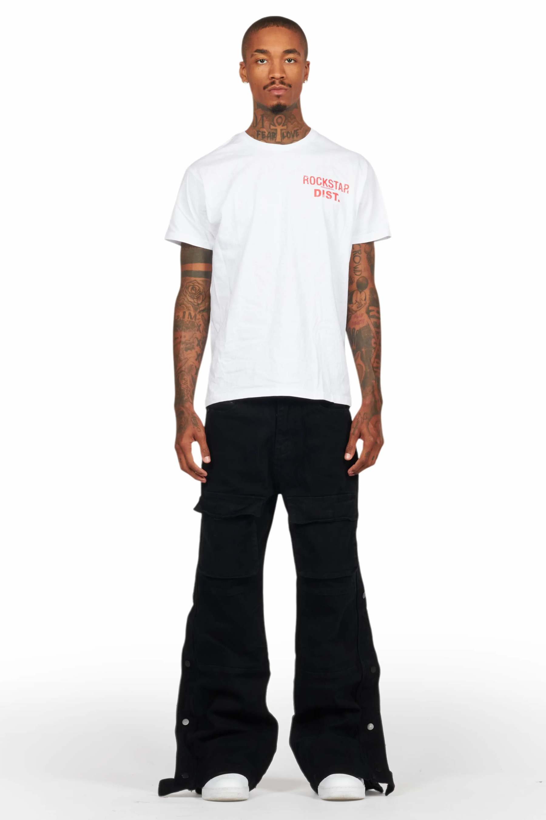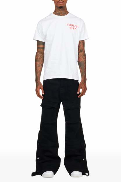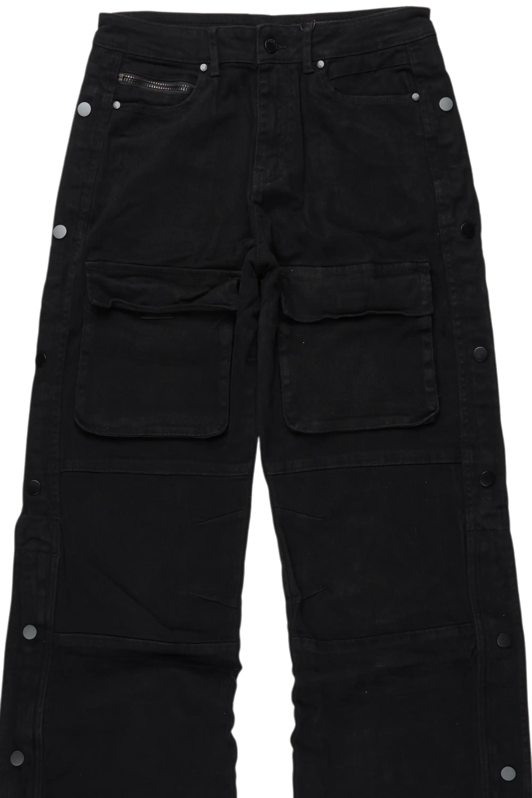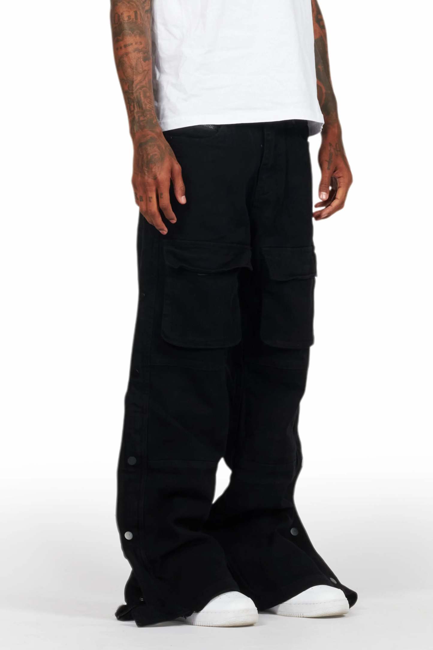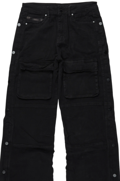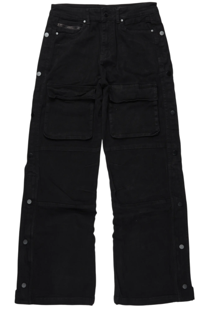 An urban stacked parachute cargo jean for men in black. Designed with organic cotton and button down side closures for a versatile streetwear style.