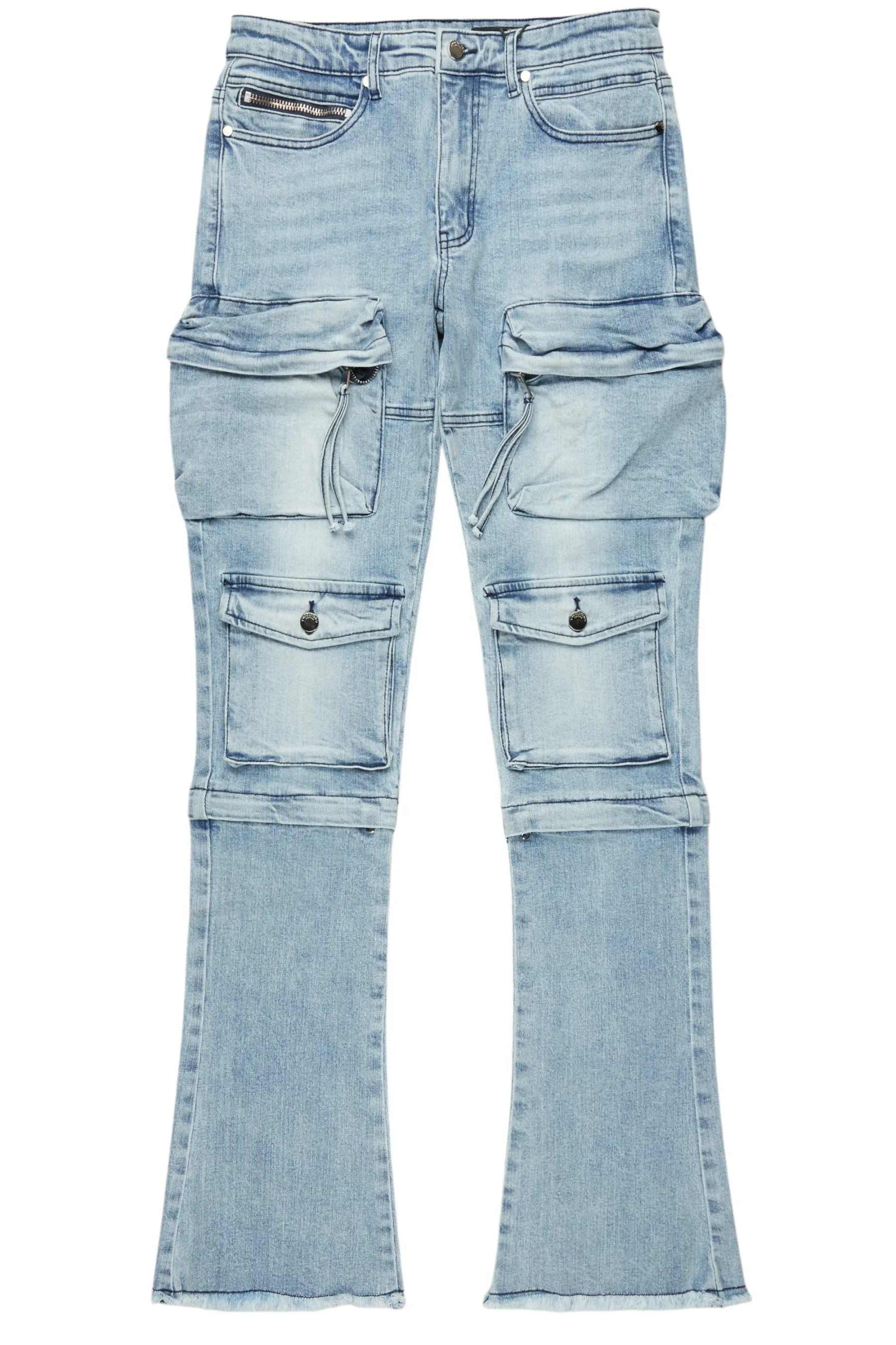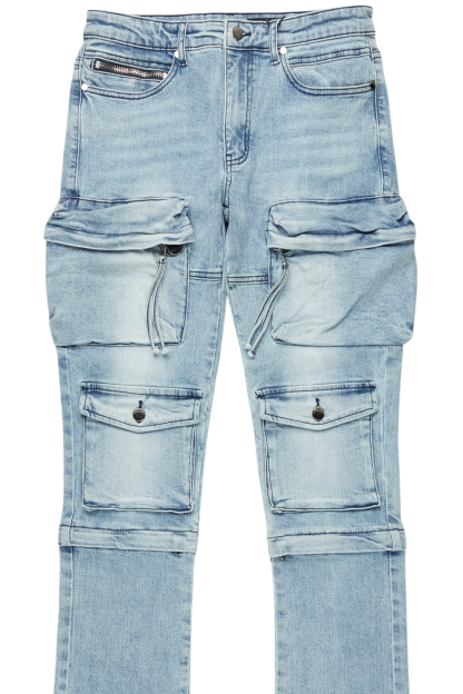 An urban stack denim cargo jean for men in blue. Designed with organic cotton and extra long legs for an essential streetwear style.