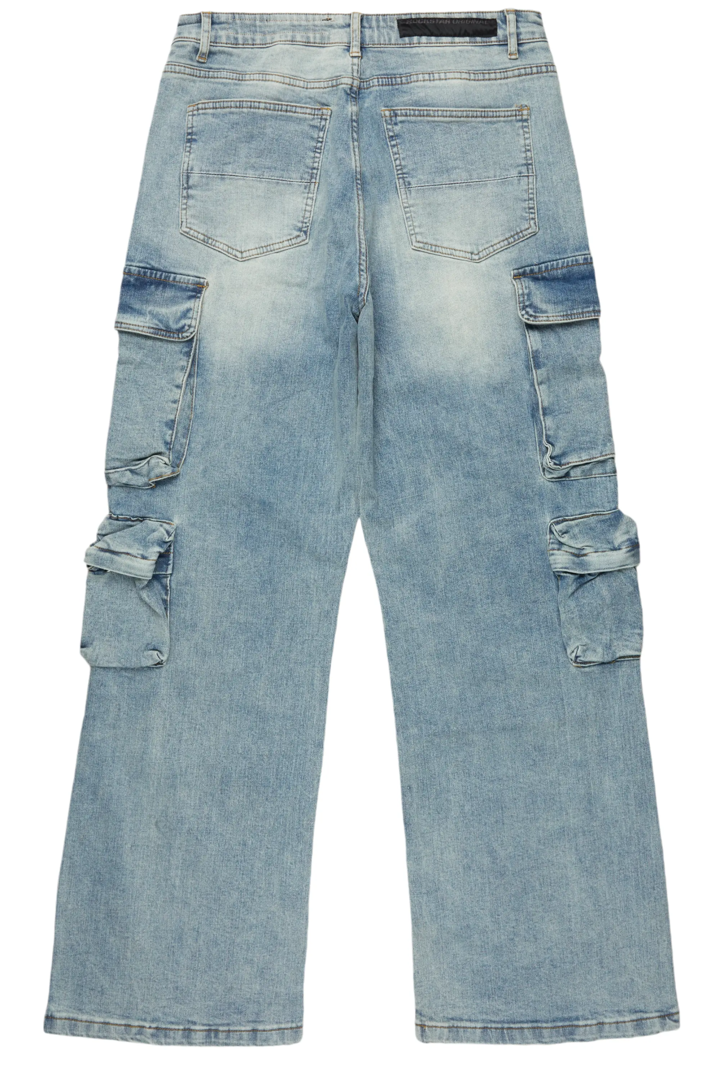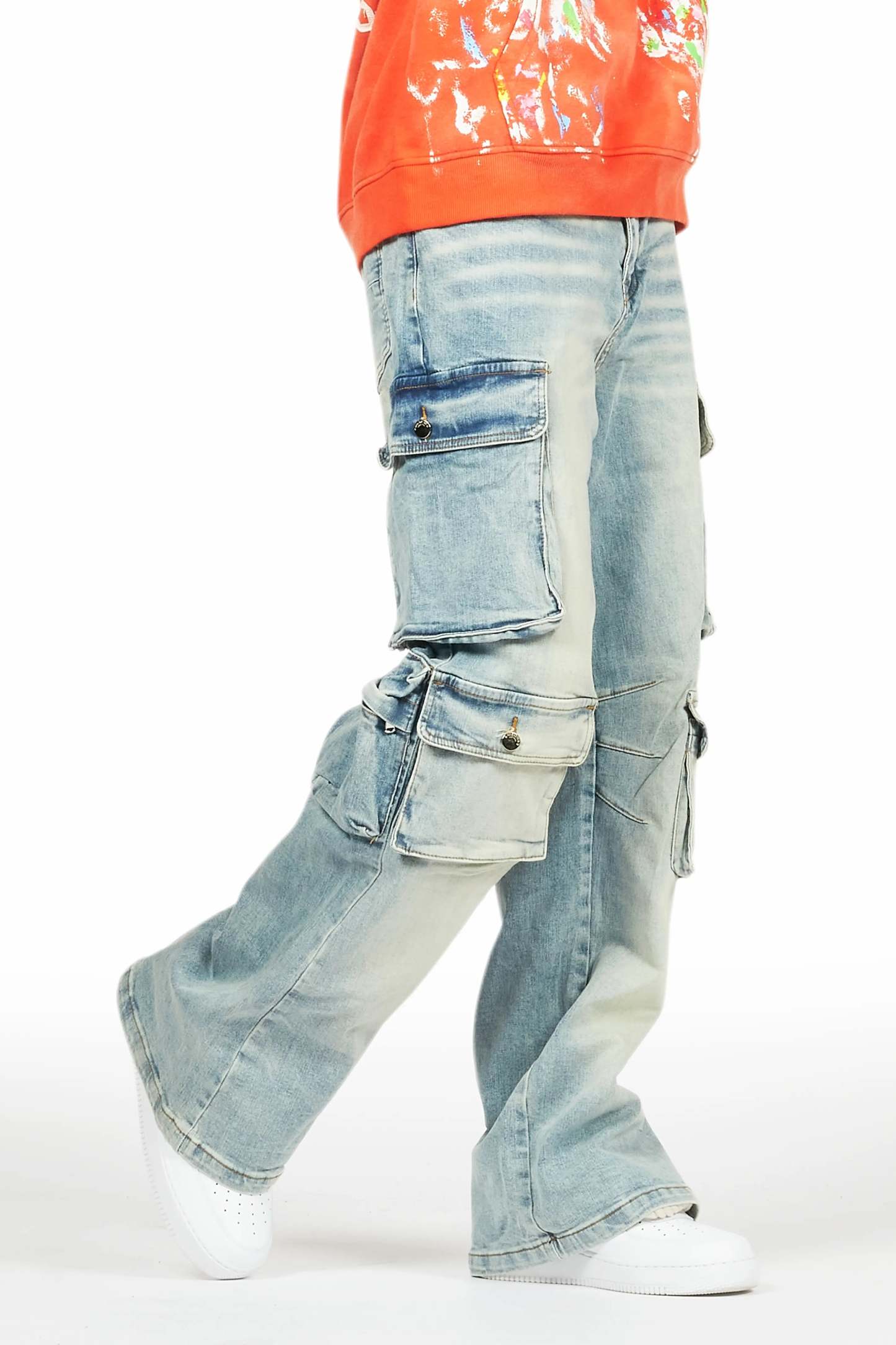 An urban cargo baggy jean for men in blue. Designed with organic cotton and utility pockets for a dope denim streetwear style.