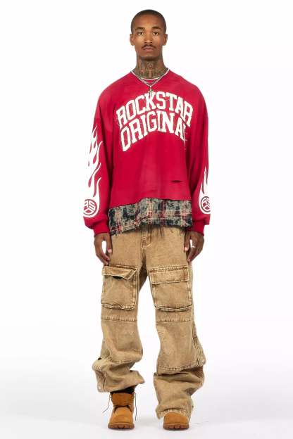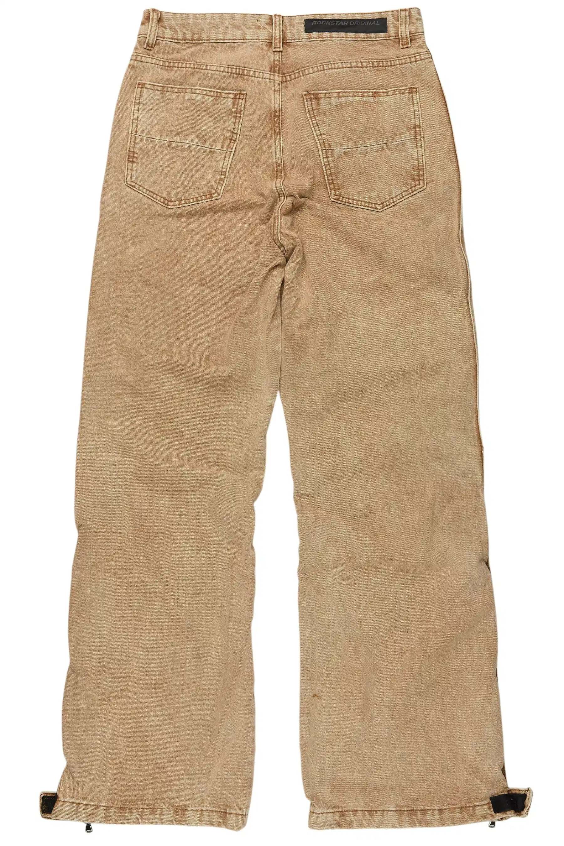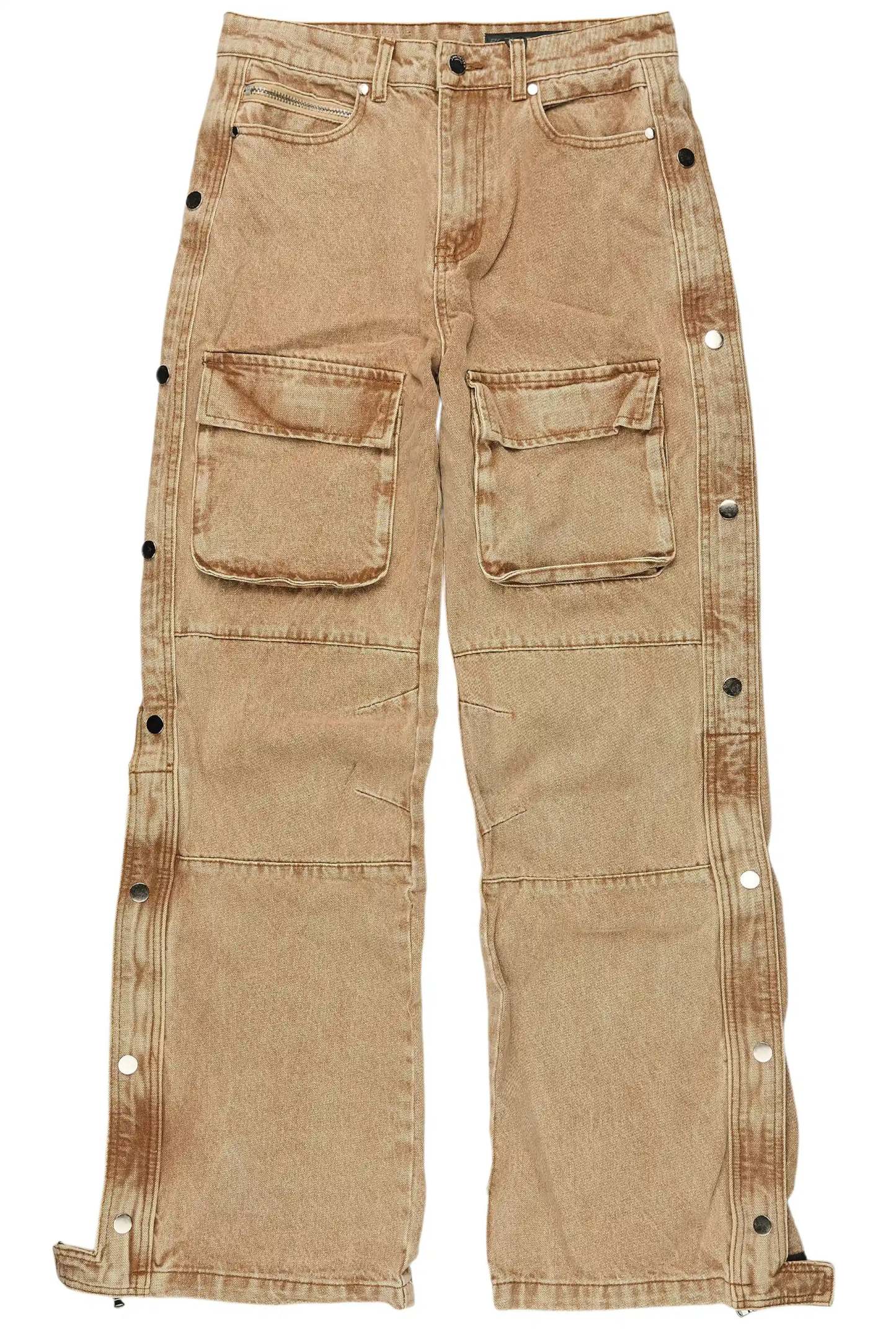 An urban stacked parachute cargo jean for men in beige. Designed with organic cotton and button down side closures for a versatile streetwear style.
