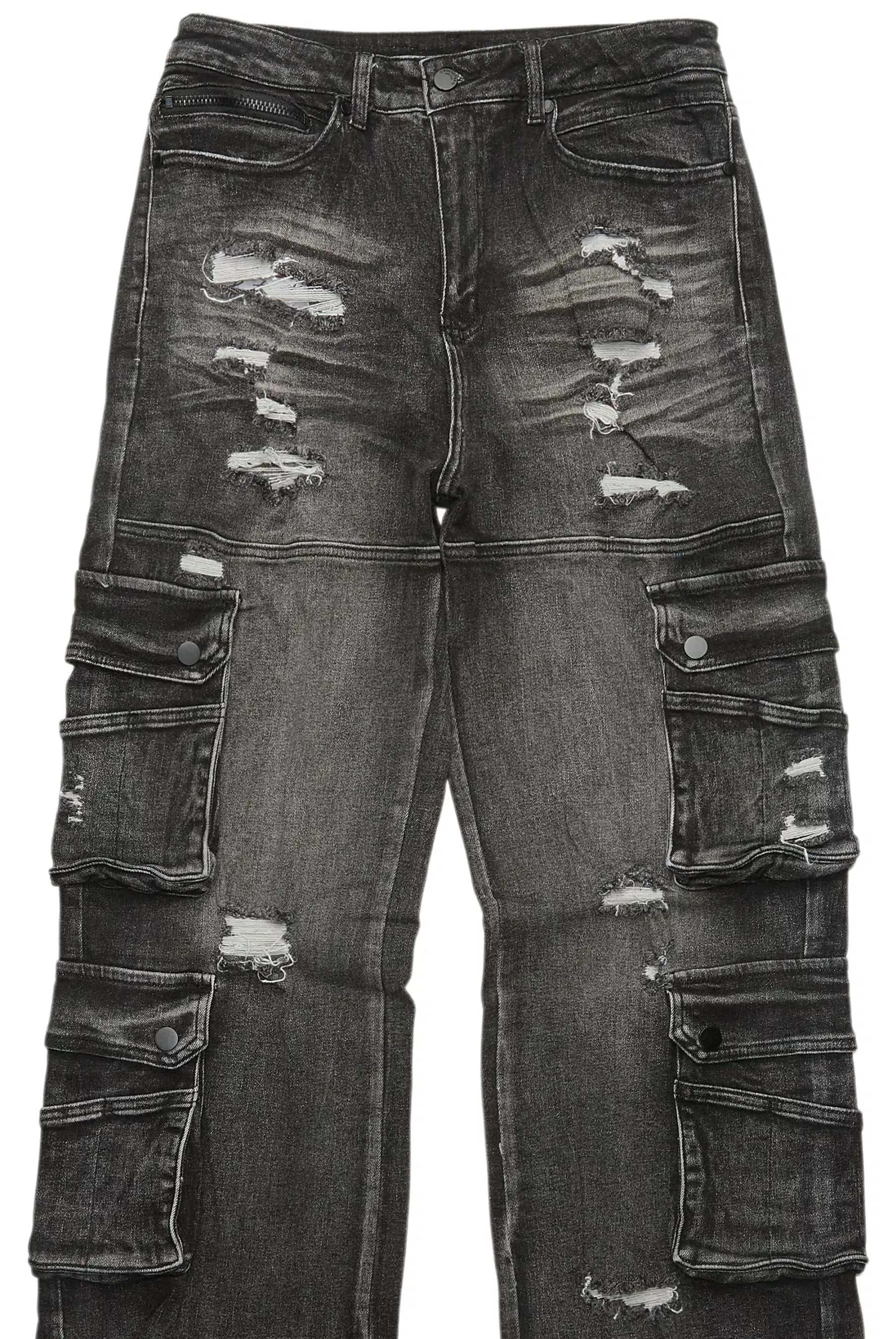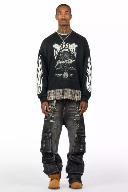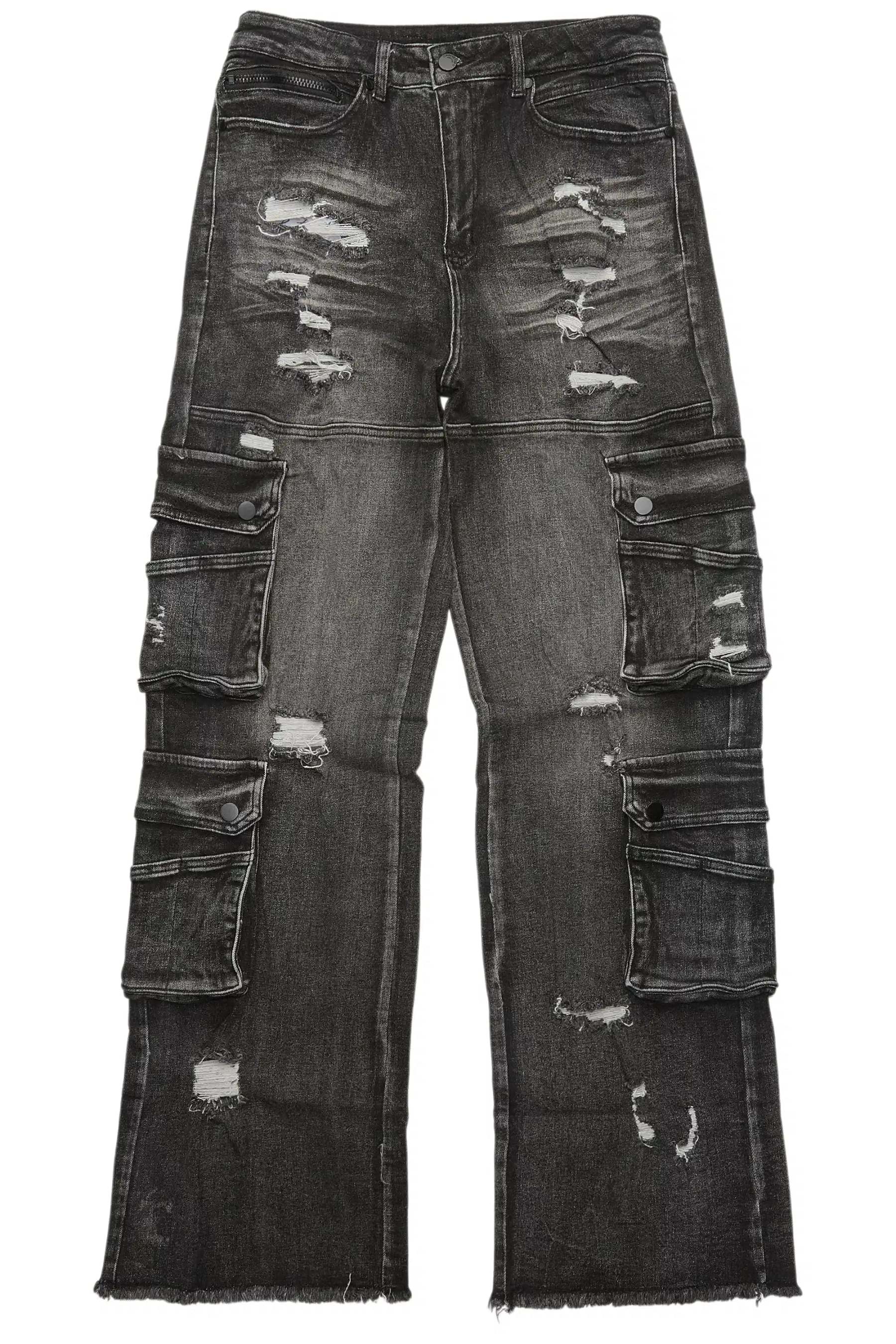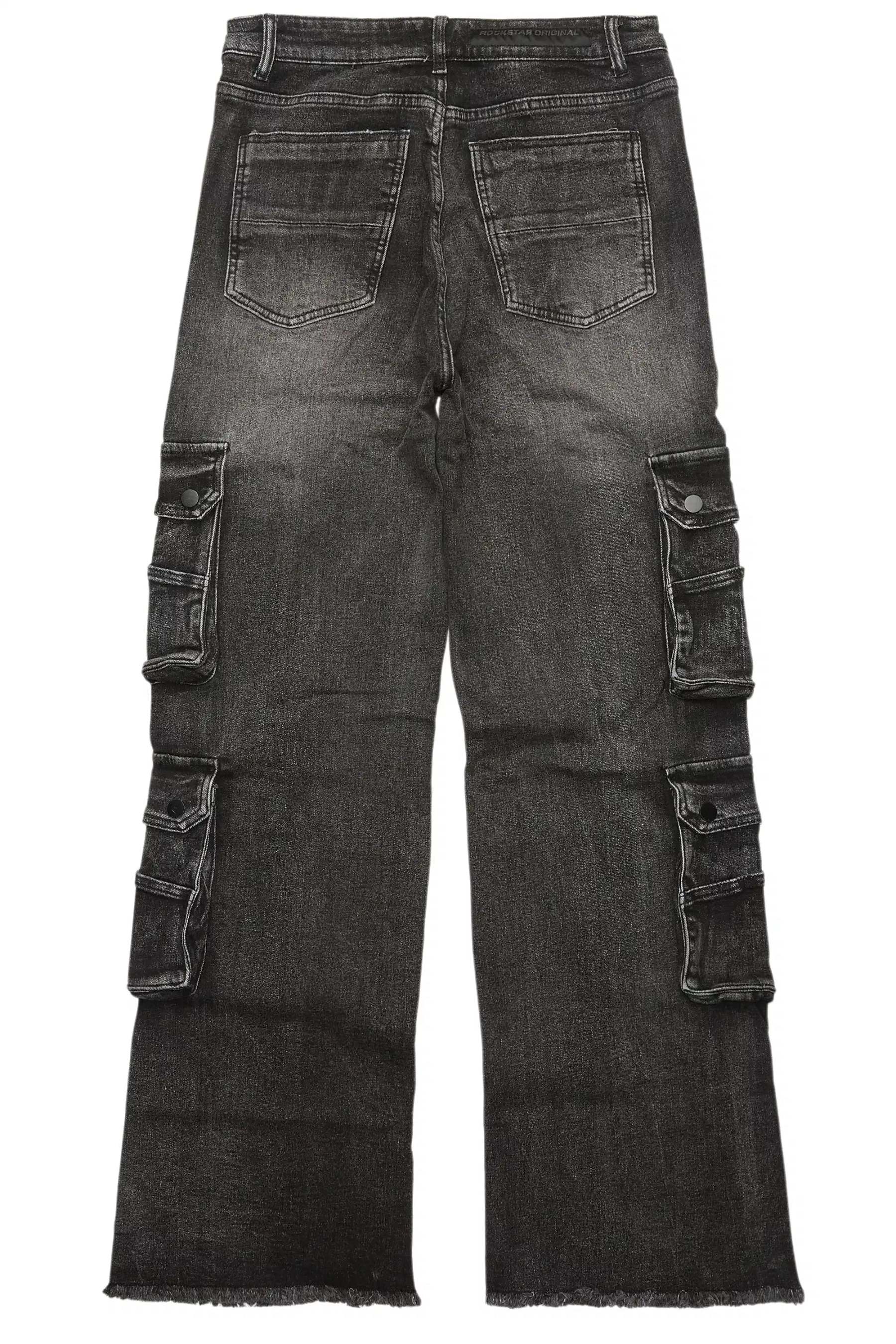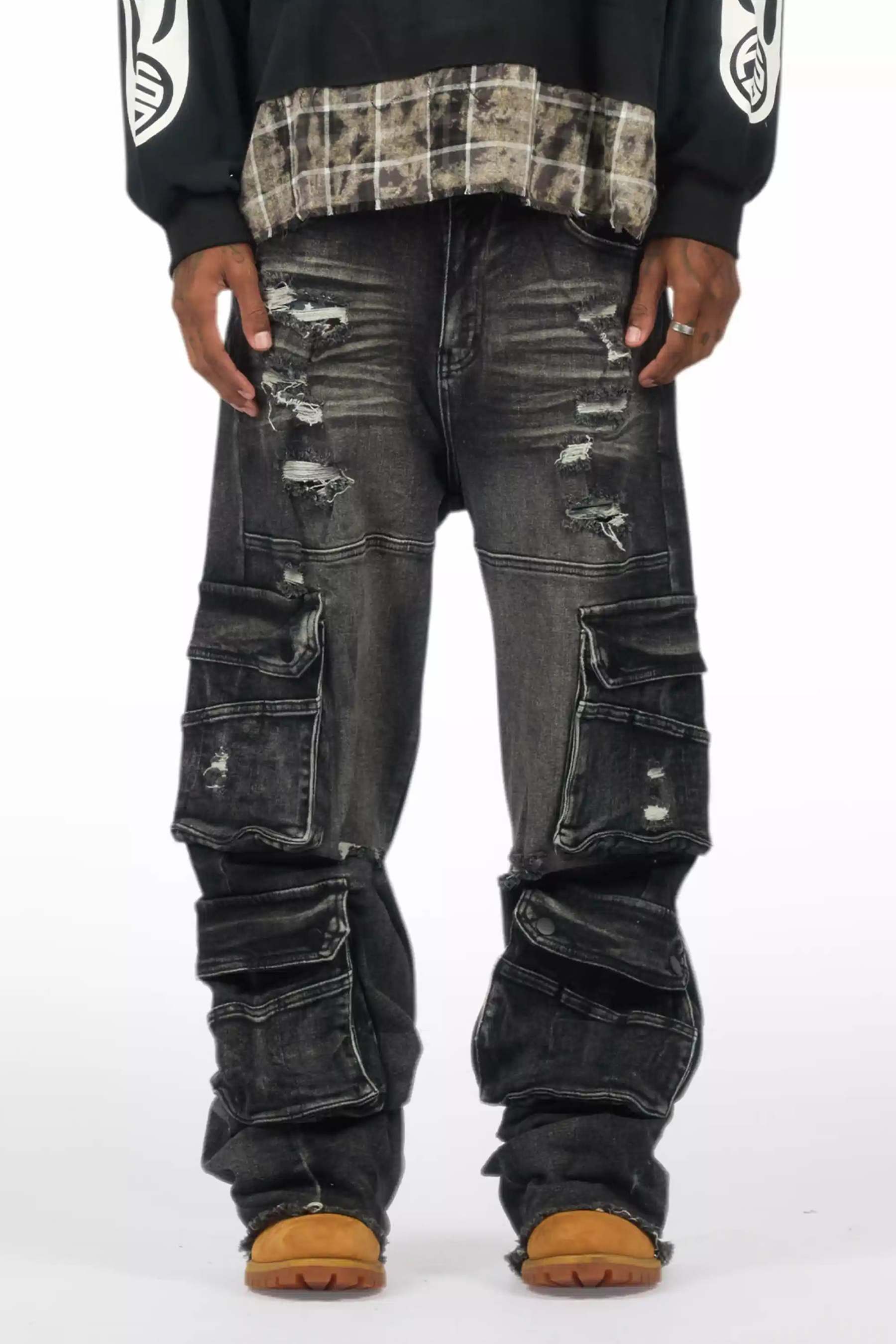 An urban jet black baggy cargo jean for men. Designed with premium fabric and an oversized-fit for an essential streetwear style.