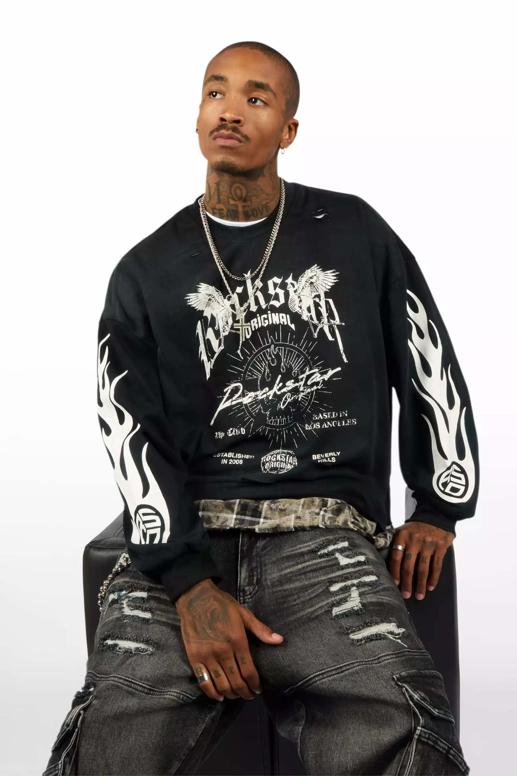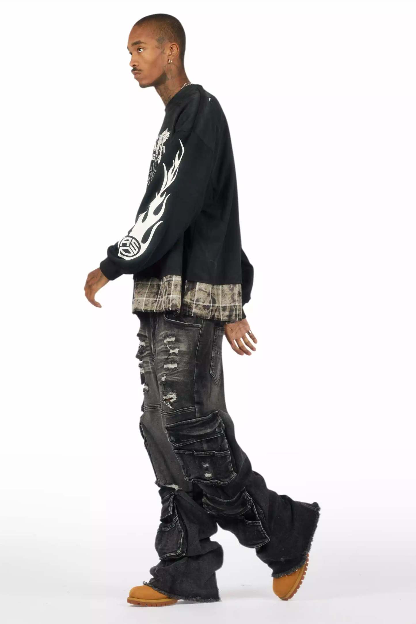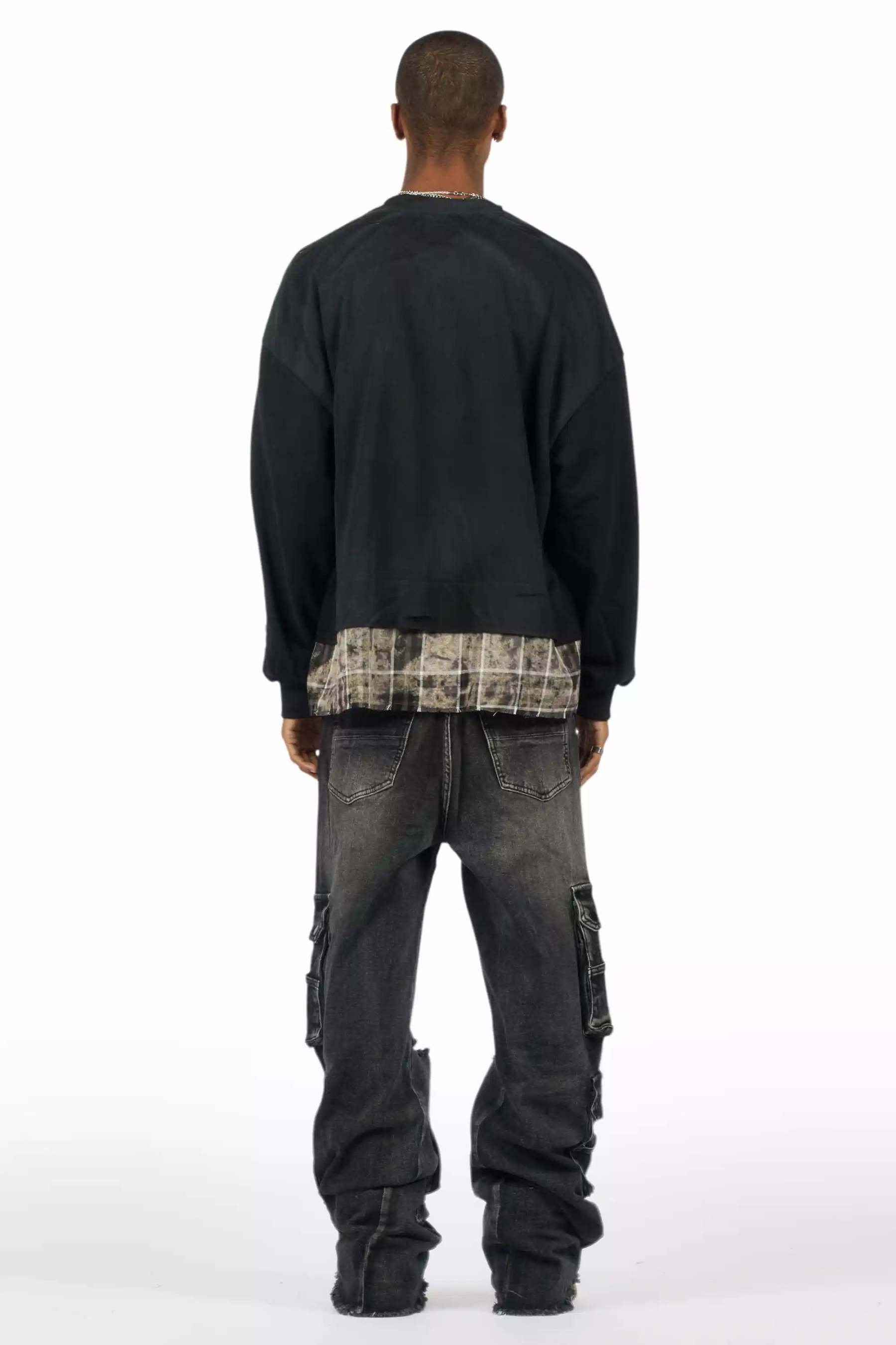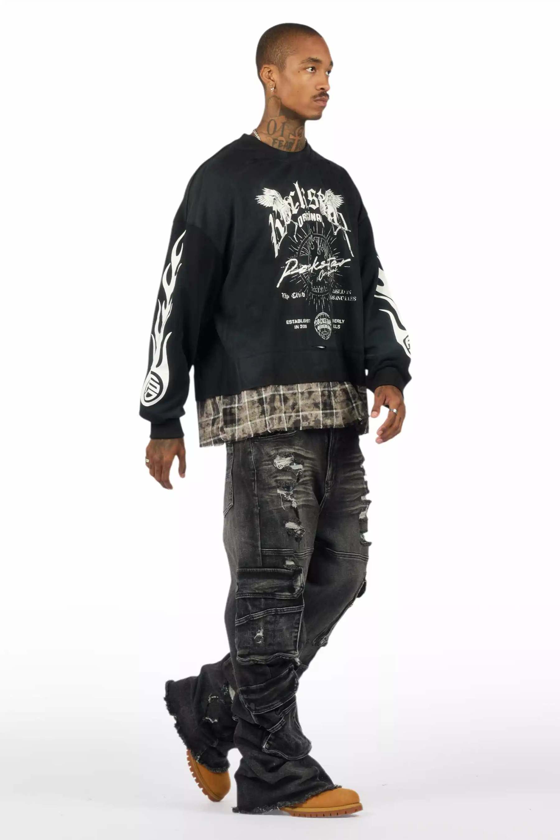 An urban jet black baggy cargo jean for men. Designed with premium fabric and an oversized-fit for an essential streetwear style.
