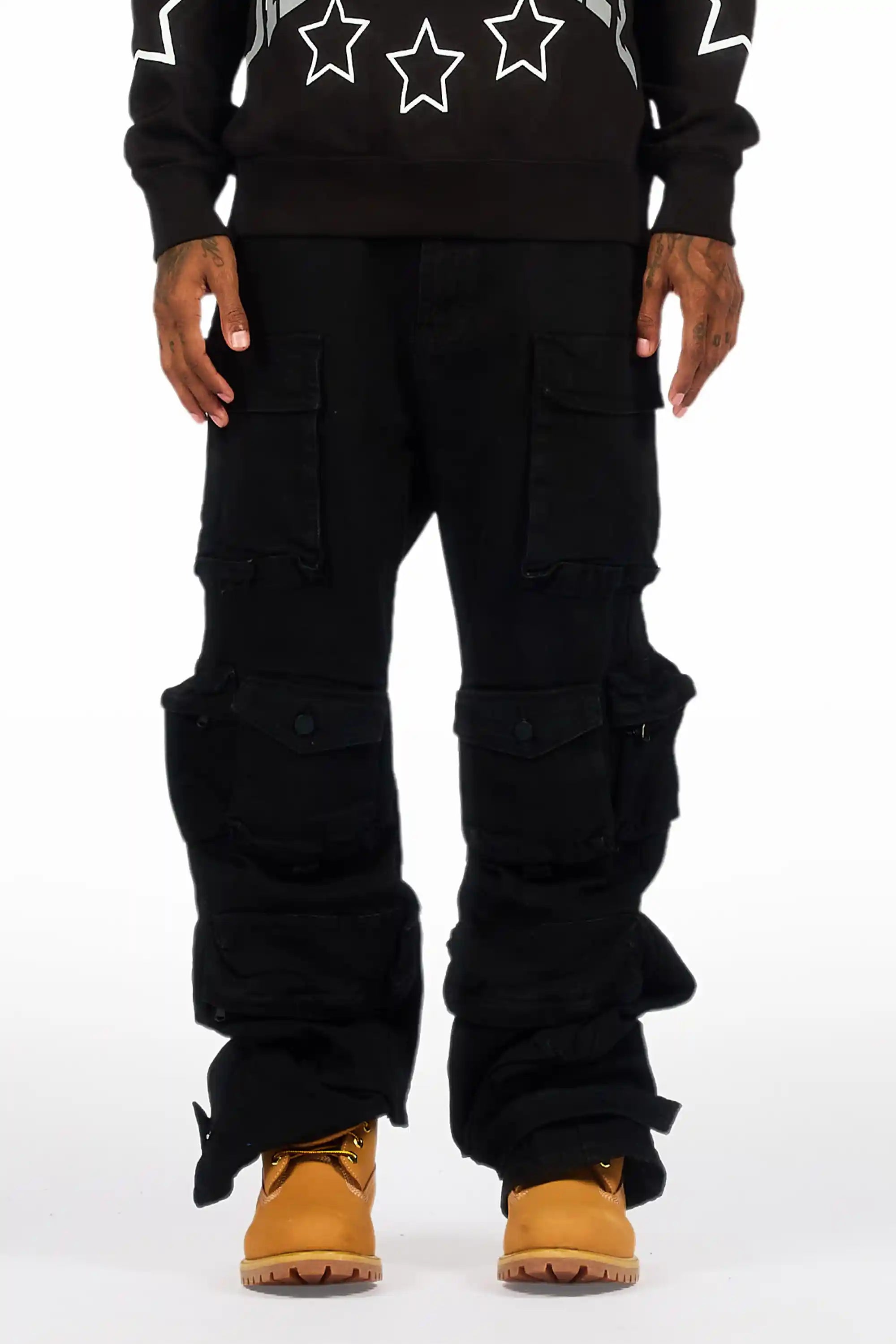 An urban baggy stack cargo jean for men in black. Designed with organic cotton and extra long legs for an essential streetwear style.