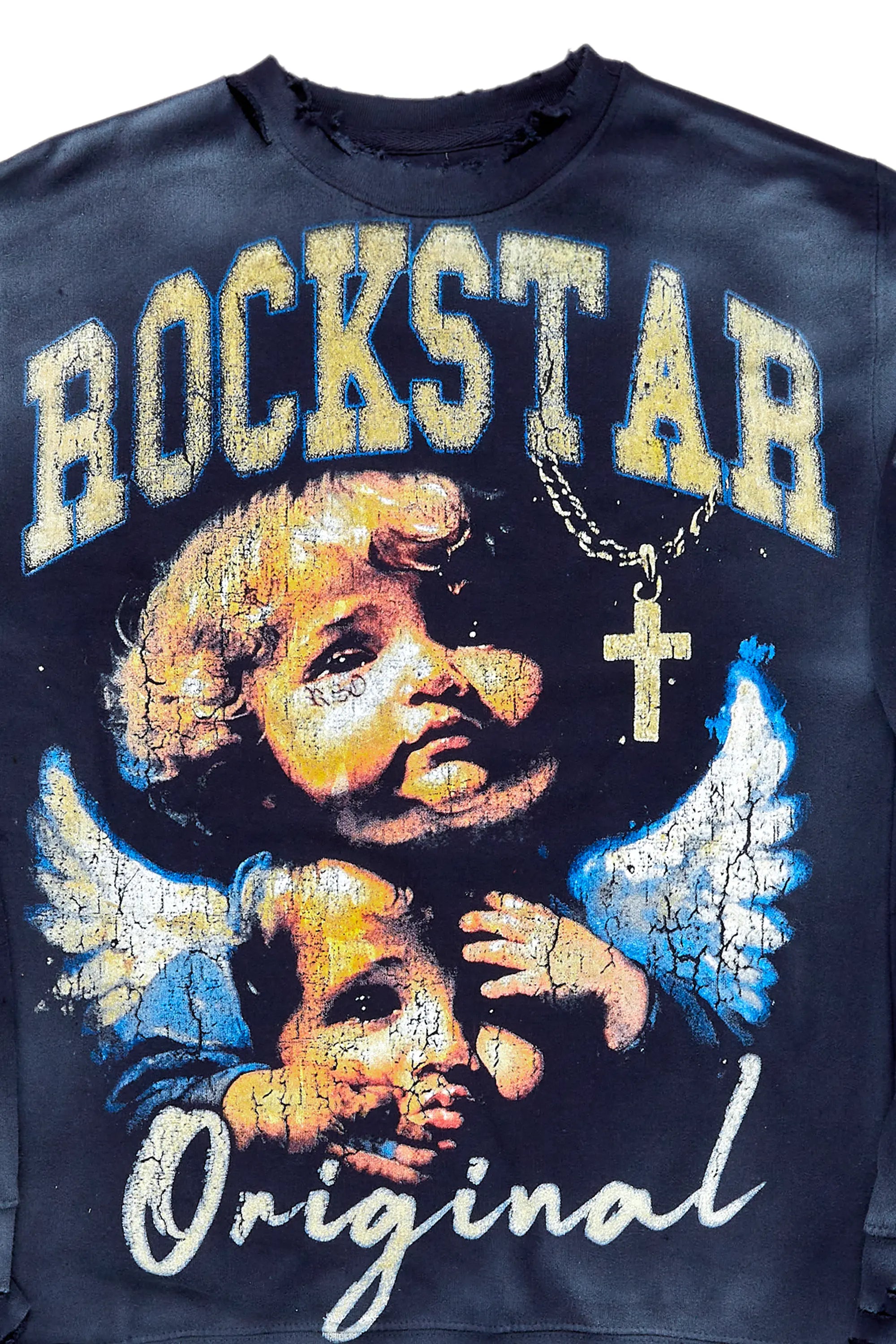 An urban streetwear crewneck sweatshirt for men in navy. Designed with organic cotton and custom detailing for a dope everyday style.